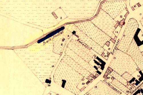 În fotografia sepia se vede o bordura lată cu scări de lemn, care înconjura marginea bazinul. Aceeași bordură cu scări apare și în fotografia cu turnul de sărituri realizată de Theodor Glatz în 1860.