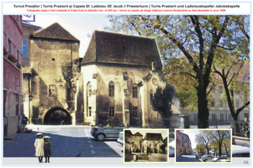 În această fotografie, realizată la sfărșitul sec. al XIX-lea (ante 1898) și atribuită de Emil Sigerus fotografului Fr. Auner, se vede Turnul Preoților / Turris Praetorii (Turnului Comitelui) // Priesterturm și Capela Sf. Ladislau // Ladislauskapelle (anterior cunoscută sub denumirea Sf. Iacob // Jakobskapelle) din Piața Huet.