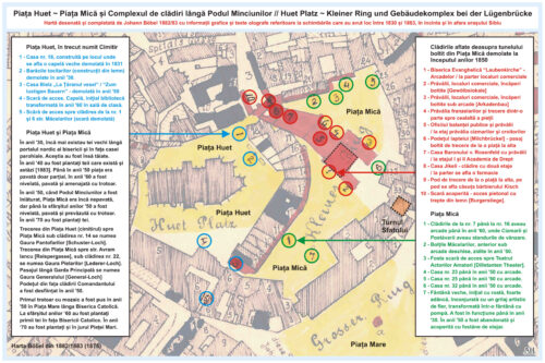 „Schimbările care au avut loc între 1830 și 1883, în incinta și în afara orașului. Demolarea porților, turnurilor și bastioanelor care făceau parte din sistemul de fortificație, cât și zidurile de centură dărâmate. Demolarea Podului Minciunii și altor construcții, clădiri, precum și alei, drumuri și străzi desființate, dar și cele noi amenajate etc. adunate și desenate în hartă de Johann Böbel 1882.“Clădirile mari existente pe Podul Minciunilor