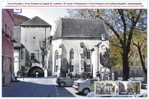 Această fotografie realizată de celebrul pictor sibian Carl Dörschlag în 1895, arată Turnul Preoților / Turris Praetorii ( Turnul Comitelui ) // Priesterturm și Capela Sf. Ladislau // Ladislauskapelle, de asemenea, numită și Capela Sf. Iacob // Jakobskapelle, din Piața Huet. Capela, menționată în 1468 sub numele de Sf. Iacob, a fost construită la începutul secolului al XV-lea.