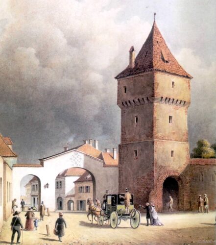 Dreapta: Poarta Sag/ Turnului, vedere din exterior // Das Sagtor, Aussenansicht – pictură de Johann Böbel (1858).~~~o~~~