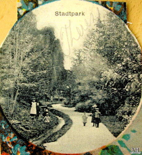 Această frumoasă carte poștală ilustrată, tip LEVELEZÖ-LAP, a fost tipătită la tipografia sibiană Josef Drotleff la începutul secolului al XX-lea. Cartea poștală din colecția privată Wolff este etichetată pe față cu textul, „Restaurant Stadtpark – Hermannstadt”. Pe verso se află textul scris cu creionul, „Herrn Dr. C. H. Wolf – Reichsratabgeordneter – Wien.”, care ne informează că această carte poștală a fost adresată domnului Dr. C. H. Wolf, deputat în Consiliul Imperial din Viena.