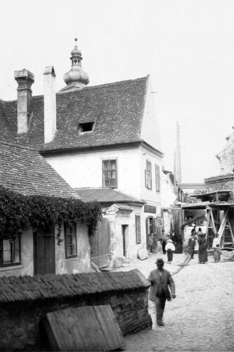 Două fotografii alb-negru realizate la începutul anilor 1930. În fotografia din partea stângă se vede Casa cu lei de la nr. 18 privită dinspre str. Centumvirilor // Hundsrücken. În fotografia din partea dreaptă se vede vechea stradă Pempflingergasse înainte de demolarea complexului de clădiri Groapa cu lei.