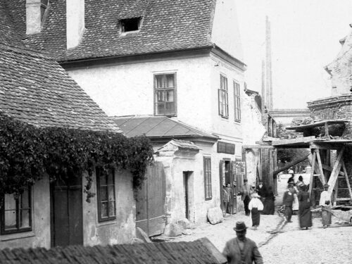 Instantaneu realizat în jurul anului 1885 pe strada Mitropoliei // Fleischergasse // Mészáros utca în Sibiu. În fundal se vede clădirea cunoscută sub denumirea de Casa Thomas Gulden și casa cu trecerea boltită prin care se ajungea în Piața Mare, dar și în pasajul care lega strada Mitropoliei de Piața Huet pe sub Turnul Preoților.