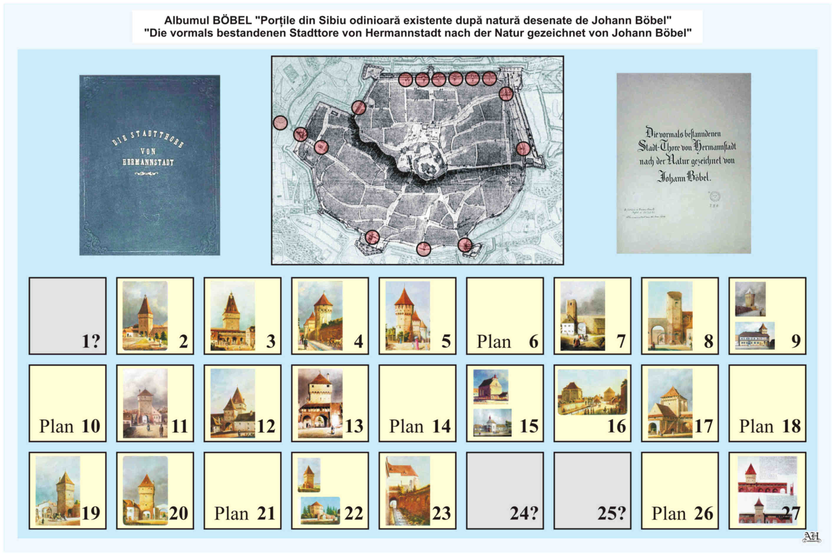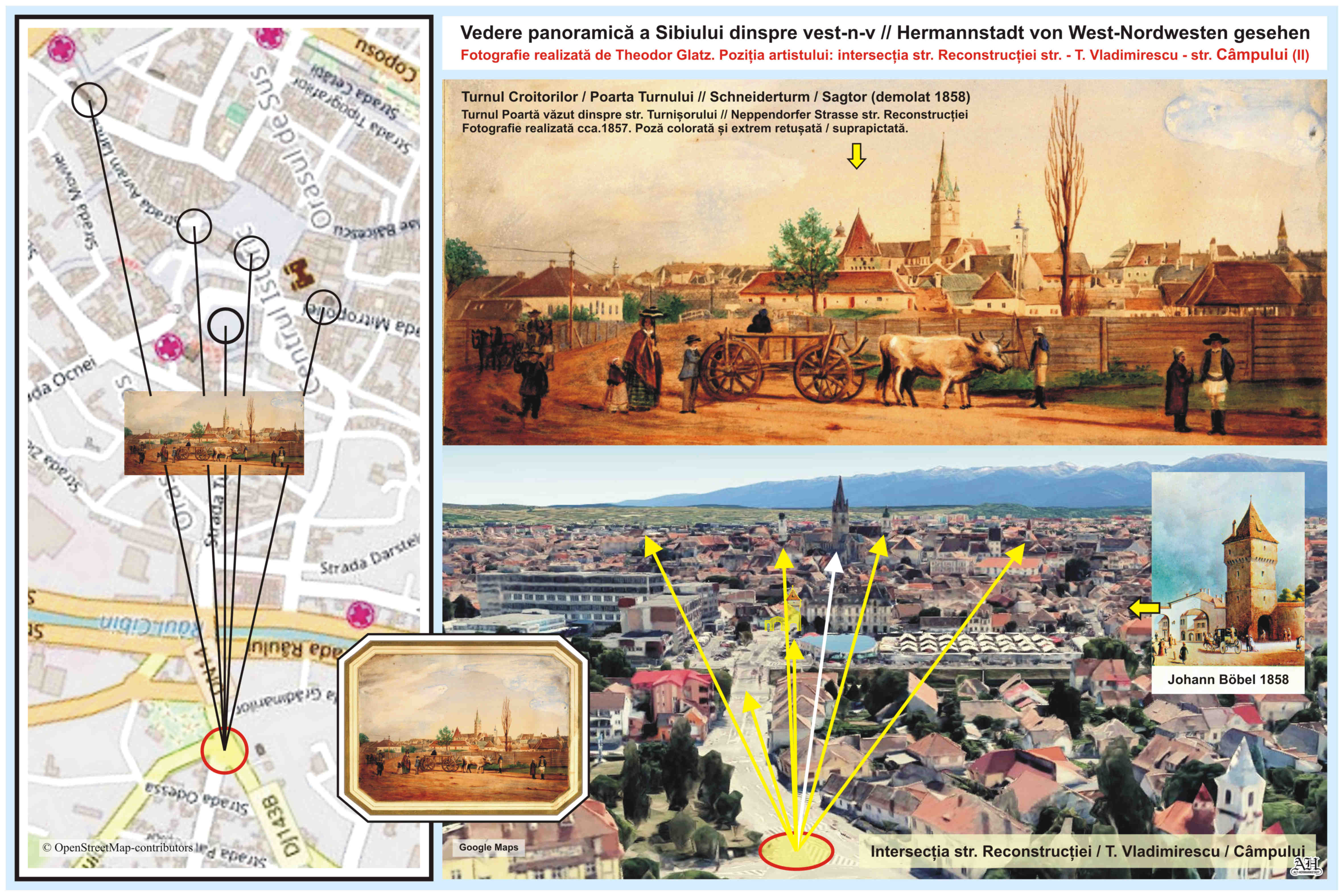 Colaj realizat cu ajutorul ilustrațiilor și fotografiilor din arhiva grupului Alt-Hermannstadt și planul orașului Sibiu din 1875, copiat și completat cu texte olografice de Johann Böbel în 1882/1883. În partea stânga-sus a colajului se vede fotografia realizată de Theodor Glatz ante 1858, cod de inventar GD 18238, iar în partea stânga-jos se află instantaneul cu numărul de inventar GD 18235 realizată în jurul anului 1860 și xilogravura din cartea jurnalistului Charles Boner „Transilvania – produsele şi poporul său” apărută la Londra în anul 1865.