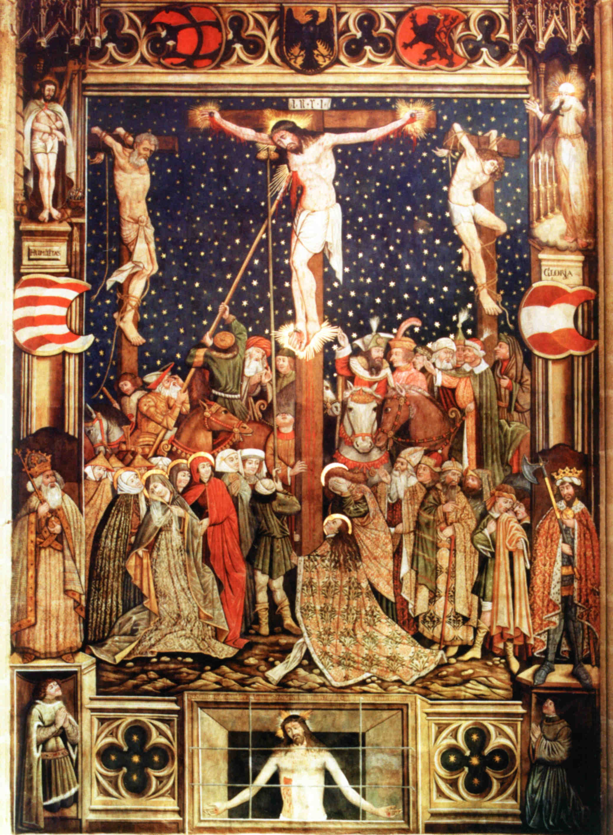 Grupul statuar „Isus pe cruce” din capela „Sfânta Cruce” a fost realizat în 1417 dintr-un singur bloc de piatră de sculptorul austriac Petrus Lantregen (Peter Landregen) pentru mănăstirea şi biserica Dominicană aflată în fața Porții Elizabeta // Elisabethtor / Porții Gușteriței. La picioarele răstignitului Isus se află Sfînta Fecioară Maria și Sfîntul Apostol Ioan.