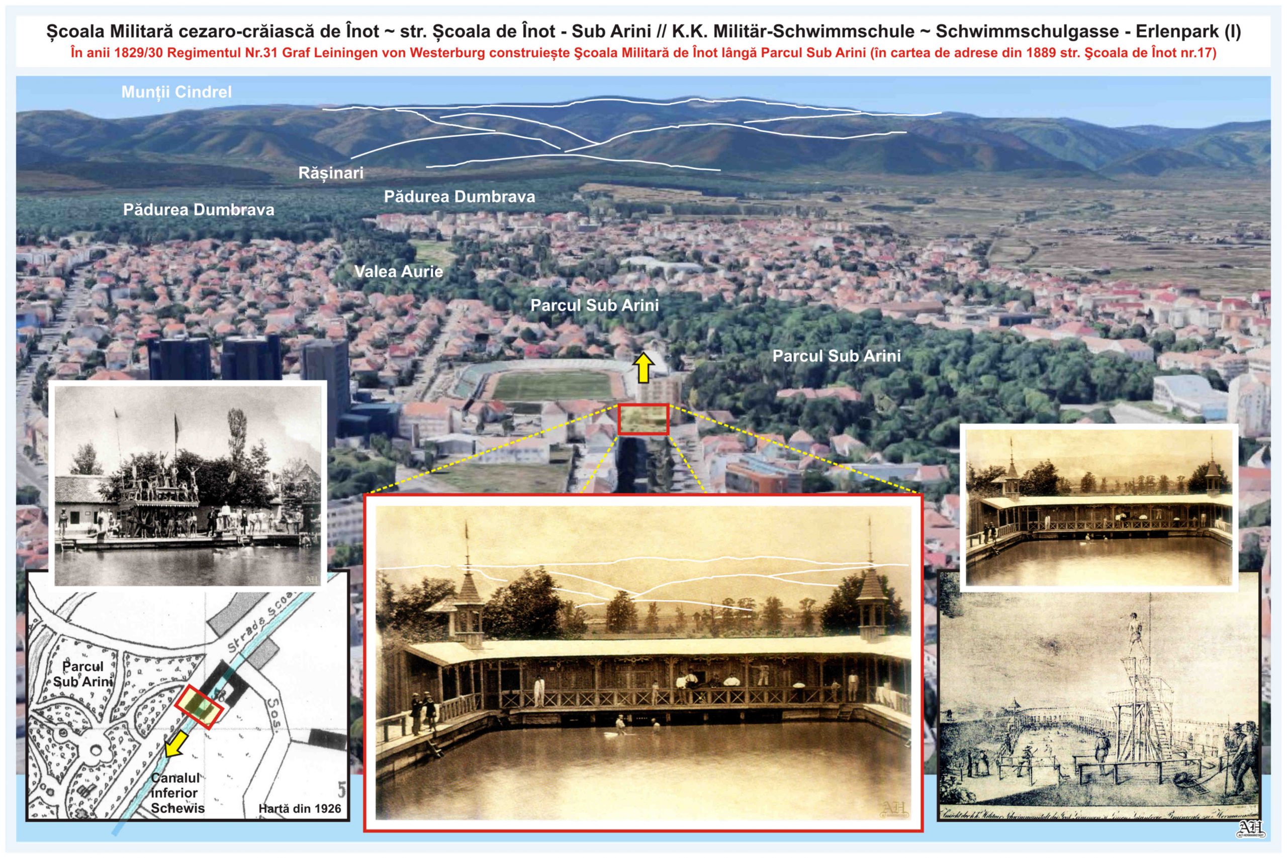 „În anul 1830 Regimentul Nr.31 Graf Leiningen von Westerburg construiește Şcoala Militară cezaro-crăiască de Înot. Până la sfârșitul anilor 1830 canalul (pârâul școlii de înot) era încă descoperit și prevăzut doar cu un pod de lemn (vezi harta). // „Im Jahre 1830 ist die Schwimm Schule gebaut worden, von unserem Haus Regiment N.31 Graf Leiningen von Westerburg. Bis gegen Ende der 30siger Jahre war der Canal noch offen, (Schwimmschul Bach) mit einer Holz Brücke darüber (siehe Plan).“Există o fotografie și o ilustrație realizată în secolul al XIX-lea în care apare un bazin de înot înconjurat pe trei laturi de cabine de schimb. Această fotografie și ilustrație arată bazinul de înot și cabinele de schimb de la Şcoala Militară cezaro-crăiască de Înot // K.K. Militär-Schwimmschule din Sub Arin privite dinspre latura nord-estica a piscinei.