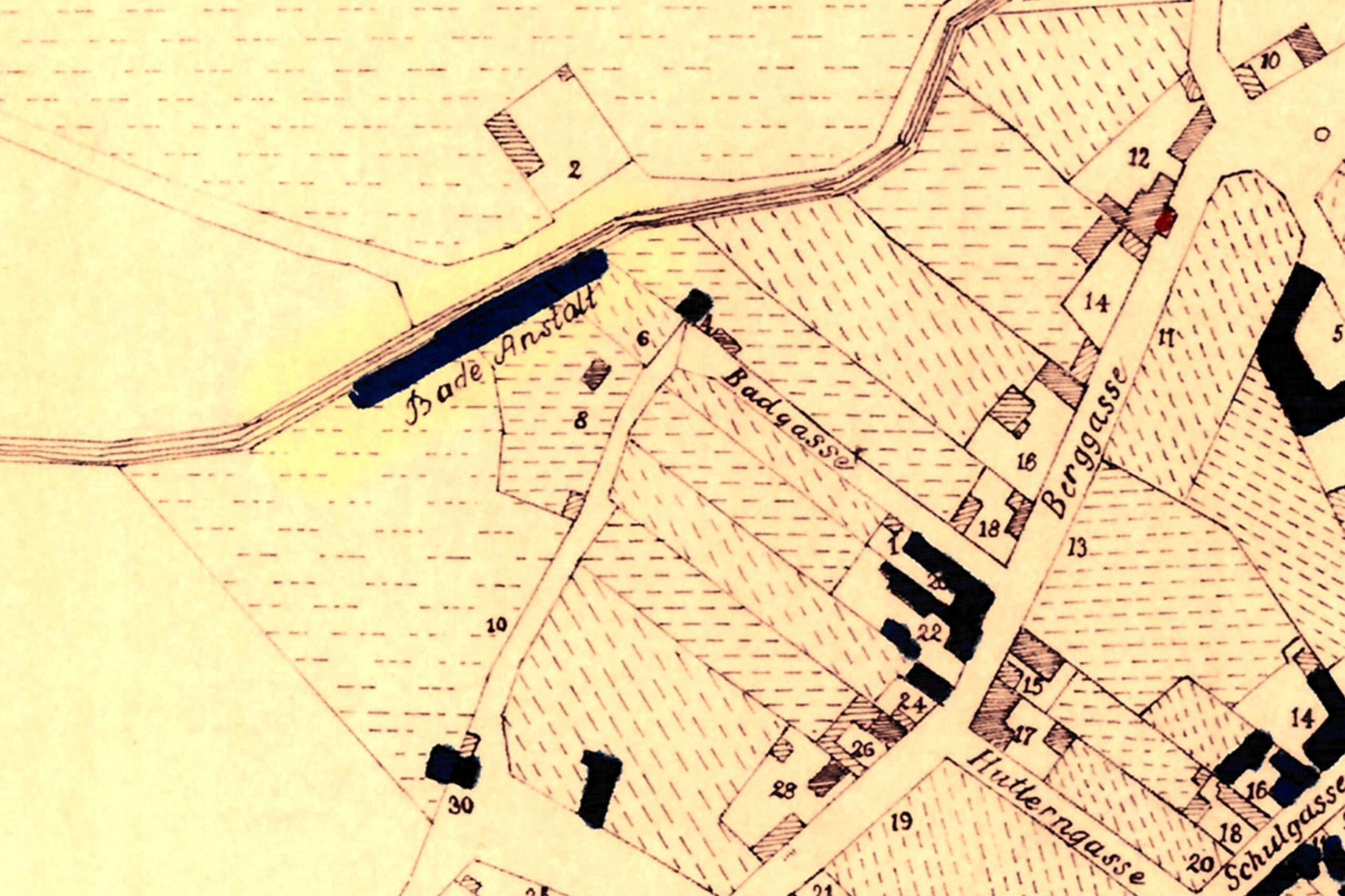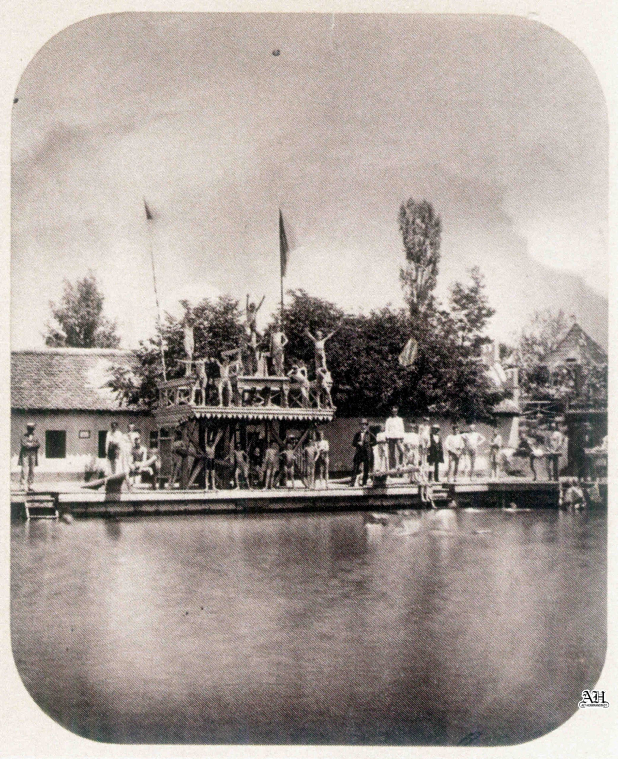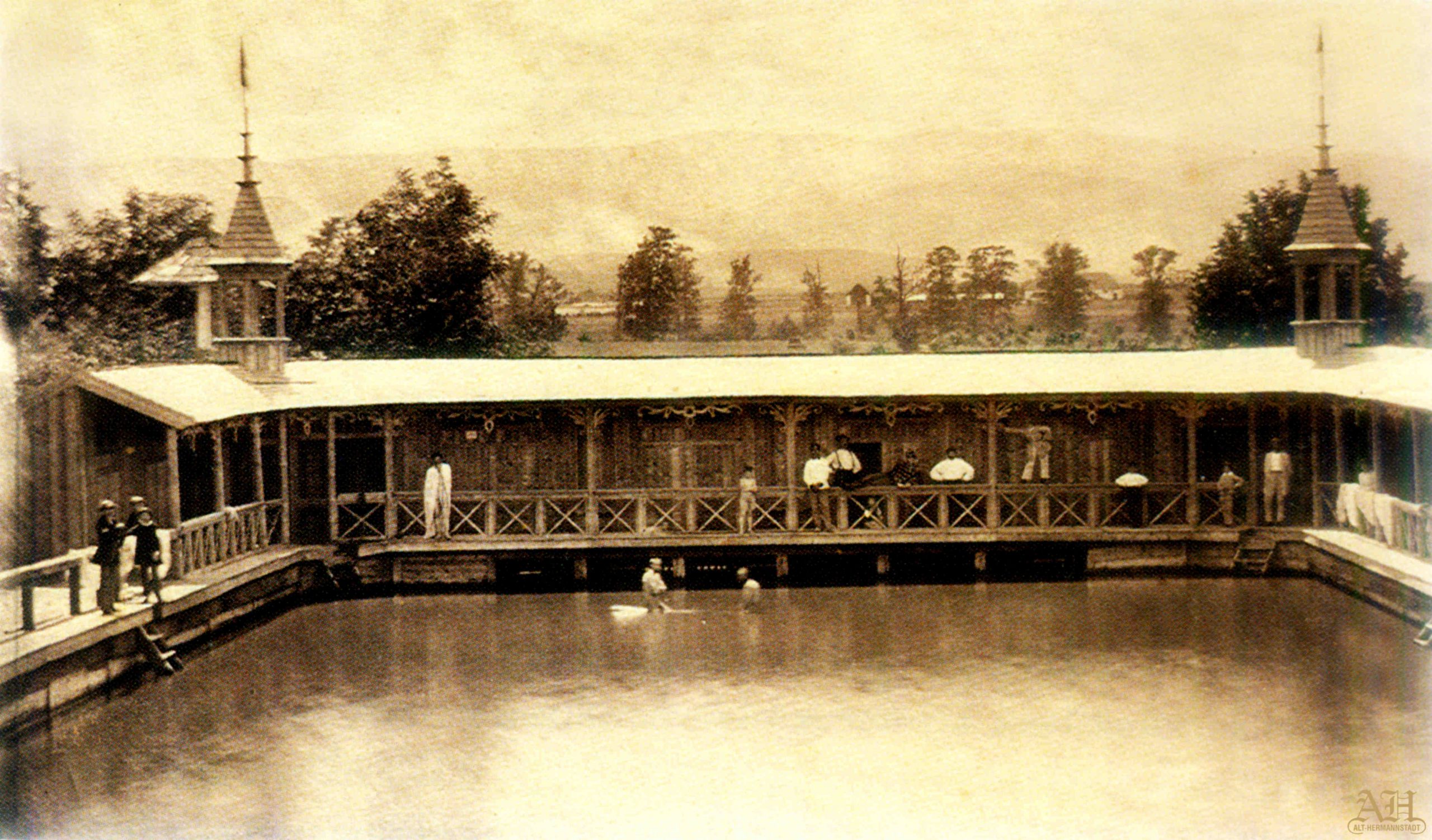 În fotografia sepia se vede o bordura lată cu scări de lemn, care înconjura marginea bazinul. Aceeași bordură cu scări apare și în fotografia cu turnul de sărituri realizată de Theodor Glatz în 1860.