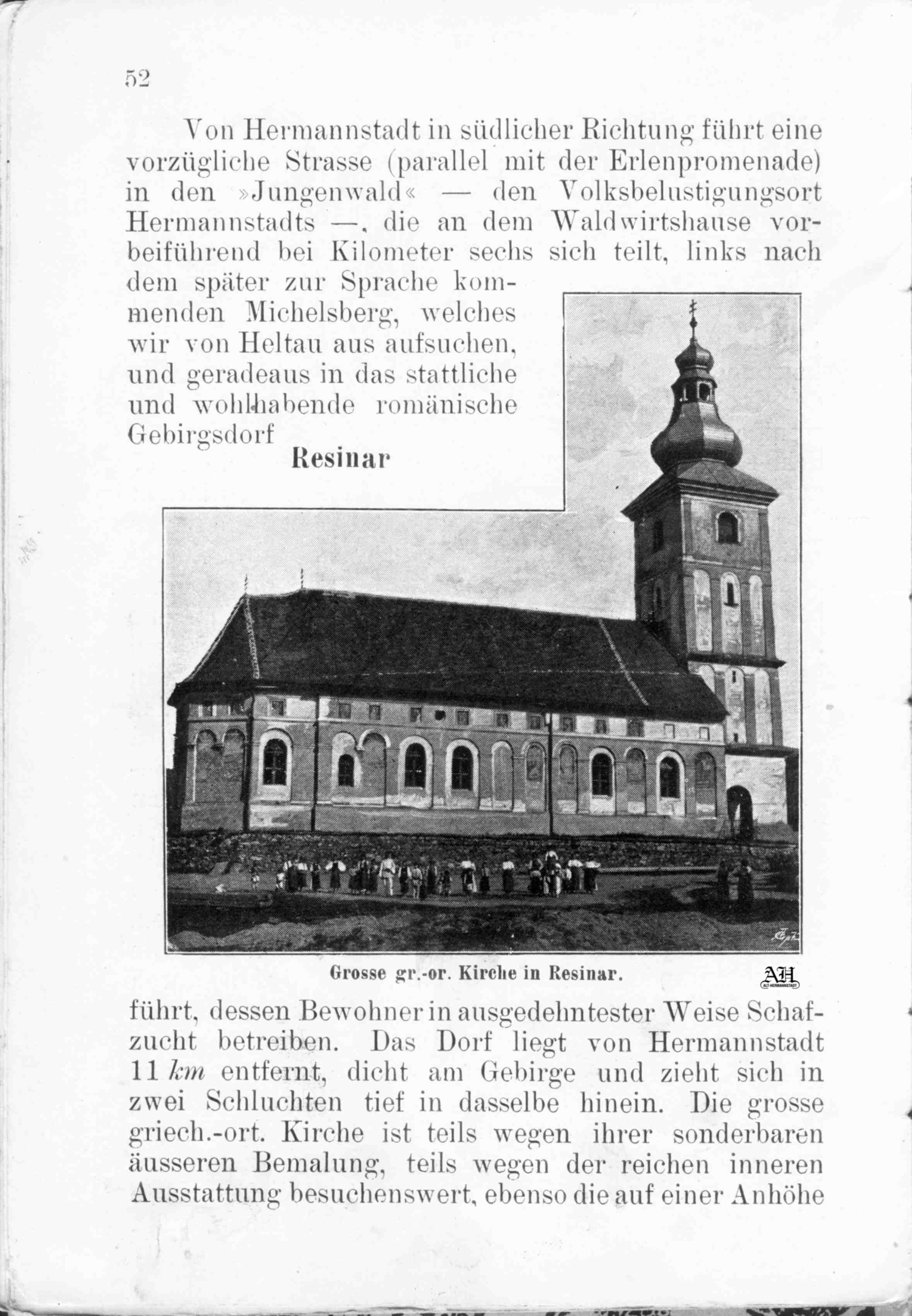 „… „trecând pe lângă Hanul din Dumbrava se ajunge la km 6, la bifurcația drumului de unde se poate merge la Cisnădioara, dar mergând drept înainte se ajunge în satul românesc de munte „Resinar“. Sat arătos/impozant și înstărit, cu locuitori care se ocupă mai ales cu oieritul. „Resinar“ se află la distanță de 11 km de Sibiu și se întinde de-a lungul a două văi „până adânc în munte“. Marea biserică greco-ortodoxă este renumită pentru picturile neobijnuite de pe fațada exterioară cât și pentru interiorul ei bogat (biserica veche). La fel merită vizitată și biserica construită pe un deal de unde se poate admiră întregul sat. Lângă această biserică se află capela/cripta metropolitului decedat 1873, baronul A. Schaguna… „persoană care a adus o mare contribuție la dezvoltarea cultural-politică a poporului român“! -