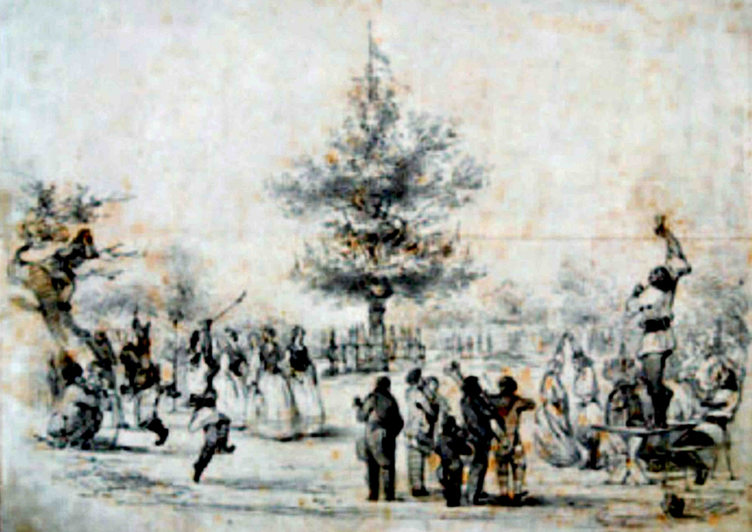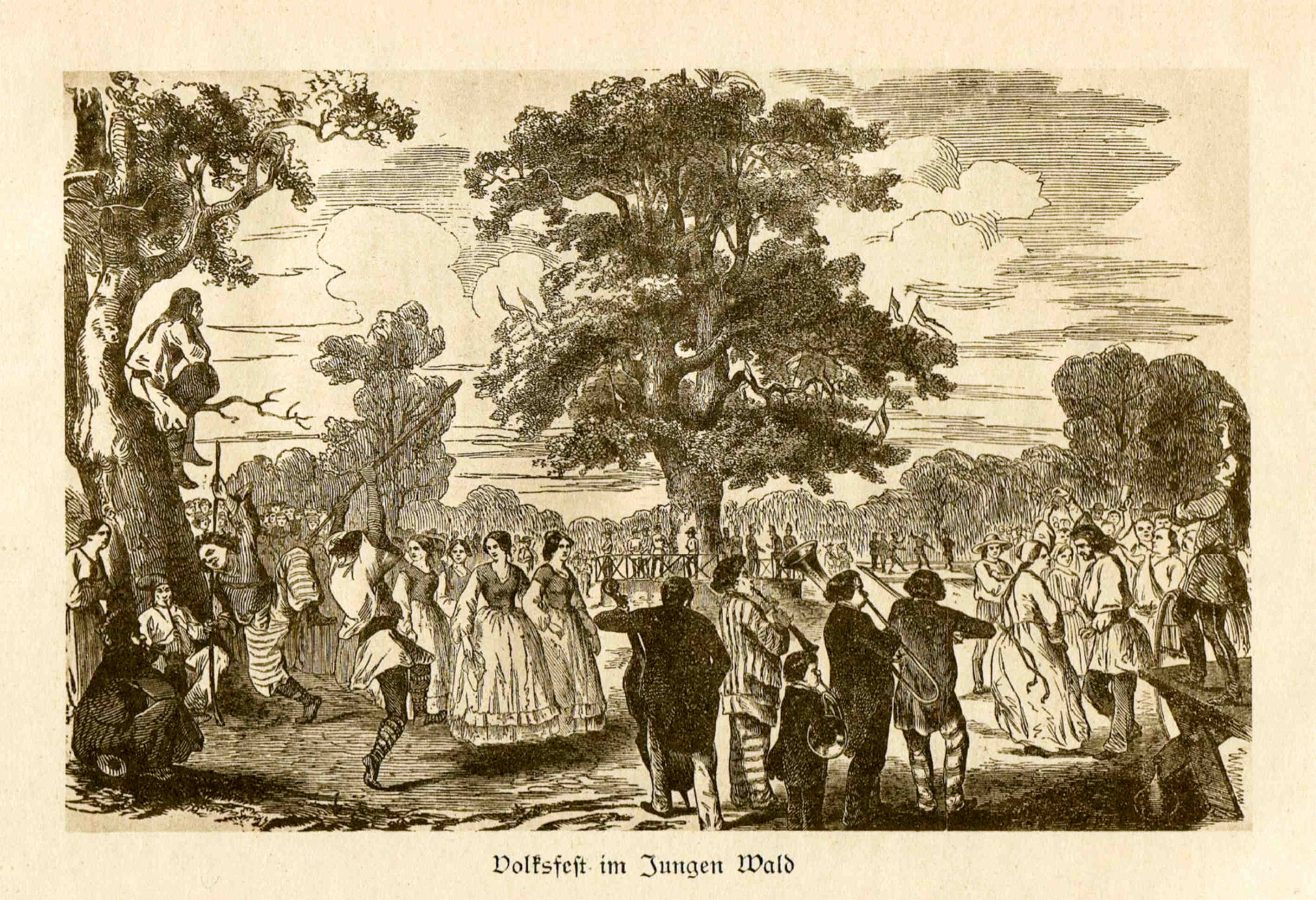 Ilustrație după o xilogravură apărută în anul 1853 în publicația „Benigni’s Volkskalender“, editată de sibianul Theodor Steinhausen, în care este ilustrată Petrecere populară dată în cinstea împăratului Franz Josef I la data de 25 iulie 1852 în Pădurea Dumbrava. Festivitatea a avut loc pe un luminiș lângă un stejar care va intra în istorie sub denumirea de Stejarul Împăratului. Timp de 29 de ani va purta numele monarhului austriac Franz Josef I pînă în anul 1881, an în care a căzut pradă unui incendiu. Această gravură a fost realizată după un desen al unui artist sibian, pictorul și fotograful Gustav Albert Schivert (1826 – 1881).