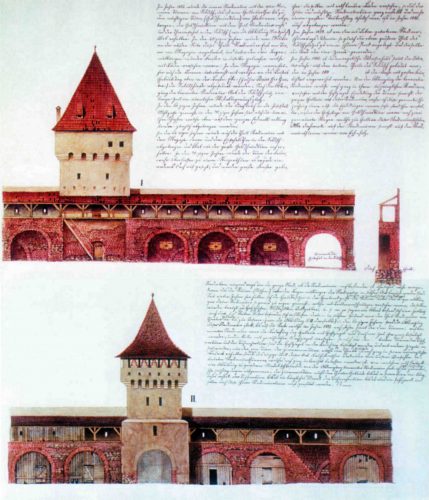 Dreapta: Poarta Sag/ Turnului, vedere din exterior // Das Sagtor, Aussenansicht – pictură de Johann Böbel (1858).~~~o~~~