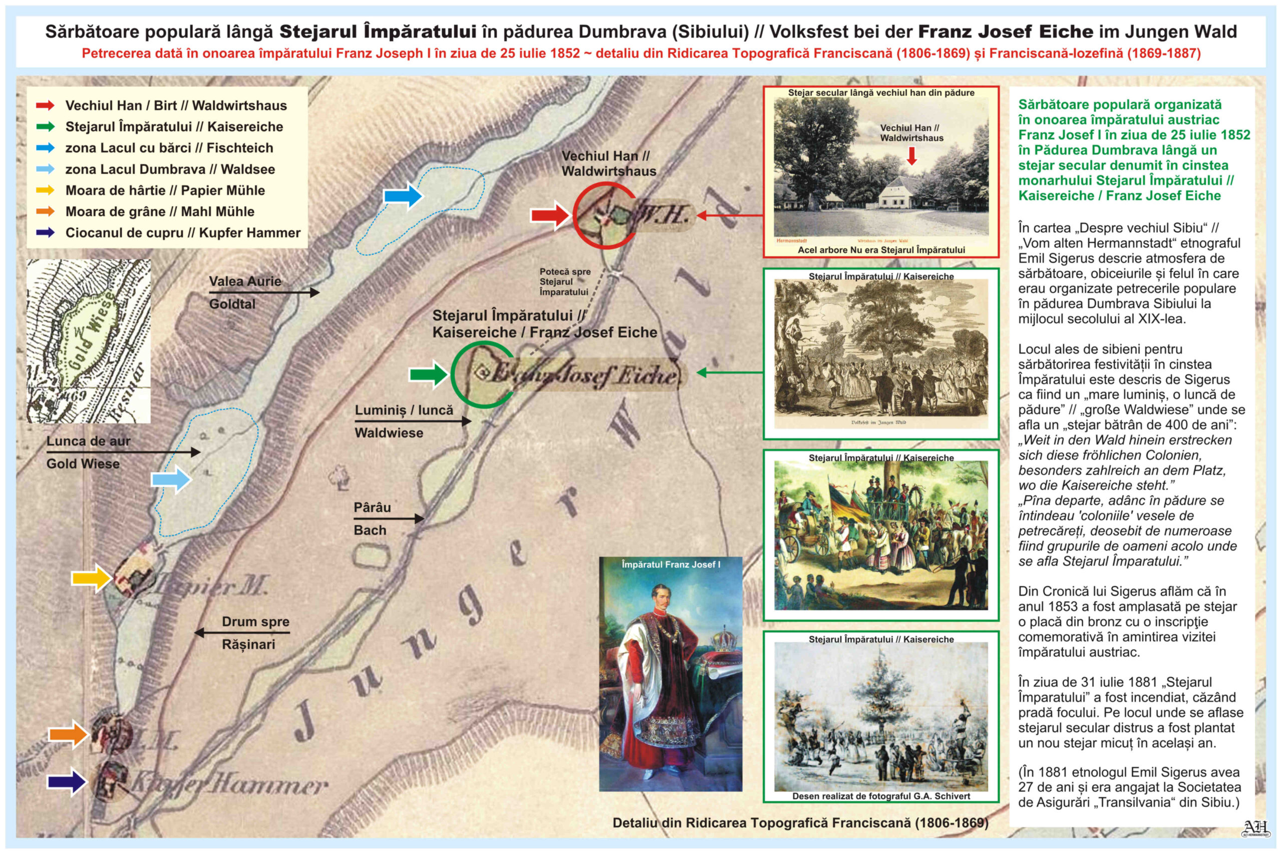 În harta Ridicarea Topografica Franciscana este marcat locul unde se afla stejarul care purta numele Împăratului austriac Franz Josef I. Locul este însemnat cu un pătrat, lângă care scrie: Franz Josef Eiche // Stejarul Franz Josef. Stejarul se afla sud/vestic de vechiul Han, – „Wald Haus” W.H. – pe un „luminis mare”, traversat de un fir de apa, un pârâiaș care izvora din canalu Seviș, curgea prin pădurea Dumbrava, pe lângă vechiul Han, prin Cimitirul orașului și Valea Săpunului spre est, unde se vărsa în Cibin.În anul 1881 etnograful Emil Sigerus avea 27 de ani și era angajat la Societatea de Asigurări „Transilvania” din Sibiu. (sursă ilustrații: arhiva Alt-Hermannstadt)