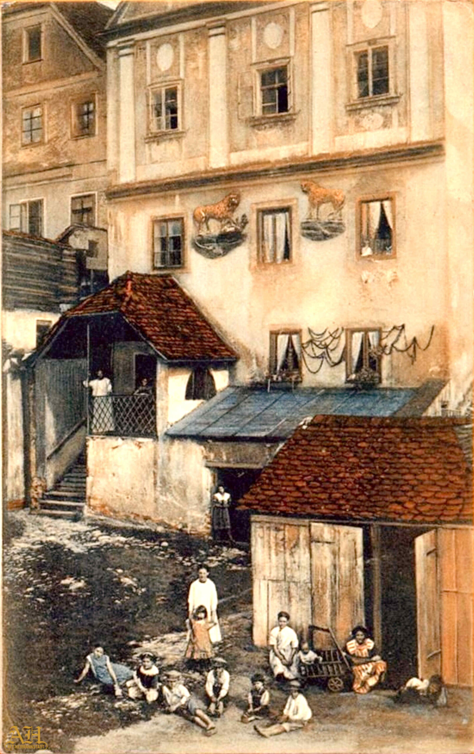Casa cu lei din fostul ansamblu de clădiri Groapa cu lei // Löwengrube str. A.Odobescu nr.18 / Pempflinger Gasse nr.18, demolată 1934. Spre Str. Moș Ion Roată, la etajul 2 al clădirii, se aflau două basoreliefuri pictate reprezentând tema biblică – Proorocul Daniel în Groapa cu lei.