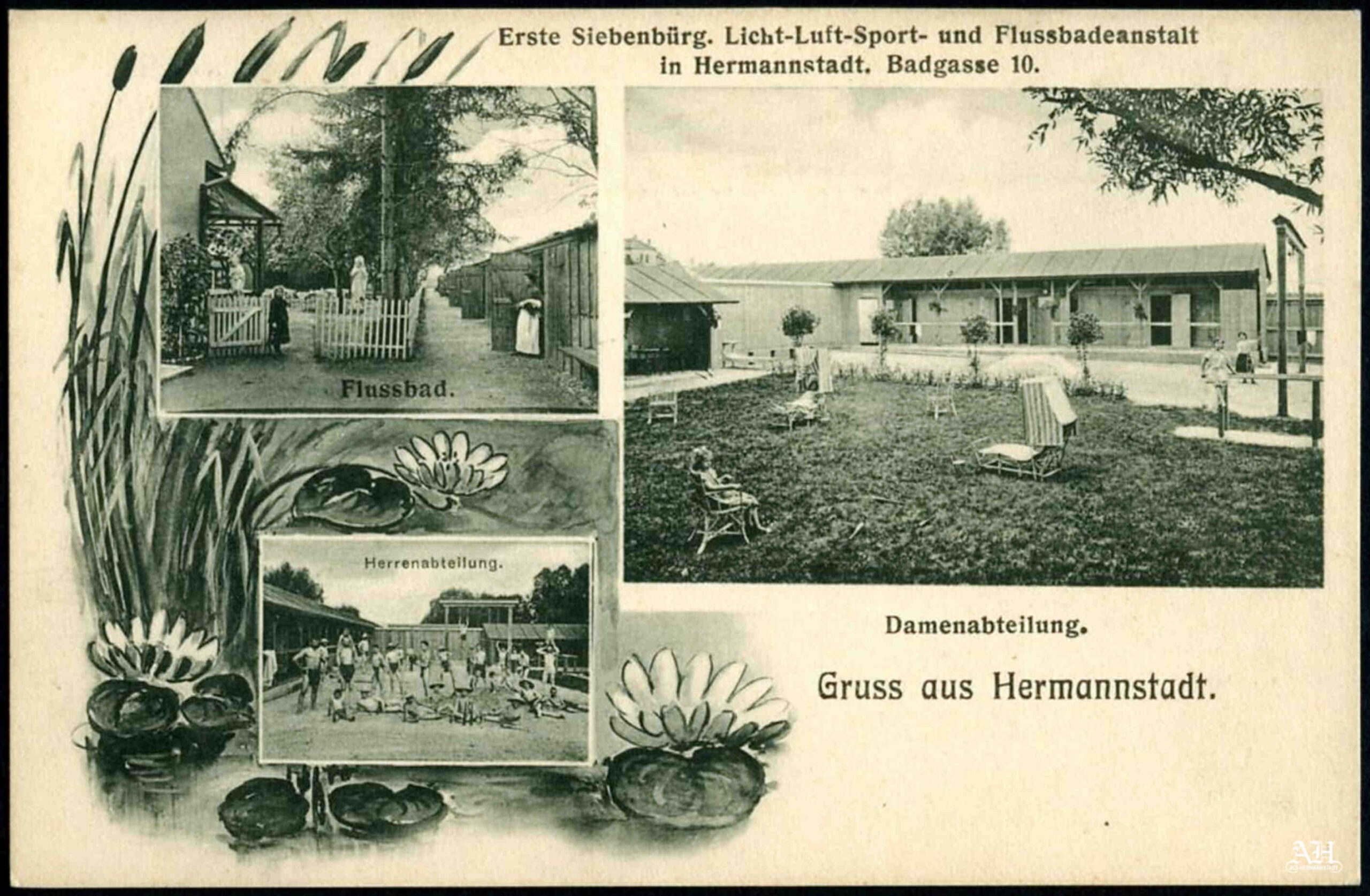 Colaj realizat cu ajutorul fotografiilor din colecția personală și arhiva grupului de Facebook Alt-Hermannstadt.La o privire mai atentă se poate observa că bazinul din poza sepia nu poate fi strandul/ bazinul din Valea Aurie de lângă Moara Schreyer amenajat 1910, deoarece în fundal lipsește pădurea Dumbrava și linia de creastă nu corespunde cu cea a munțiilor din zona Făgarașului.