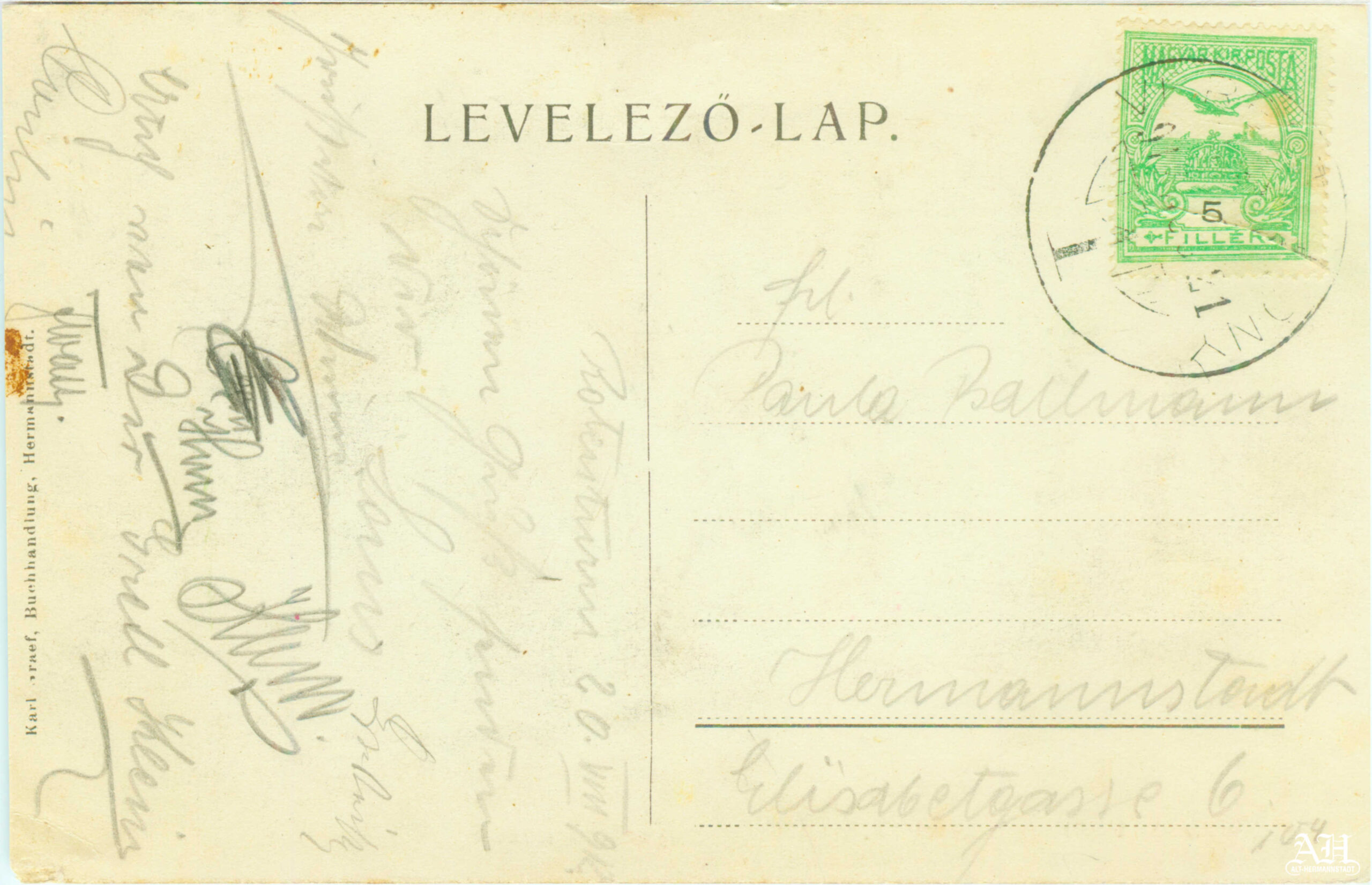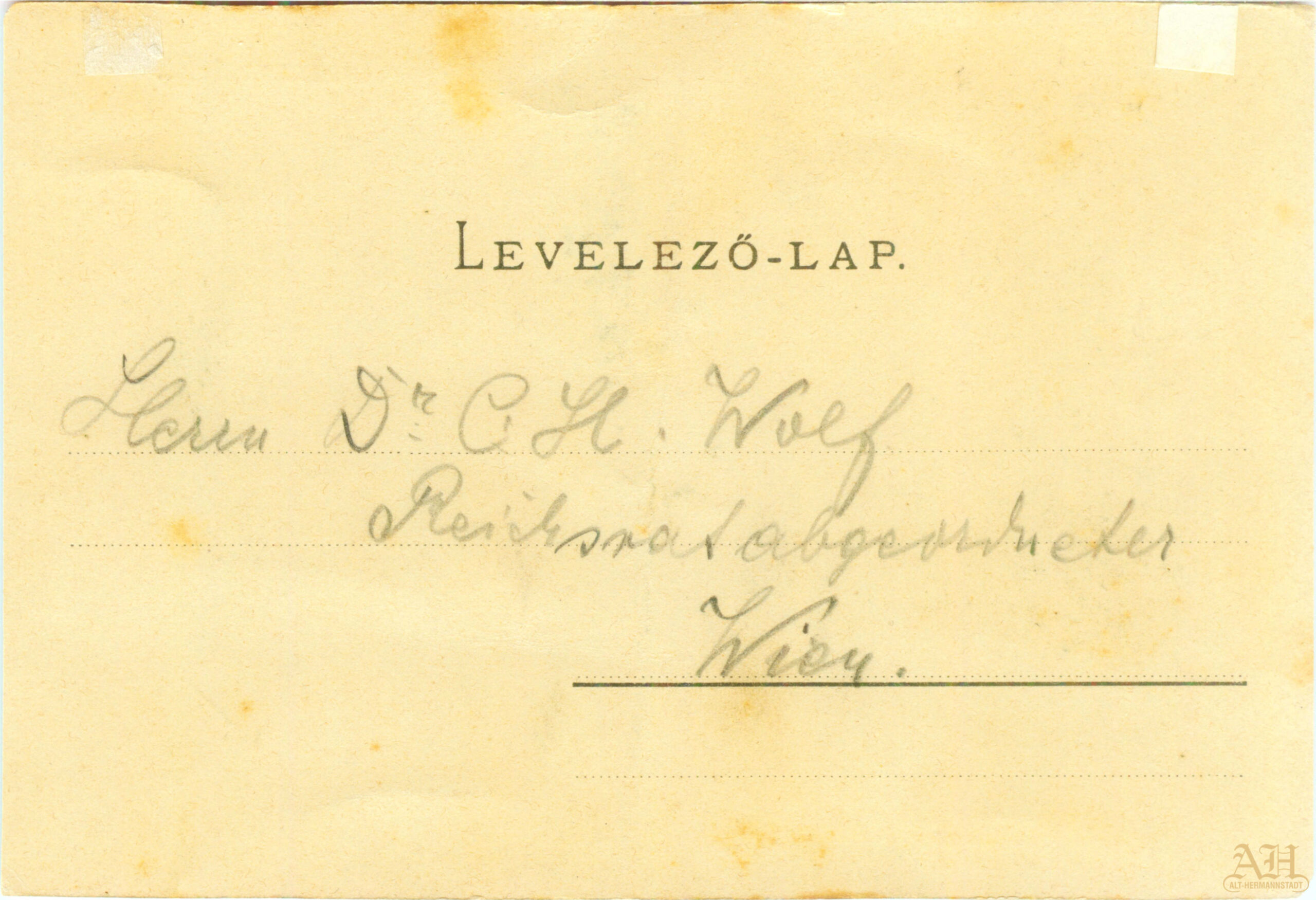 Această frumoasă carte poștală ilustrată, tip LEVELEZÖ-LAP, a fost tipătită la tipografia sibiană Josef Drotleff la începutul secolului al XX-lea. Cartea poștală din colecția privată Wolff este etichetată pe față cu textul, „Restaurant Stadtpark – Hermannstadt”. Pe verso se află textul scris cu creionul, „Herrn Dr. C. H. Wolf – Reichsratabgeordneter – Wien.”, care ne informează că această carte poștală a fost adresată domnului Dr. C. H. Wolf, deputat în Consiliul Imperial din Viena.