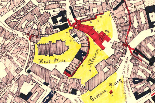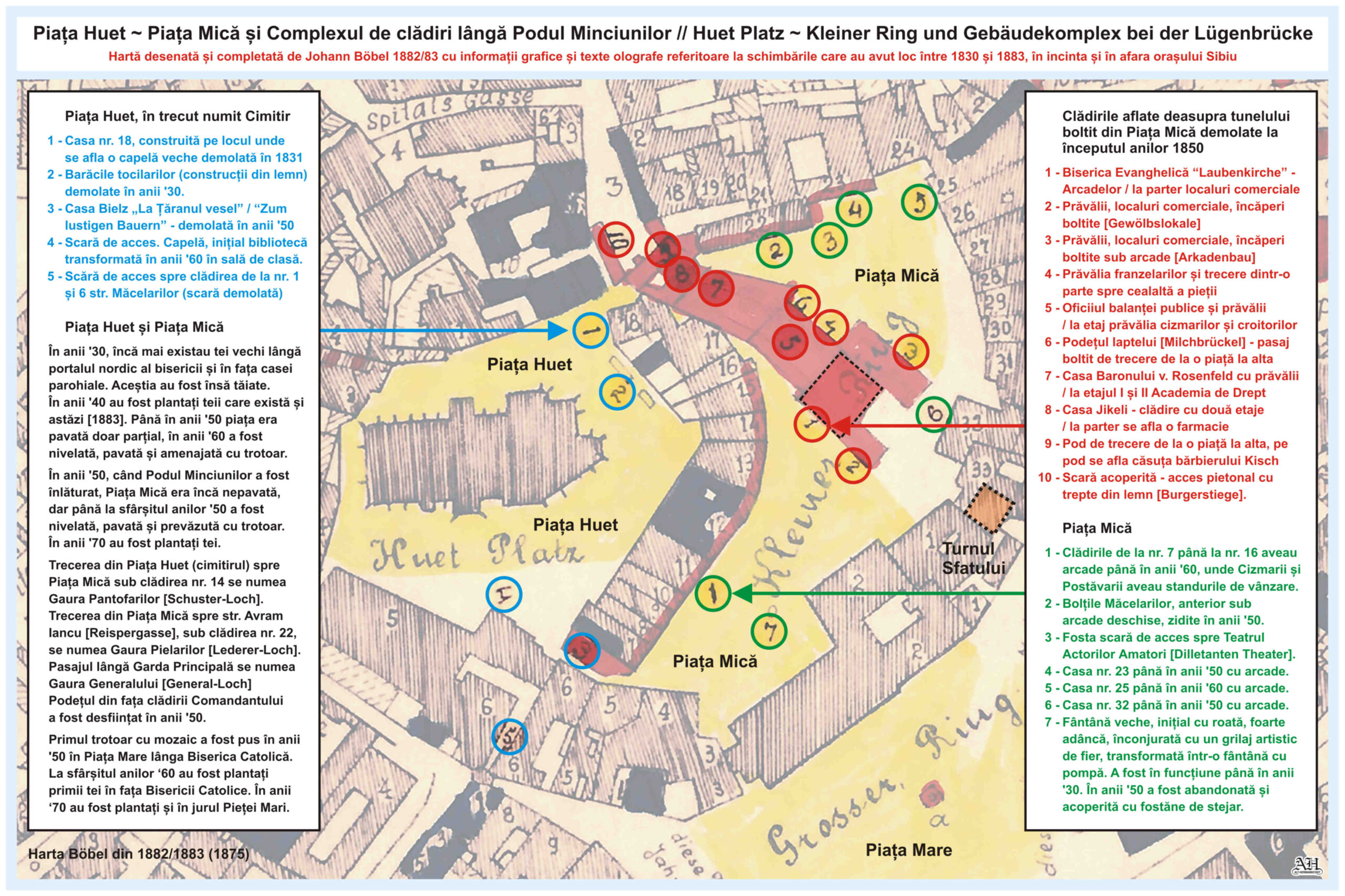 Piața Huet, Piața Mică și Complexul de clădiri lângă Podul Minciunilor descrise de Johann Böbel 1882/83 în harta orașului Sibiu, realizată de după o litografie de Robert Krabs și un desen de F. Dimitrowits din 1875.