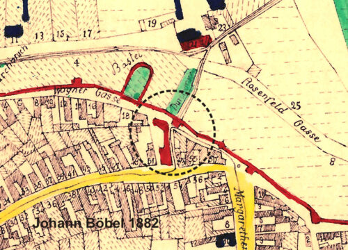 9. Podul de trecere pe care se afla căsuța barbierului Kisch. Sub aceste clădiri, după cum este indicat în plan, se afla un tunel boltit și drumul de acces din Orașul de Jos spre Orașul de Sus.