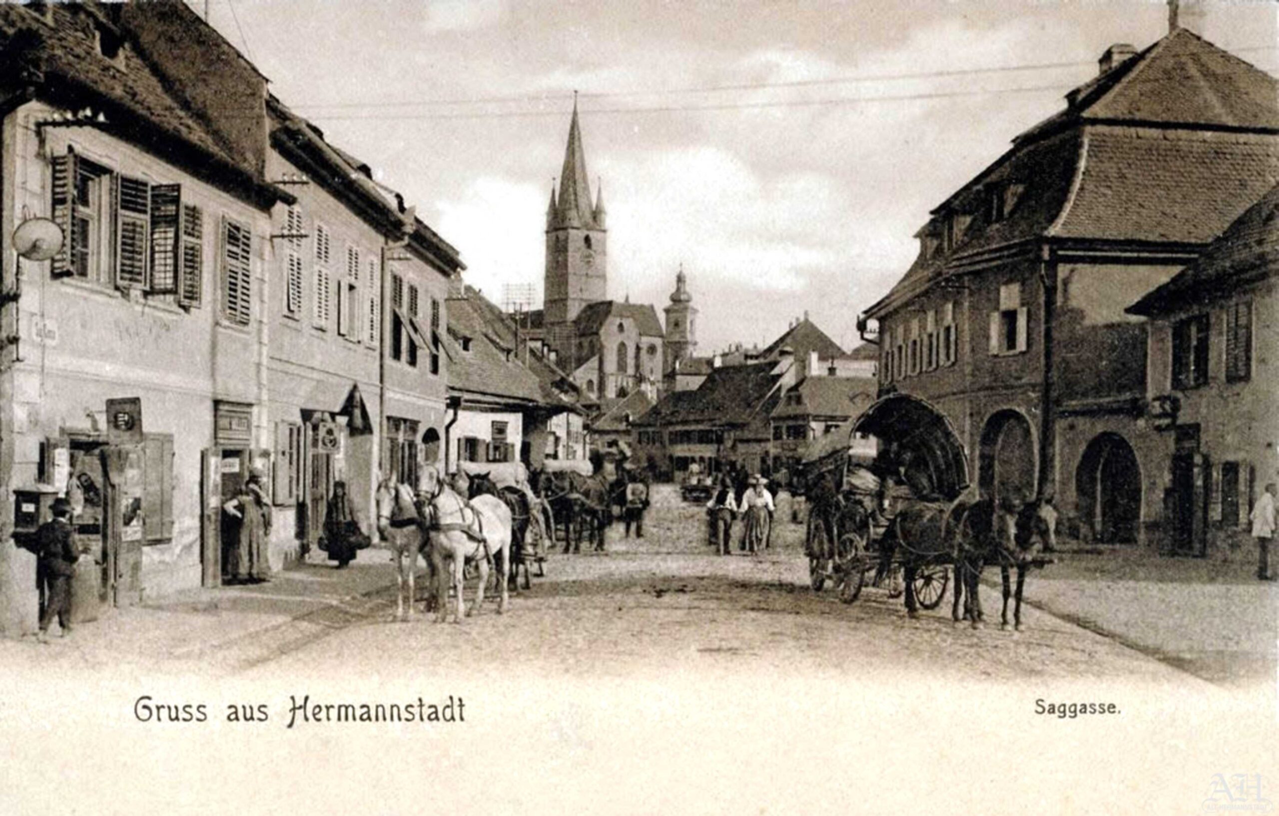 Dreapta: Instantaneu realizat între 1901 și 1904 pe strada Saggasse, care se numește din 1934 strada Turnului. Cartea poștală, inscripționată cu textul „Gruss aus Hermannstad / Saggasse” (Salutări din Sibiu / Saggasse = strada Joagărului = Turnului), a circulat în 1904.~~~o~~~