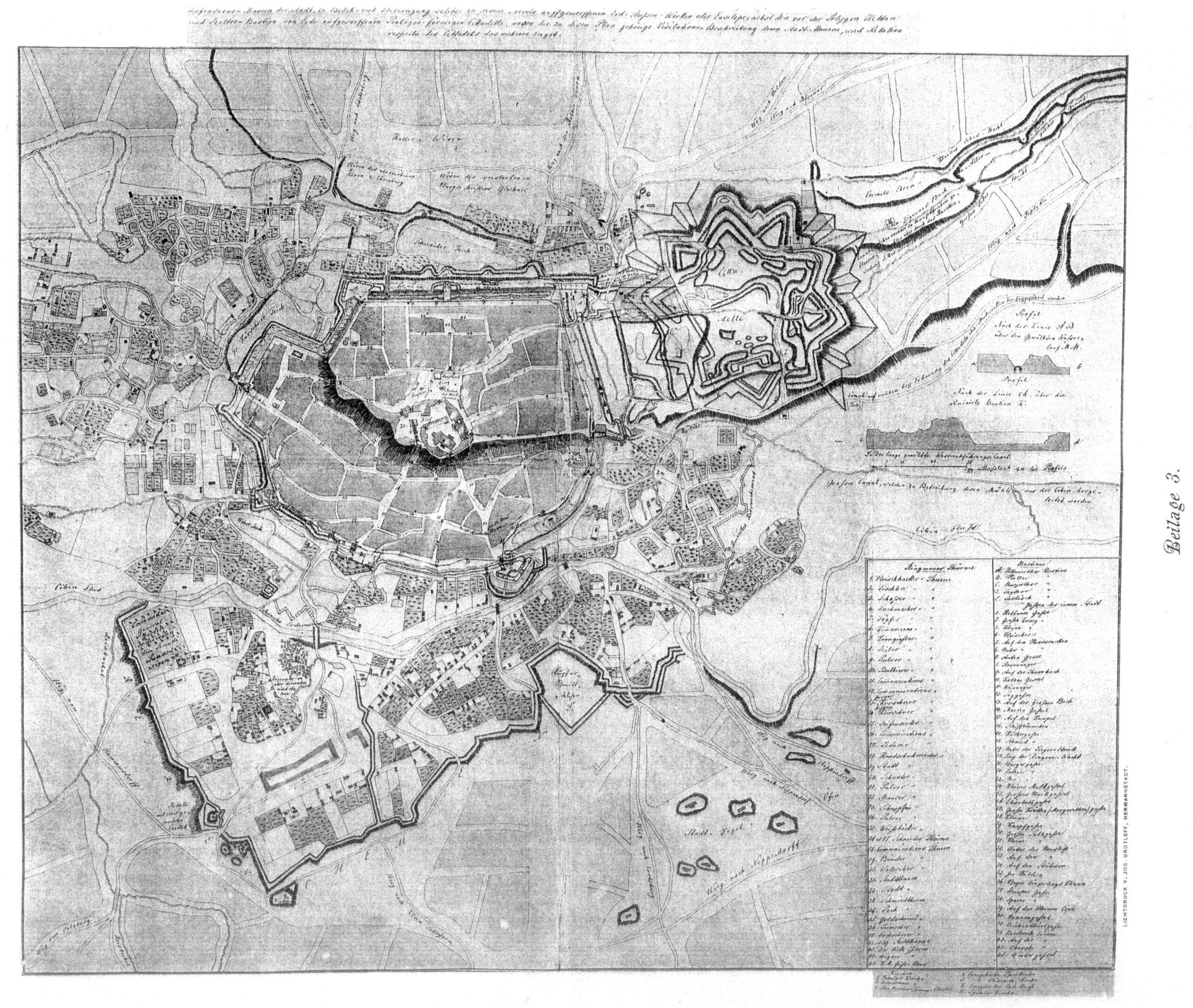 9. Die Überfahrtsbrücke, auf derselben das Häuschen mit der Barbier Stube Kisch. Unter diesen Gebäuden, wie im Plane angegeben ist, bestand ein hochgewölbter Tunnel zur Auffahrt aus der unter Stadt in die ober Stadt.