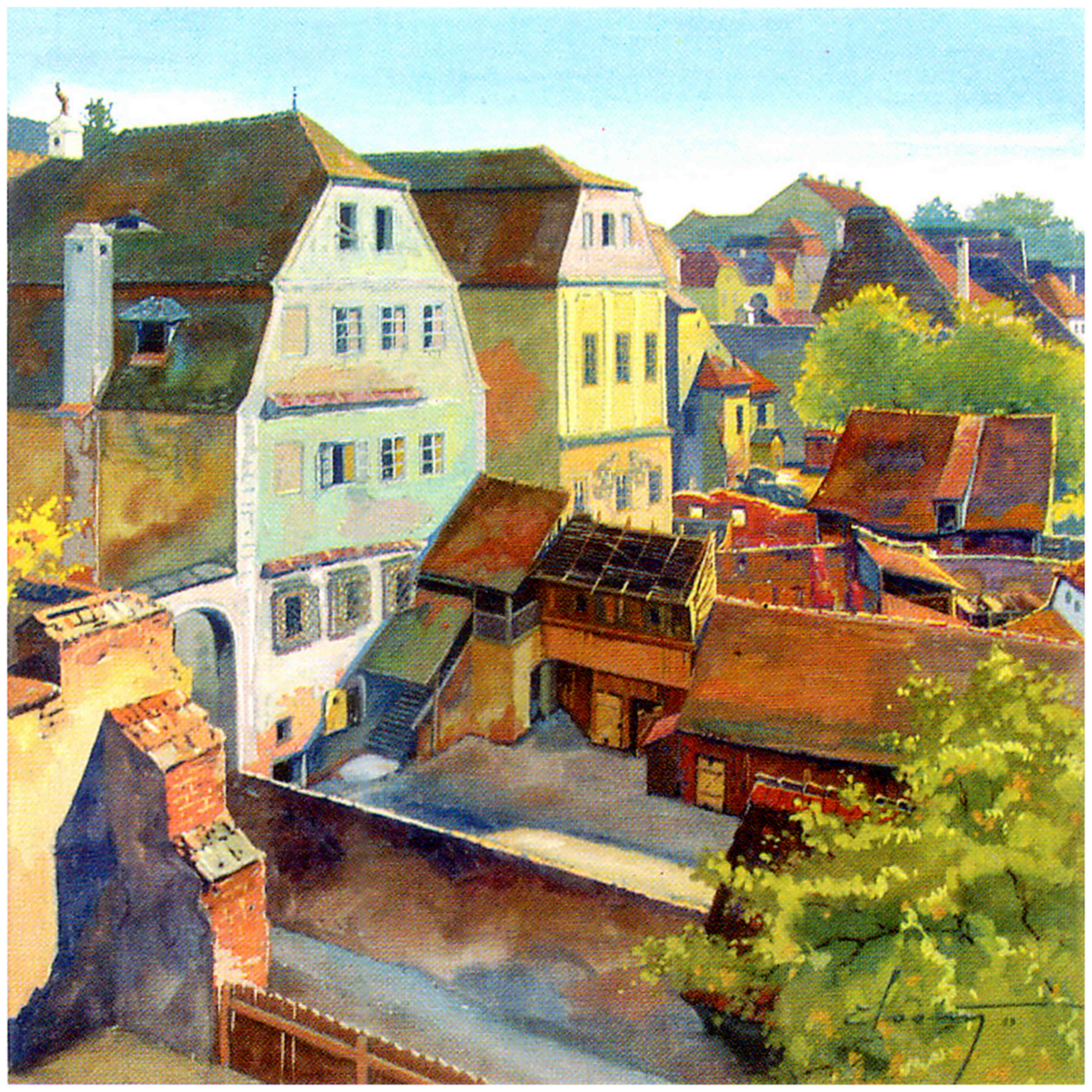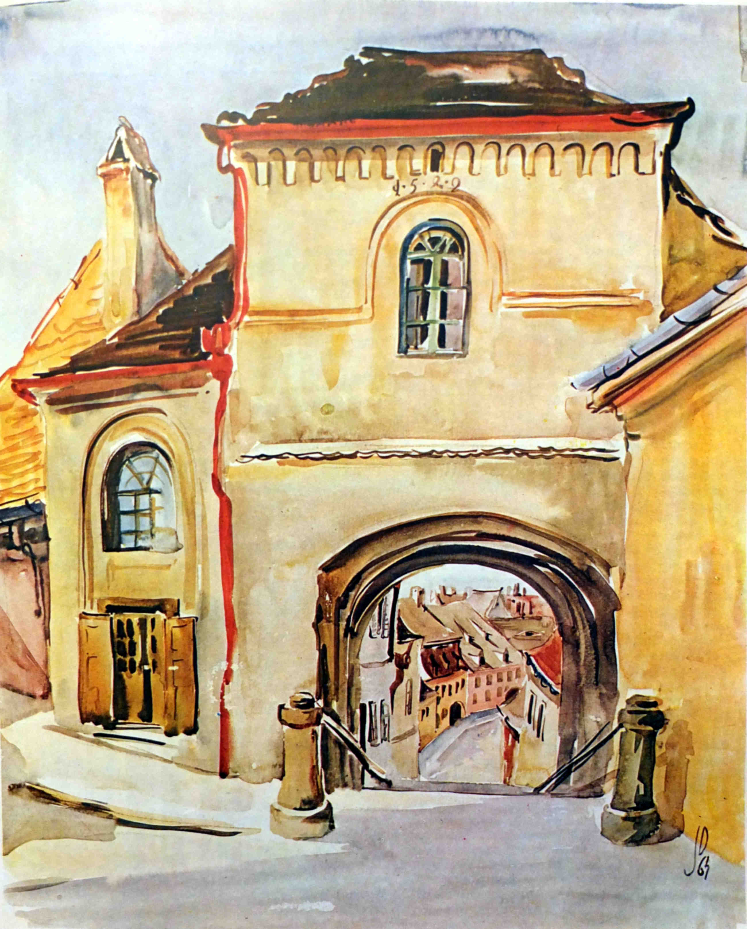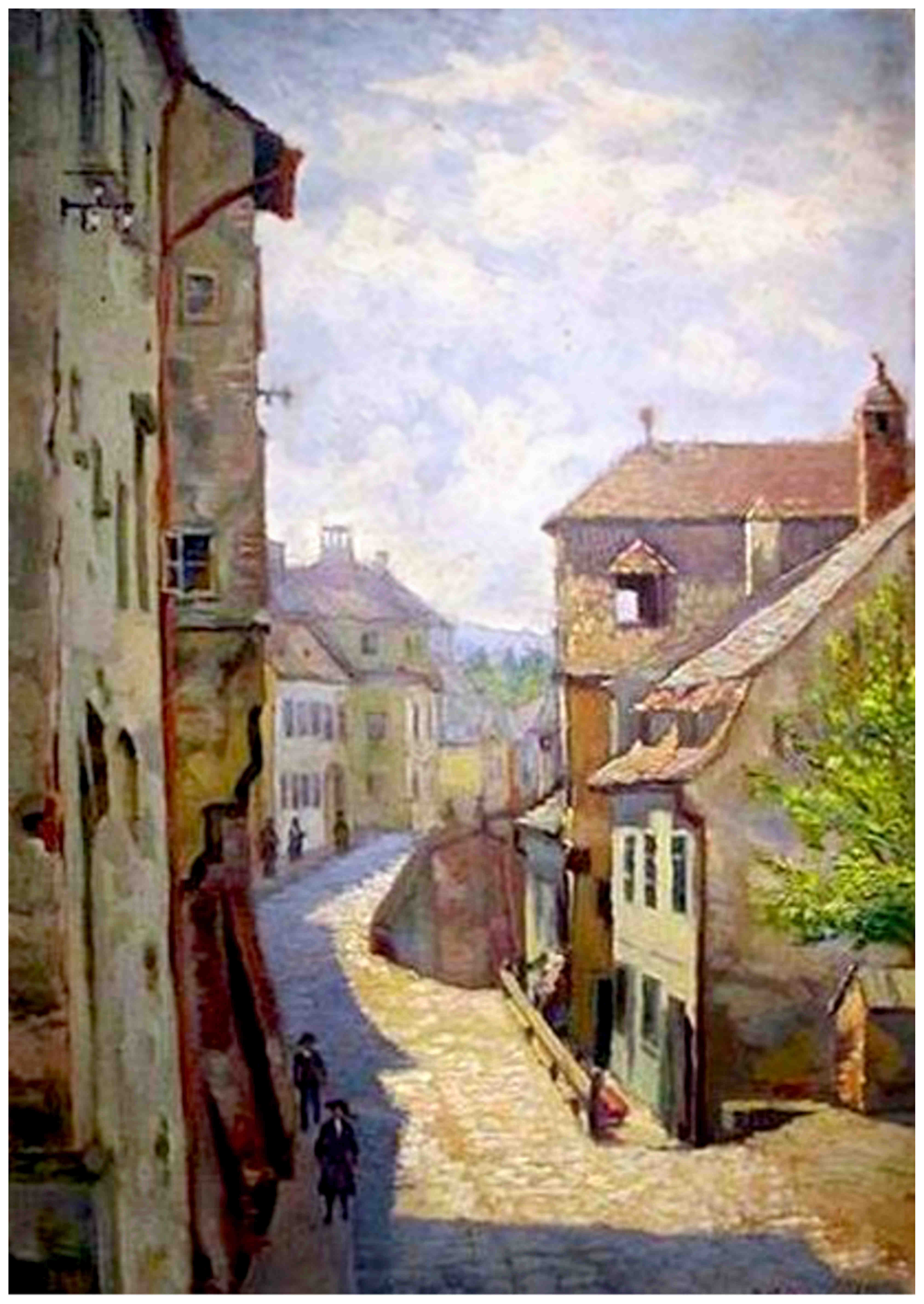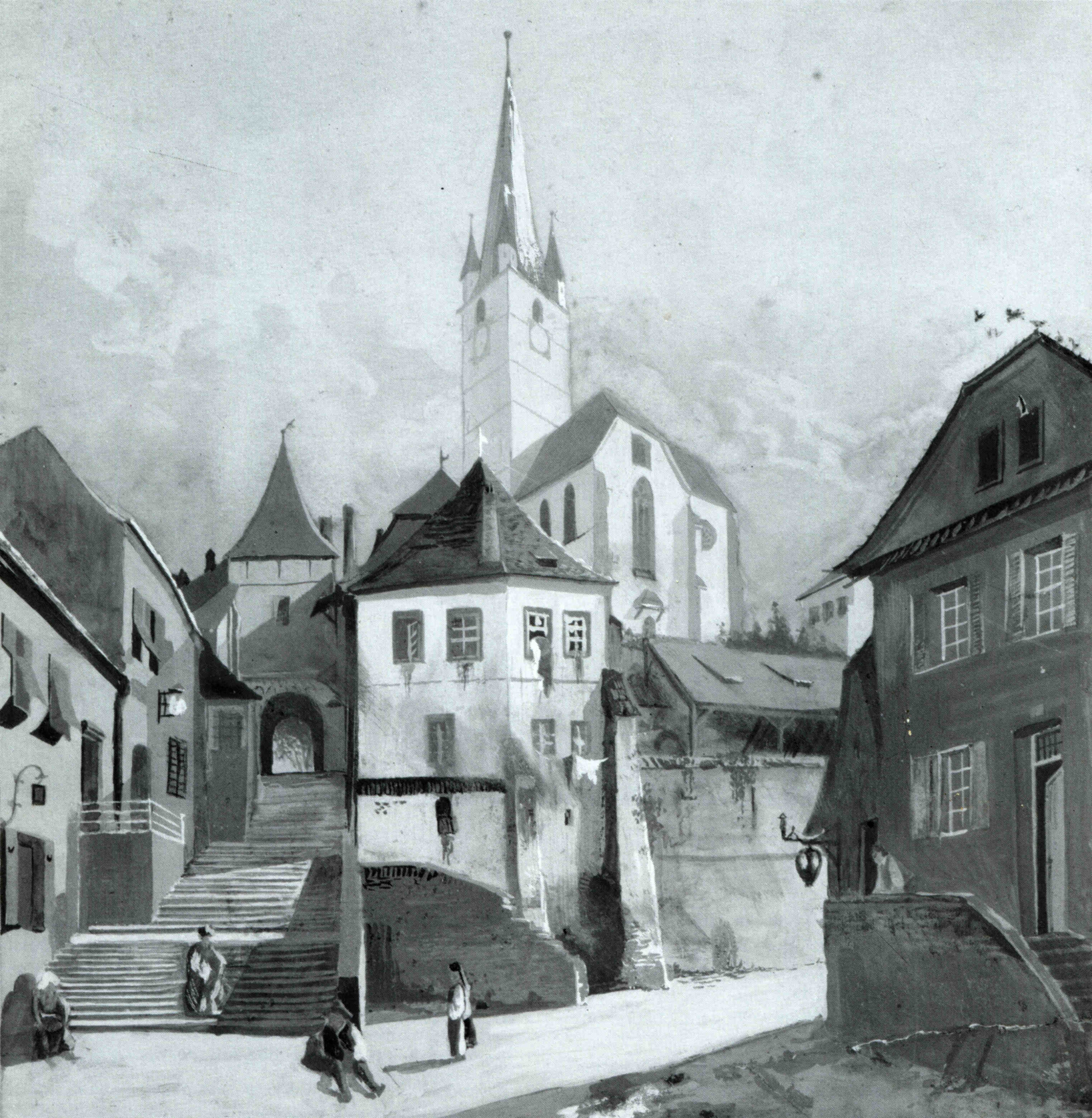 Această pictură frumoasă, cu valoare documentară, a fost realizată de artistul Karl Eduard Closius ( 1893-1959 ) la începutul anilor 1930. În pictura lui Closius se vede strada Pempflinger privită de pe vechiul pasaj pietonal desființat în jurul anului 1933, aflat între Turnul de Poartă și curtea Bisericii Evanghelice din Piața Huet.