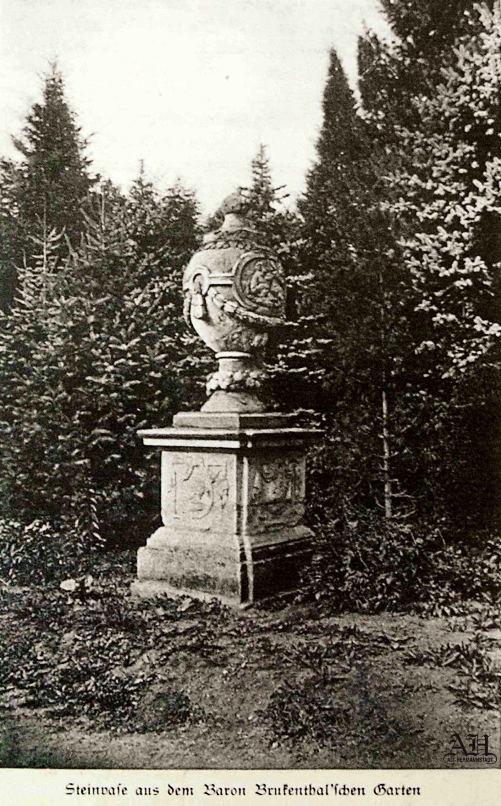 Vas de piatră din grădina Reședinței de Vară a Baronului Samuel von Brukenthal, str. Turnu Roșu // Rotenturm-Strasse, astăzi str. Constantin Noica. De-a lungul timpului cele două vase de piatră, realizate de sculptorul ardelean Simon Hoffmayer pentru Reședința de vară a baronului Samuel von Brukenthal, au fost mutate/amplasate în diferite locuri: Parcul Sub Arini // Erlenpark, Casa Societății // Gesellschaftshaus, Parcul Elisabeta // Elisabethpark (din fața fostului Palat de Finanțe al autorităților Austro-Ungare). Ilustrație din cartea lui Emil Sigerus „Vom alten Hermannstadt” // „Despre vechiul Sibiu” 1922.