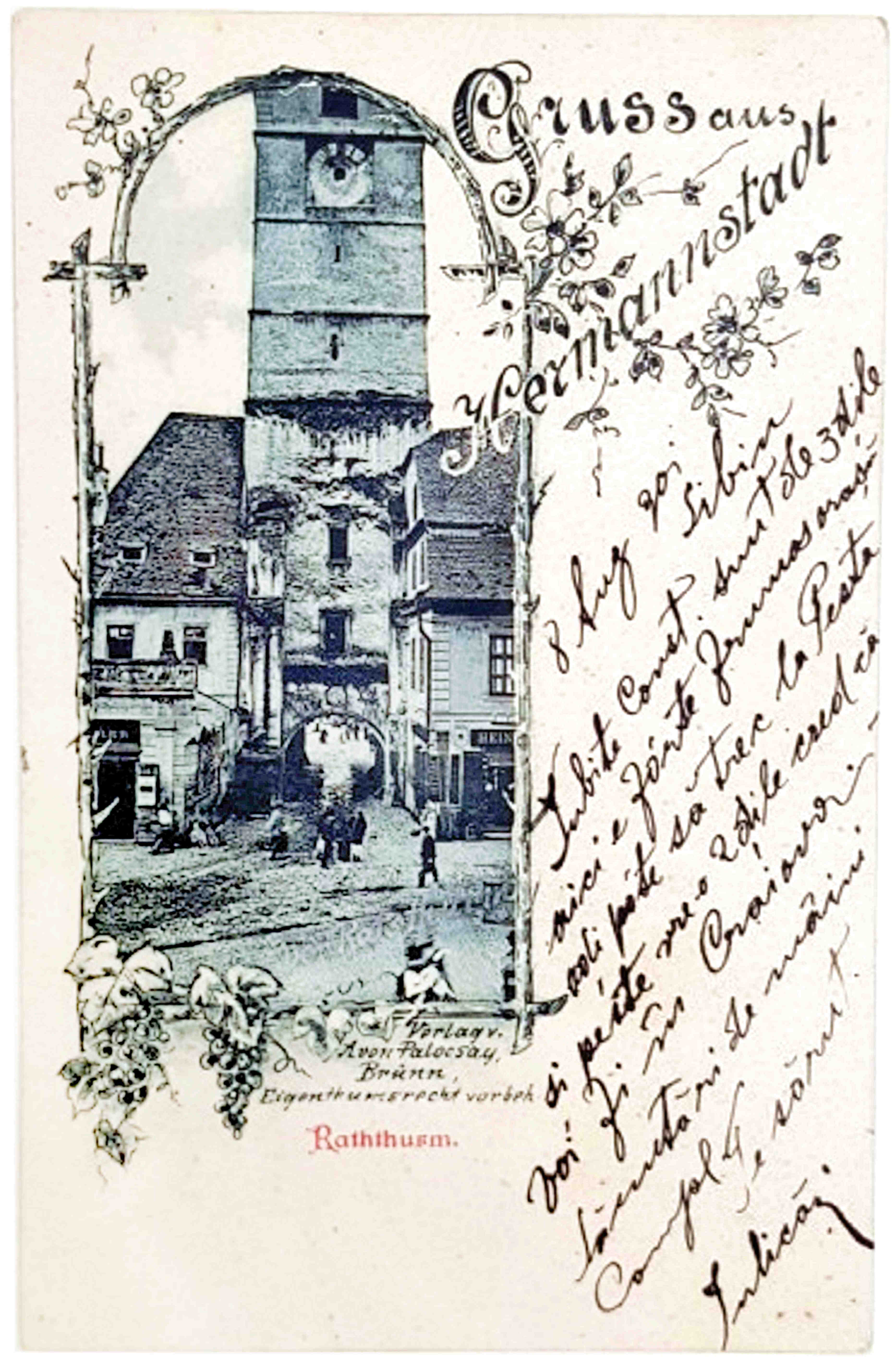 Această frumoasă carte poștală ilustrată, cu „Salutări din Sibiu” // „Gruss aus Hermannstadt”, a fost publicată la editura Aron Palocsay din Brno, ( germană: Brünn ).