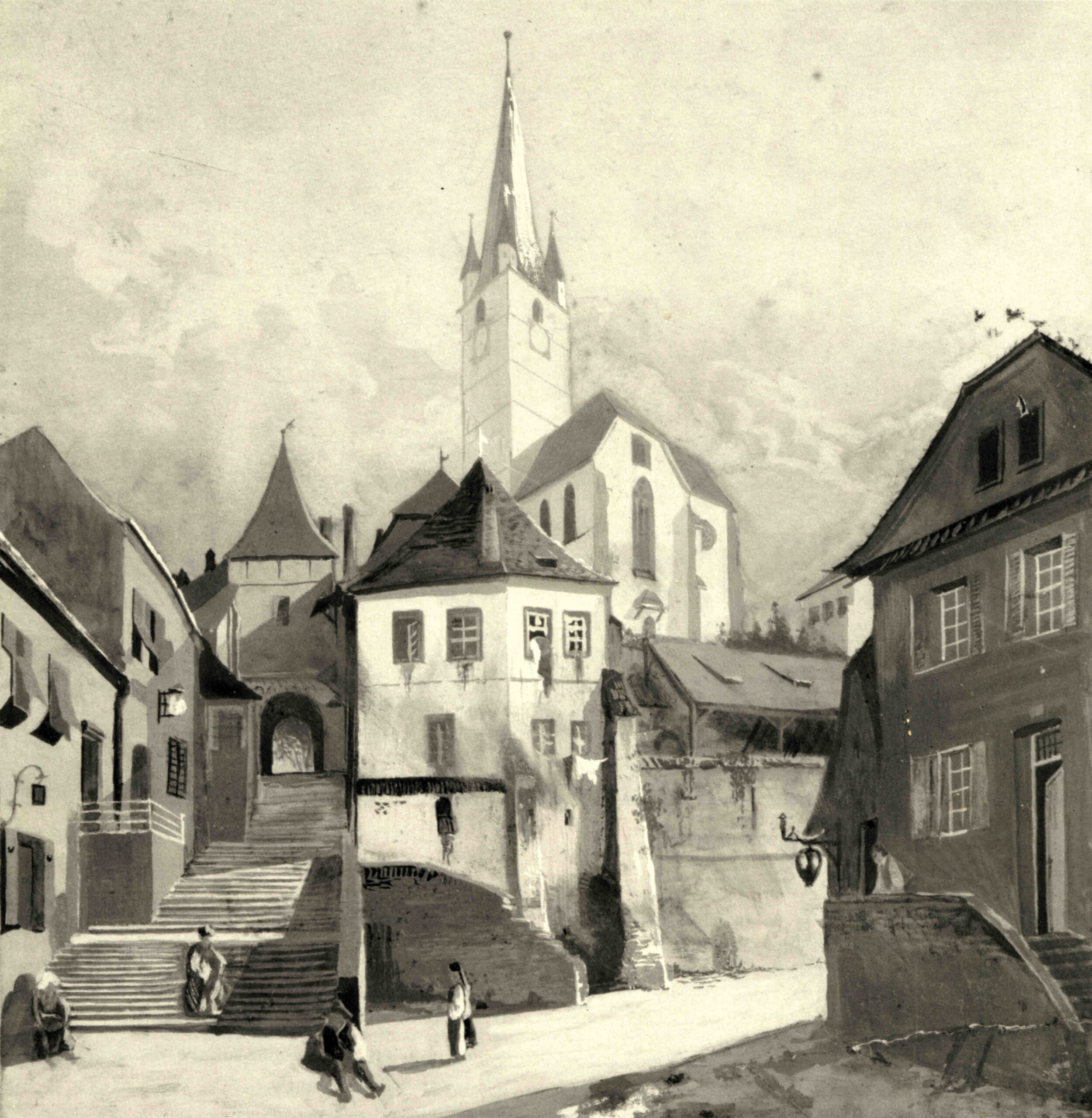 „Saggasse mit Sagstiege und evangelischer Stadtpfarrkirche in Hermannstadt” // „Strada Turnului/ Sag cu Scara Turnului/ Sag și Biserica Evanghelică din Sibiu”