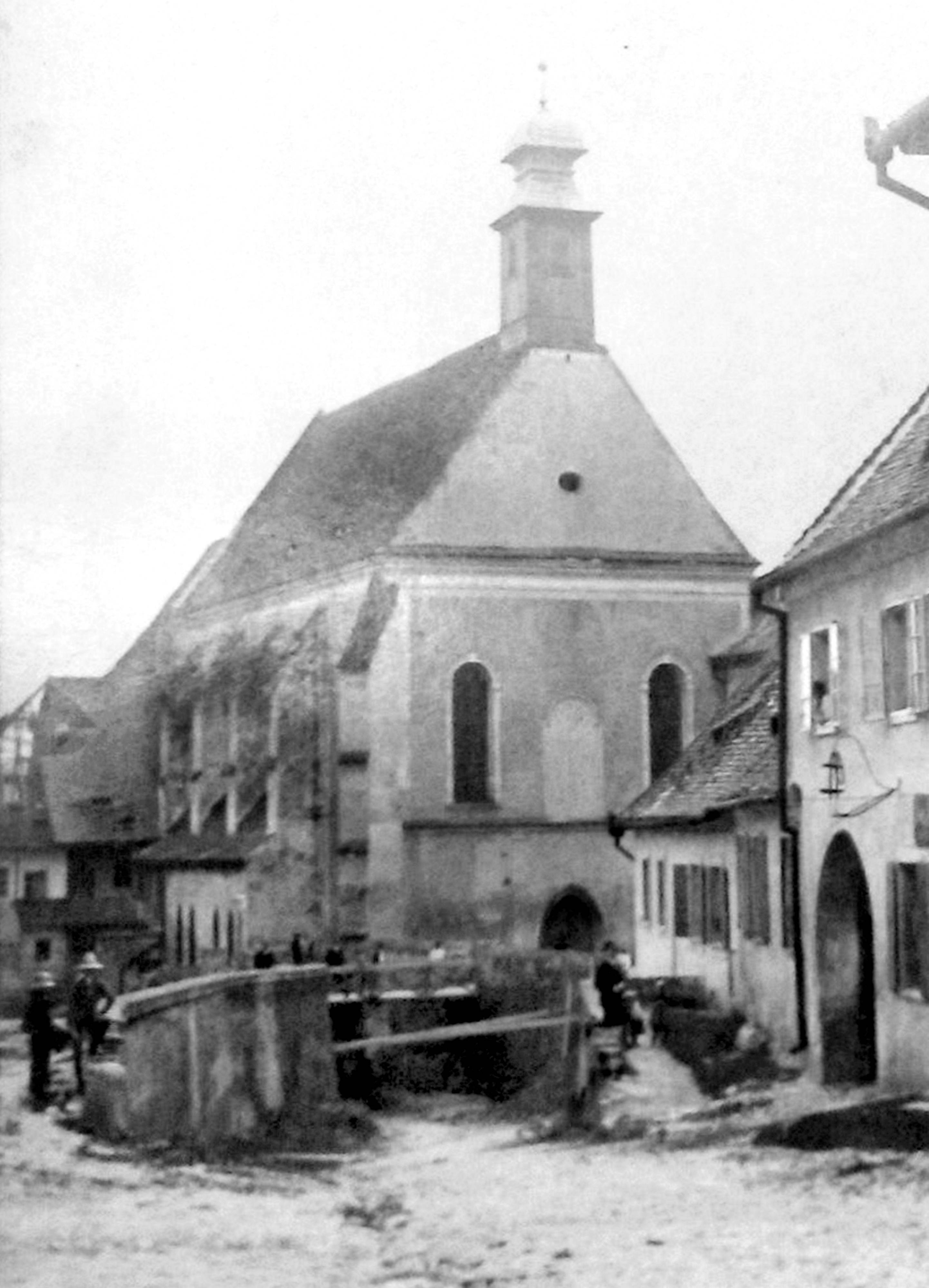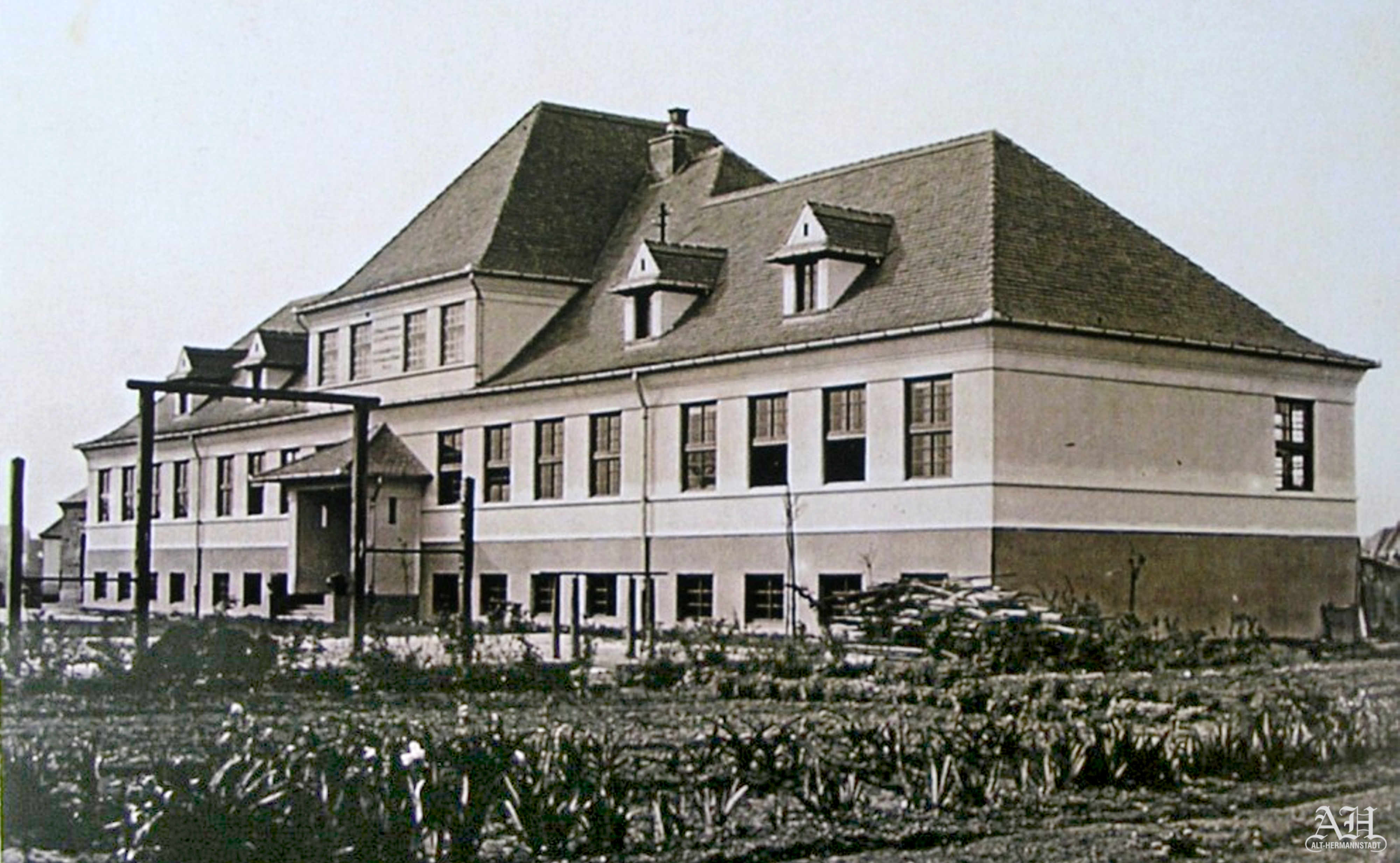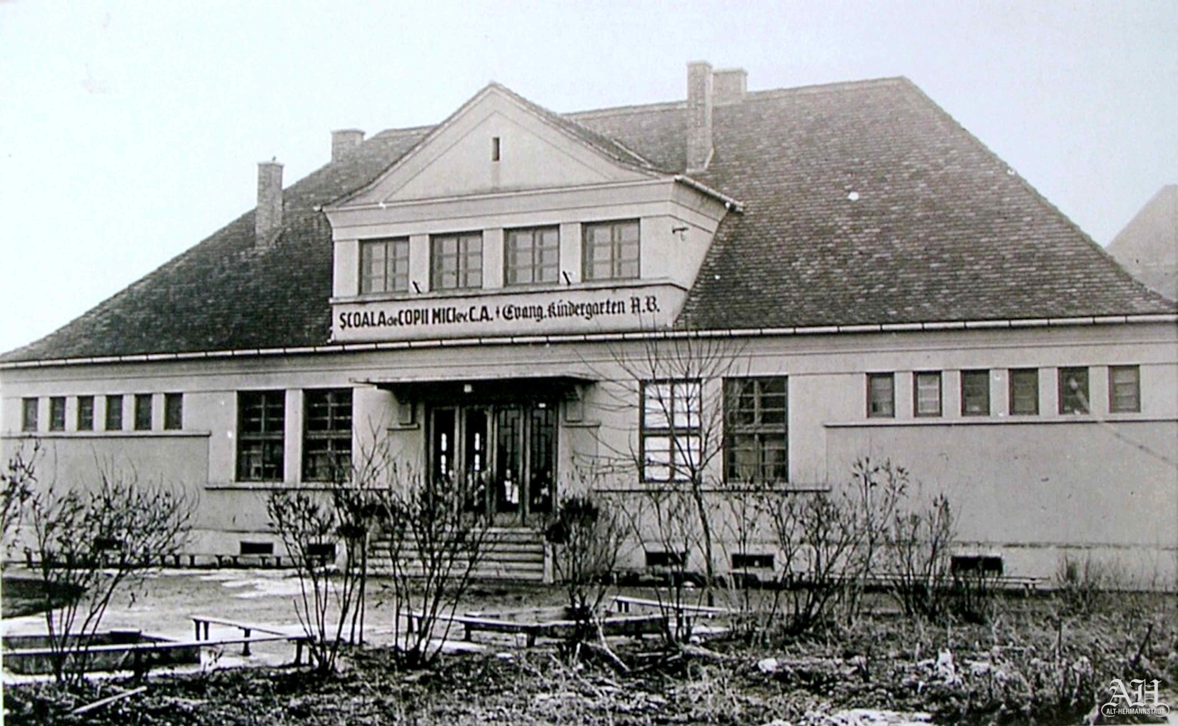 În cea de-a doua fotografie, realizată în jurul anului 1940, se poate citi pe fațada deasupra intrării următorul text: „ȘCOALA de COPII MICI ev. C.A. + Evang. Kindergarten A.B.”