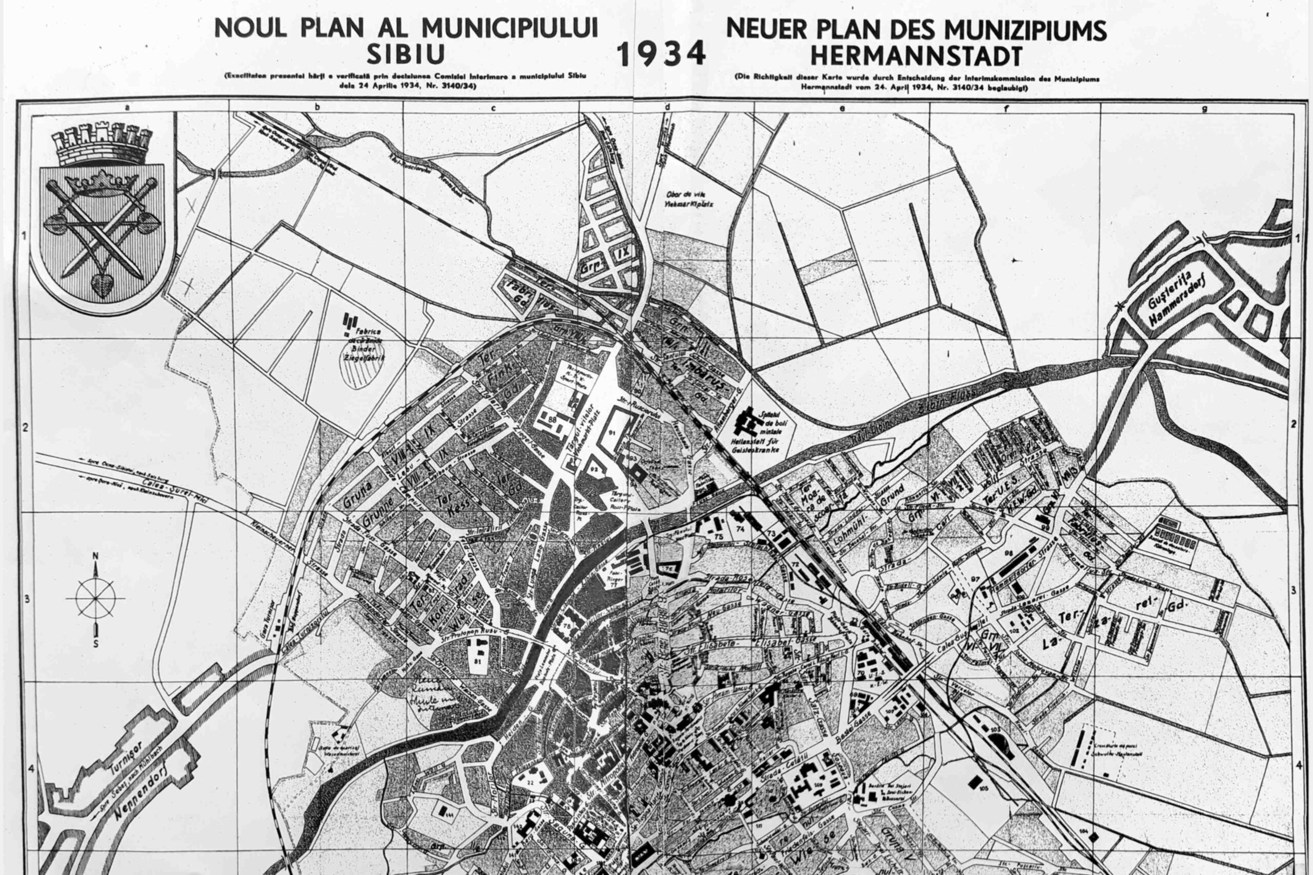 Stânga: Detaliu din Planul orașului Sibiu din 1875, bazat pe un desen al gravorului Franz J. Dimitrowits, a fost tipărit la Institutul litografic Friedrich August Robert Krabs din Sibiu, Piața Mare 13. Este primul plan al orașului Sibiu realizat pe baza principiilor topomrtrice moderne!