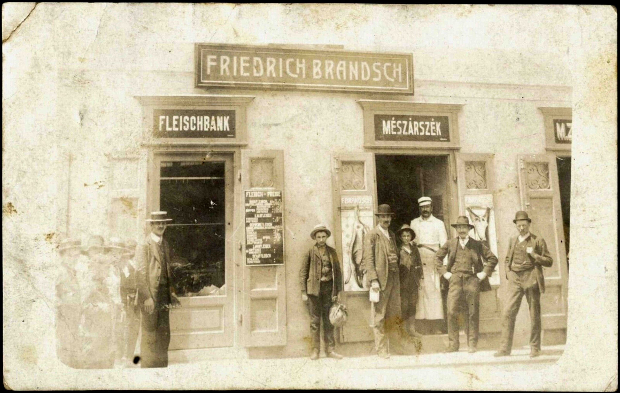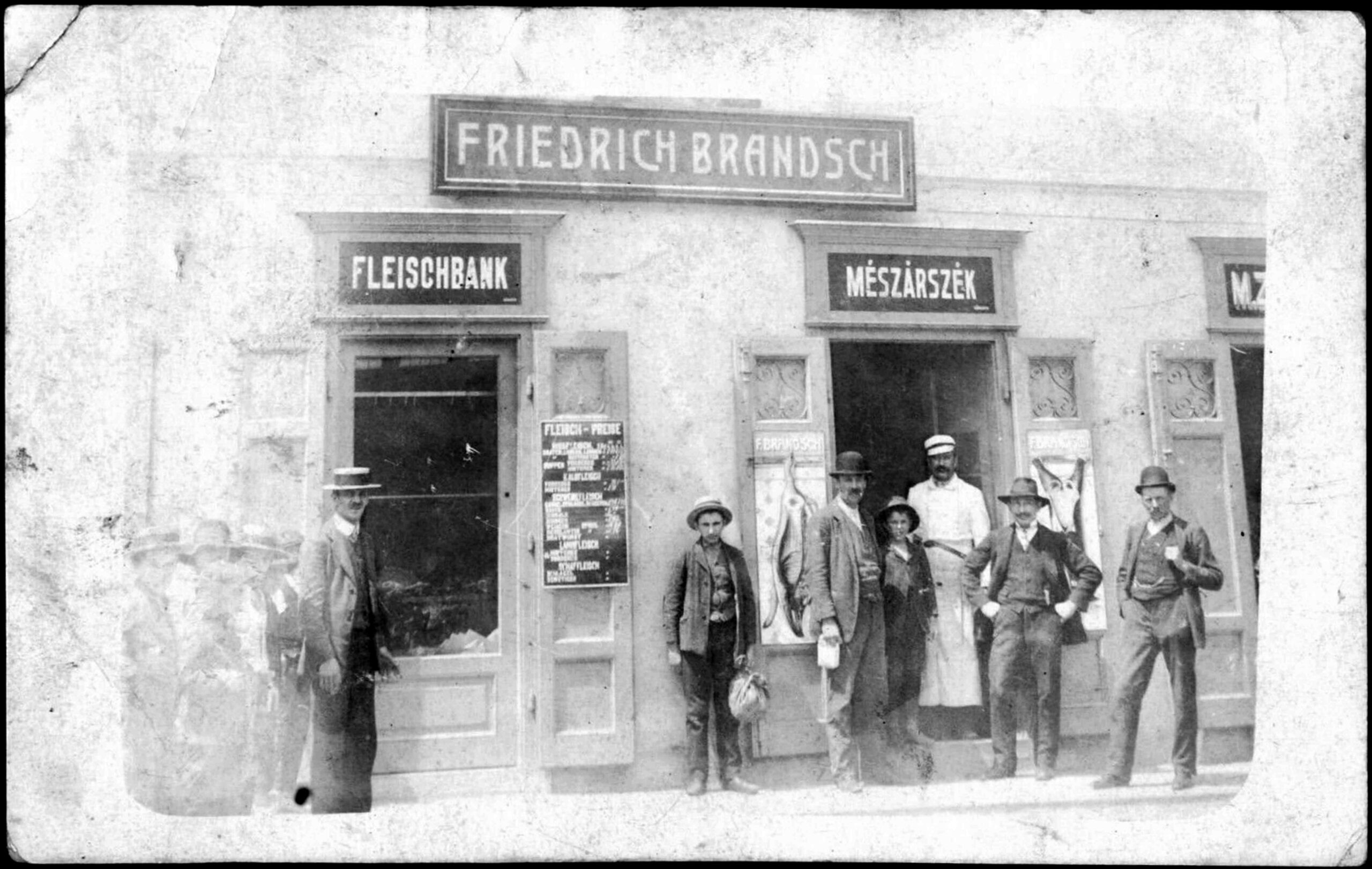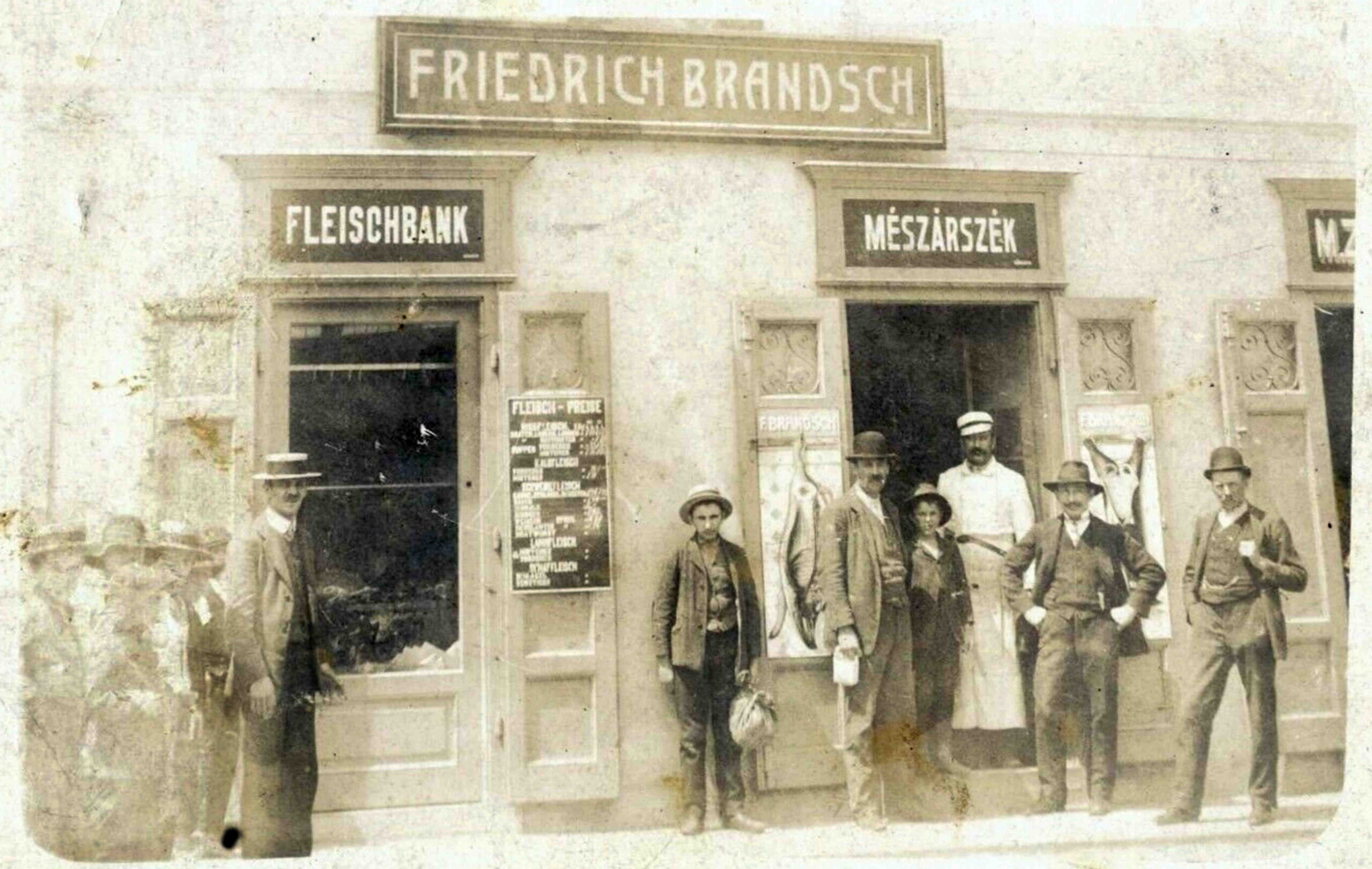 Fotografia arată măcelăria lui Friedrich Brandsch, care a funcționat la parterul clădirii str. Turnului nr.9 ( număr vechi 15 ). Pe fațada clădirii se vede firma măcelăriei „FRIEDRICH BRANDSCH” și pe cele două casete situate deasupra vitrinelor reclama „FLEISCHBANK” și „MÉSZÁRSZÉK”.Stânga: variantă editată policrom <> o <> Dreapta: variantă editată alb-negru