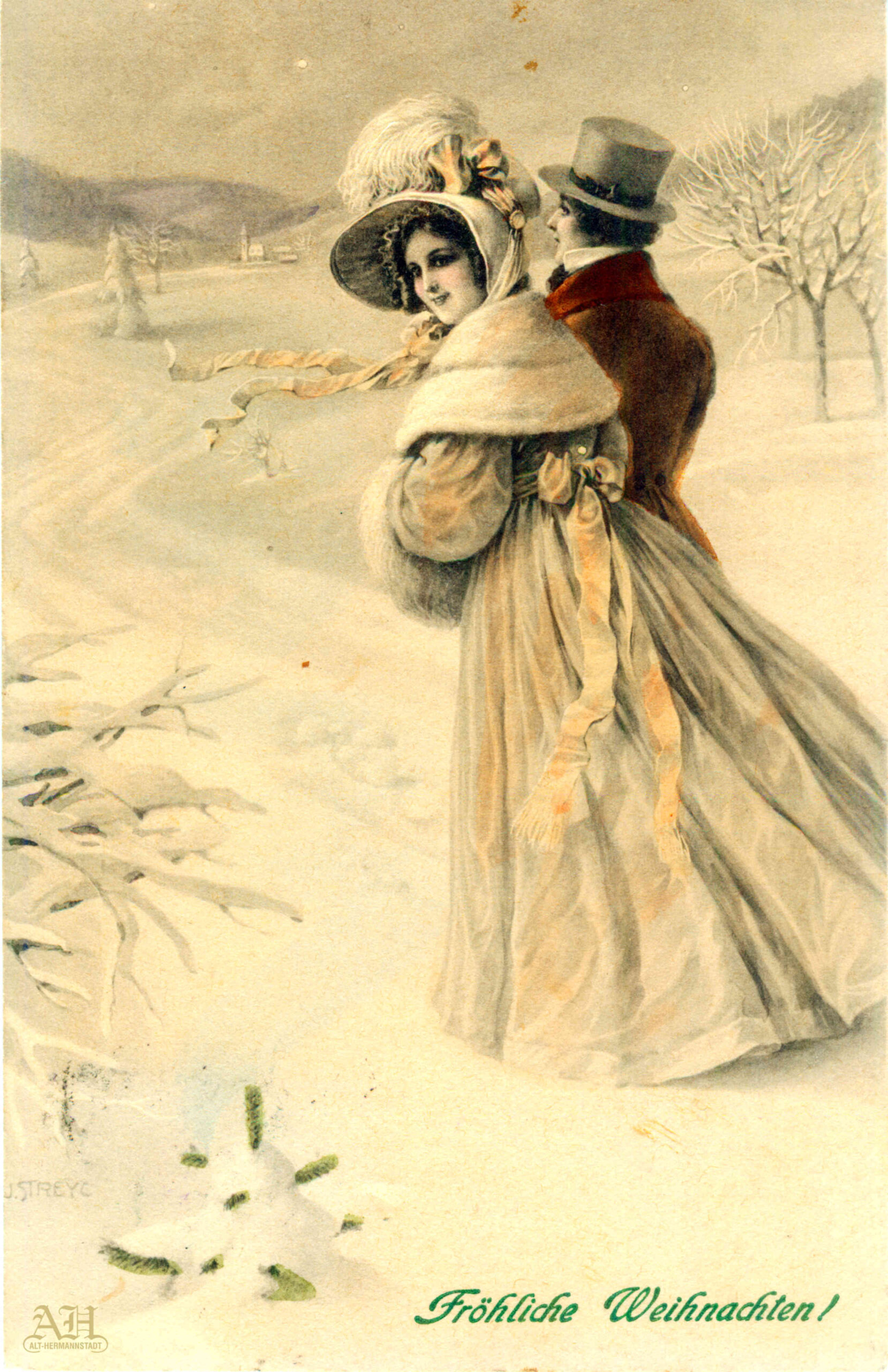 Această frumoasă carte poștală ilustrată, publicată de editura de artă Markus Munk din Vienae, a circulat în luna decembrie 1910 între Viena și Sibiu. Ilustrația cu inscripția „Fröhliche Weihnachten !”, ( Crăciun fericit ! ), este etichetată pe verso cu textul „Nr. 465, M. M. VIENNE, M. MUNK.”