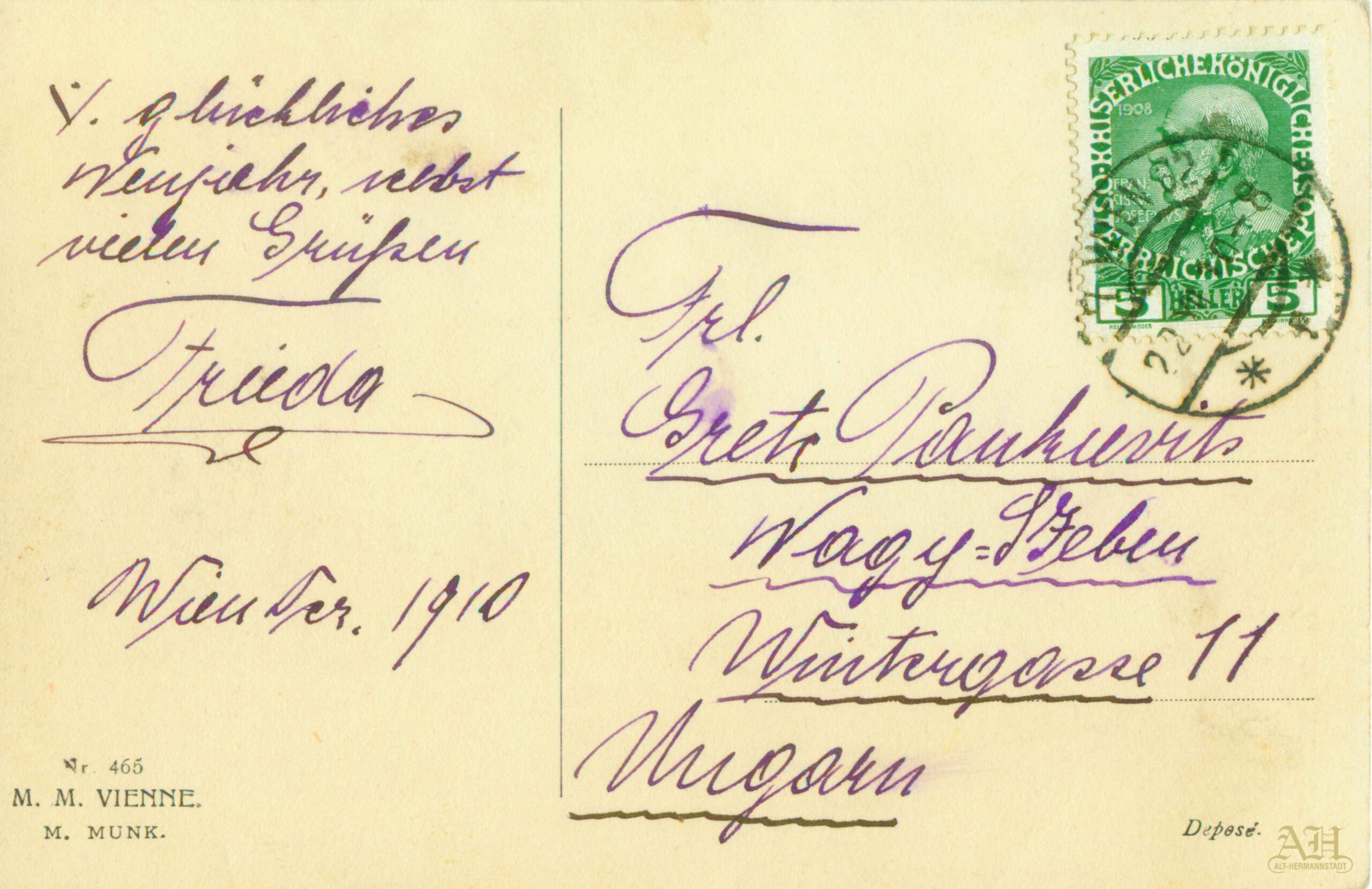 Pe verso se află următorul text, scris de mână cu cerneală albastră: „Glückliches Neujahr, nelbst vielen Grüßen, Frieda / Wien, Dez. 1910”. | ”Frl. Grete Pankievits, Nagy-Szeben, Wintergasse 11, Ungarn”