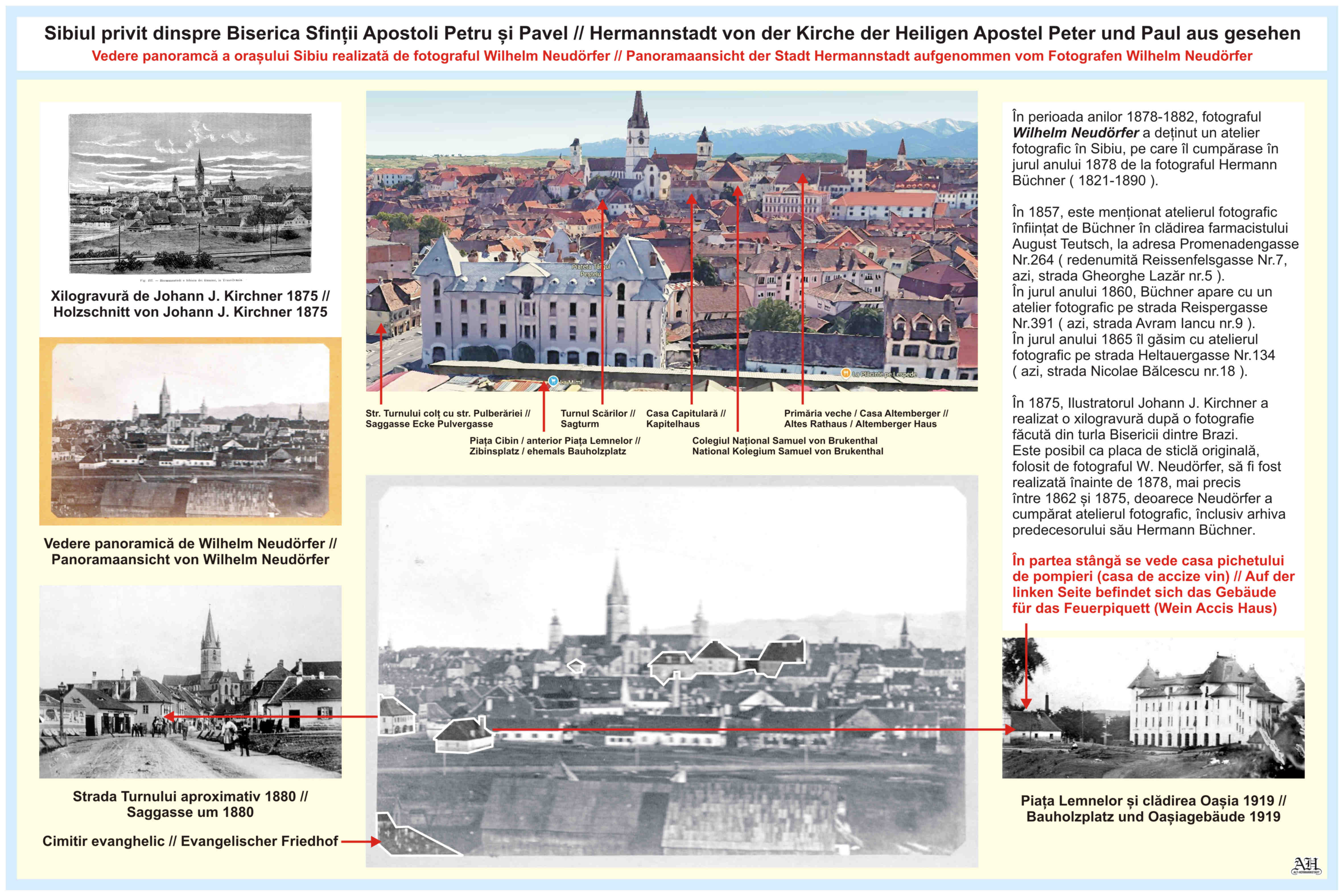 Această fotografie cu valoare documentară a fost realizată de fotograful Wilhelm Neudörfer în anii 1870 din turla bisericii Sfinții Apostoli Petru și Pavel, situată pe strada Reconstrucției. Fotografia în format cabinet este etichetată pe verso cu reclama atelierului fotografic, * W. NEUDÖRFER * PHOTOGRAPH * HERMANNSTADT *.