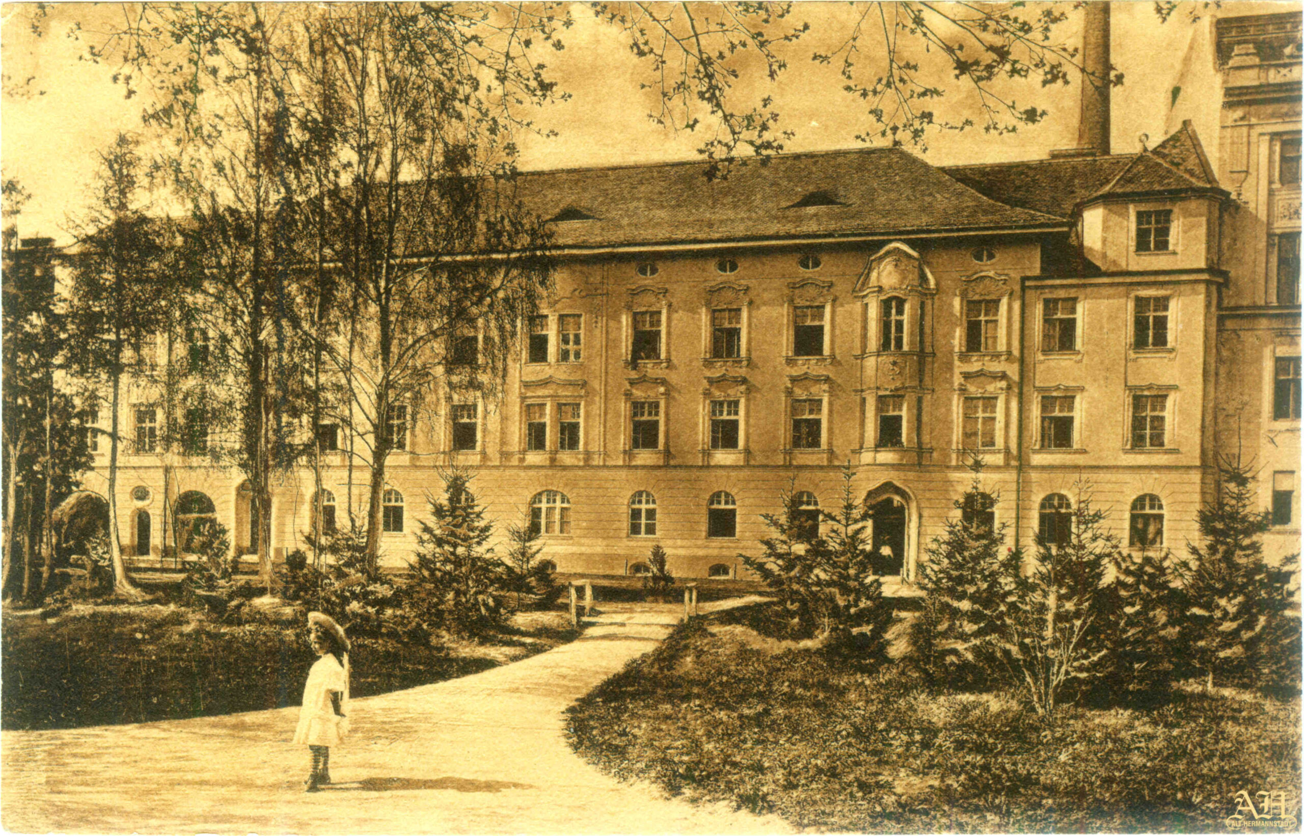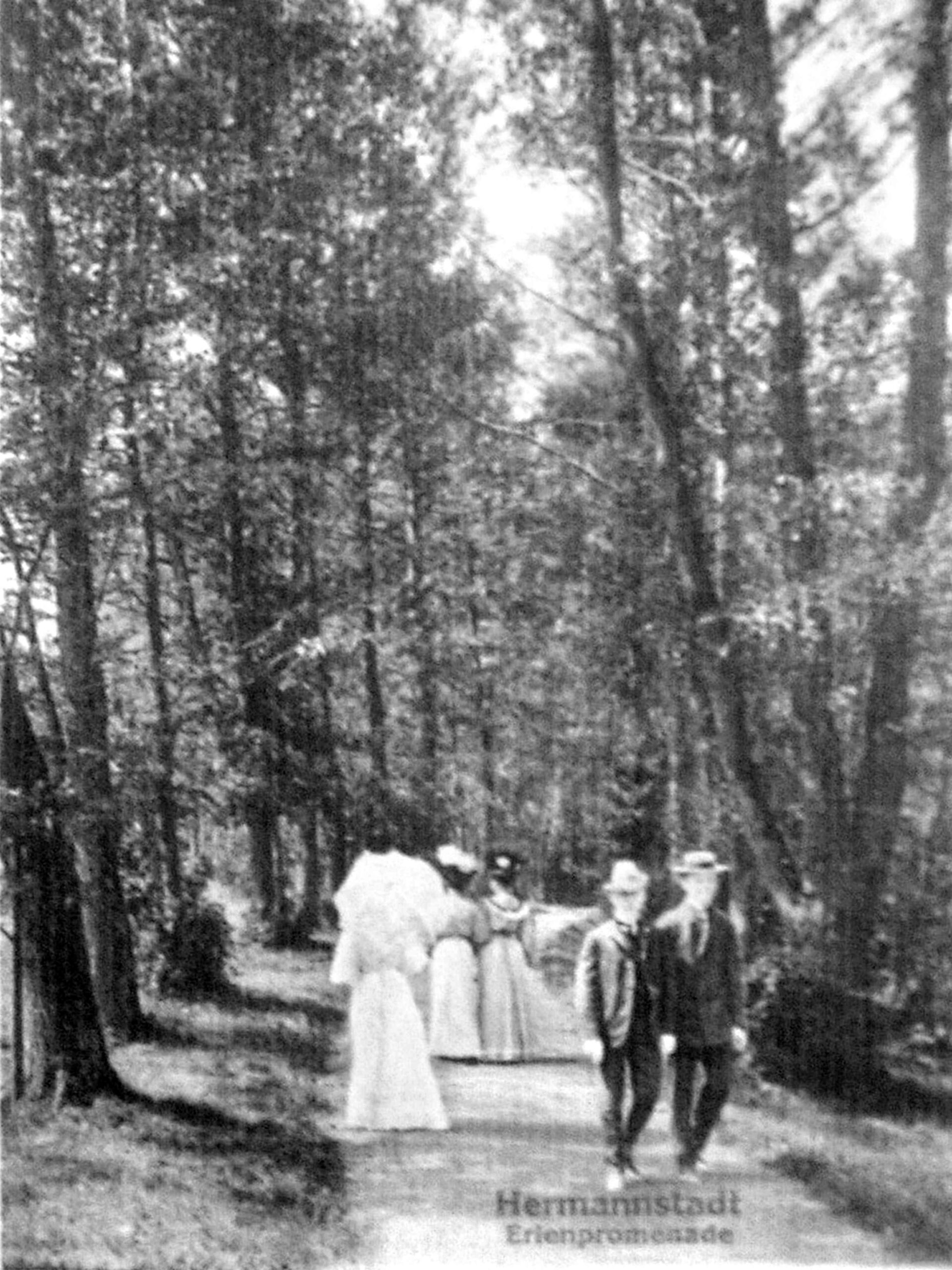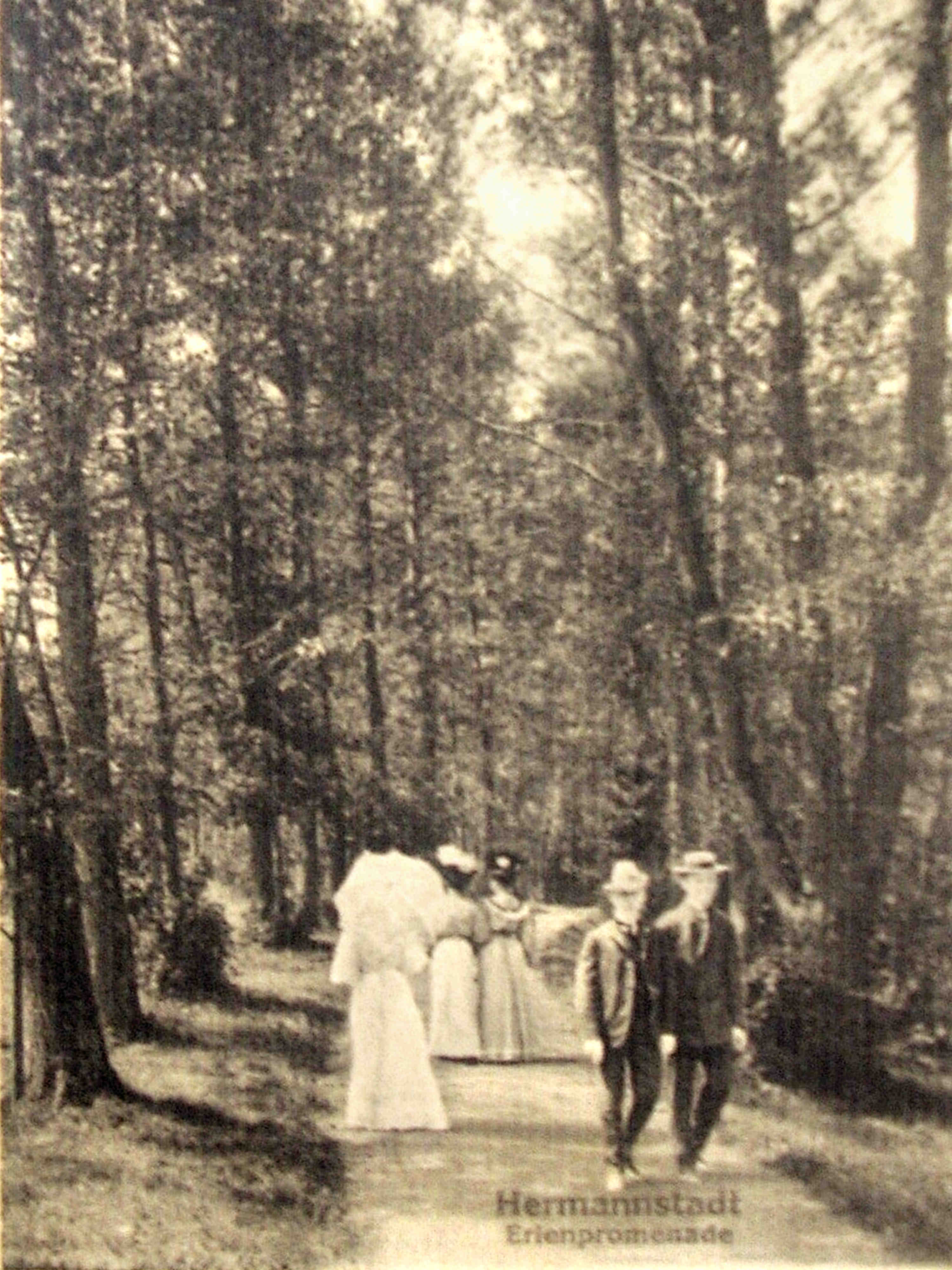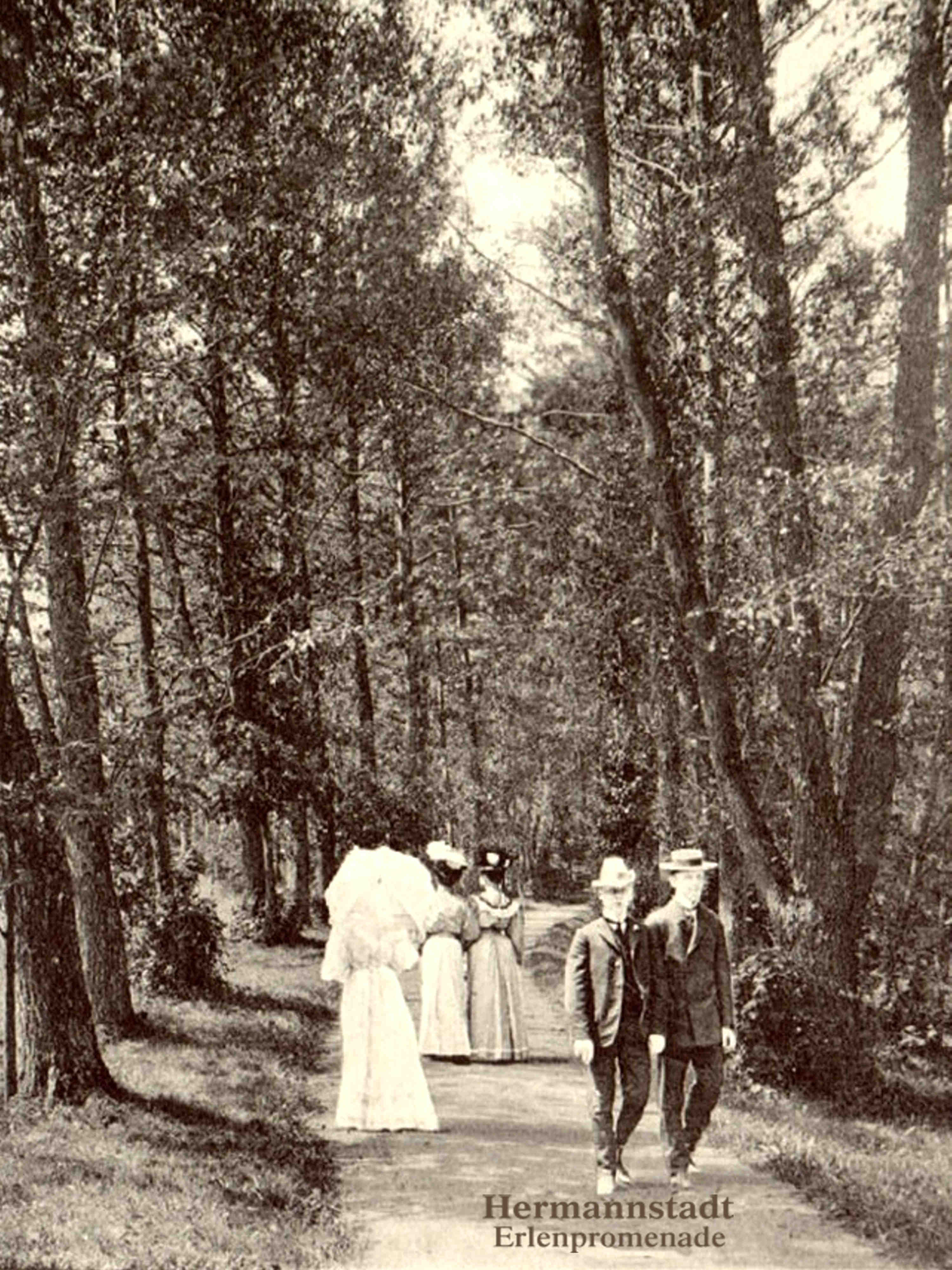 Ilustrații din arhiva grupului de Facebook Alt-Hermannstadt.La o privire mai atentă, se observă că acest instantaneu este de fapt o ilustrație realizată pe baza unei reproduceri fotografice, din care a fost retușat/ șters textul „Hermannstadt, Erlenpromenade”, care în versiunea originală era vizibil în partea de jos a ilustrației!