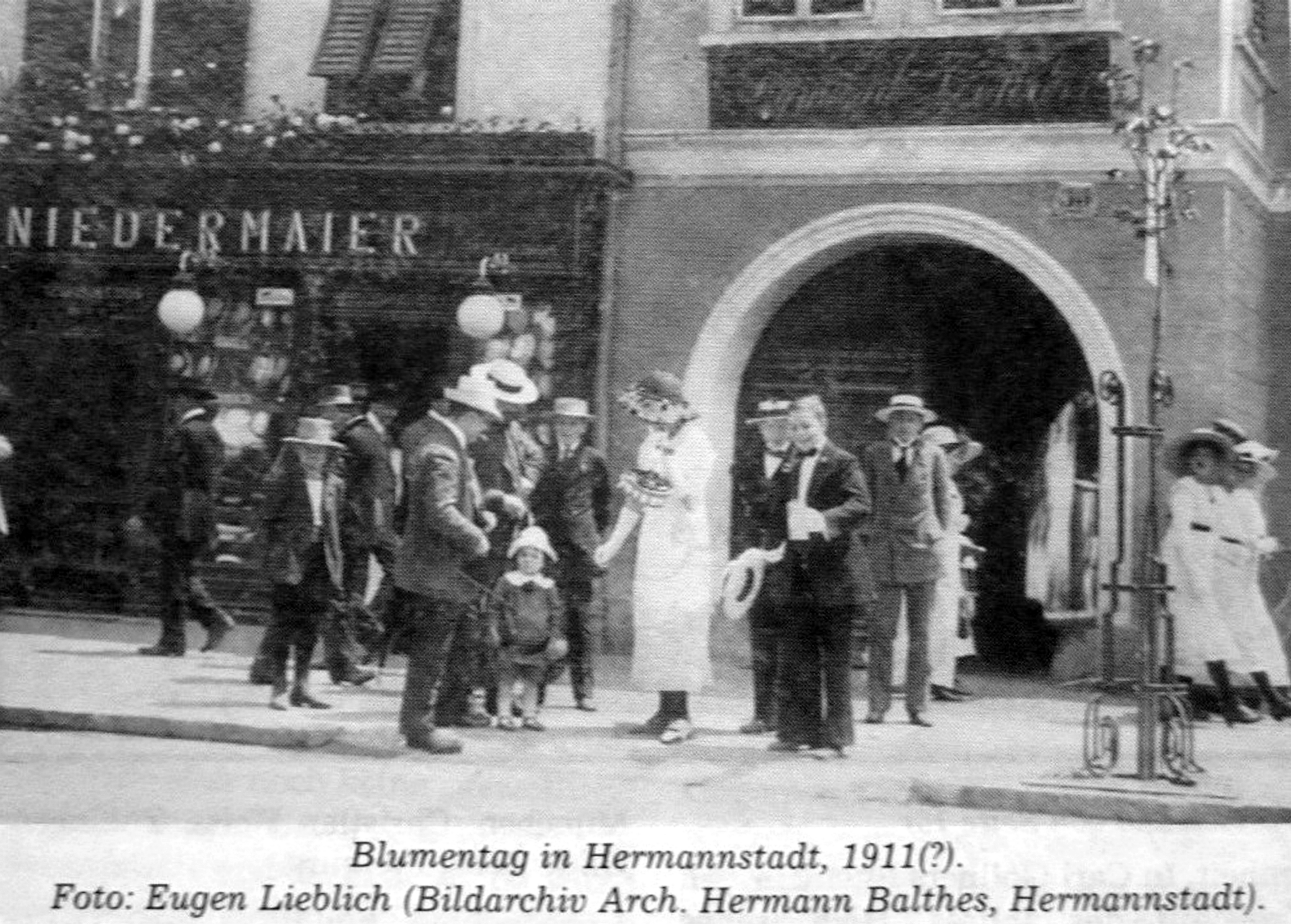 Instamtaneul a fost făcut pe strada Nicolae Bălcescu, pe atunci, strada Cisnădiei // Heltauergasse // Disznódi utca, cunoscută Sibienilor și sub numele de Corso. În partea dreaptă se vede intrarea în curtea clădirii N. Bălcescu nr.29, pe atunci nr.35, aflată în proprietatea lui Sigmund Ferderber. În clădirea situată în curtea parcelei a fost inaugurat, la 25 decembrie 1936, cinematograful CORSO, care în perioada comunistă a devenit cinematograful PACEA. În partea stângă a fotografiei se vede, pe fațada clădirii de la nr.27, pe atunci nr.33, reclama magazinului de pălării KARL NIEDERMAIER. Clădirea a fost proprietatea familiei Niedermaier de la sfârșitul seolului al XIX-lea până la naționalizare.Textul sub ilustrație, „Blumentag in Hermannstadt, 1911(?), Foto: Eugen Lieblich (Bildarchiv Arch. Hermann Balthes, Hermannstadt).”, ne informează că fotografia, care a fost realizată probabil în timpul primei ediții a Zilei Florilor în 1911, a fost făcută de Eugen Lieblich și se află în colecția arhitectului Hermann Balthes din Sibiu.