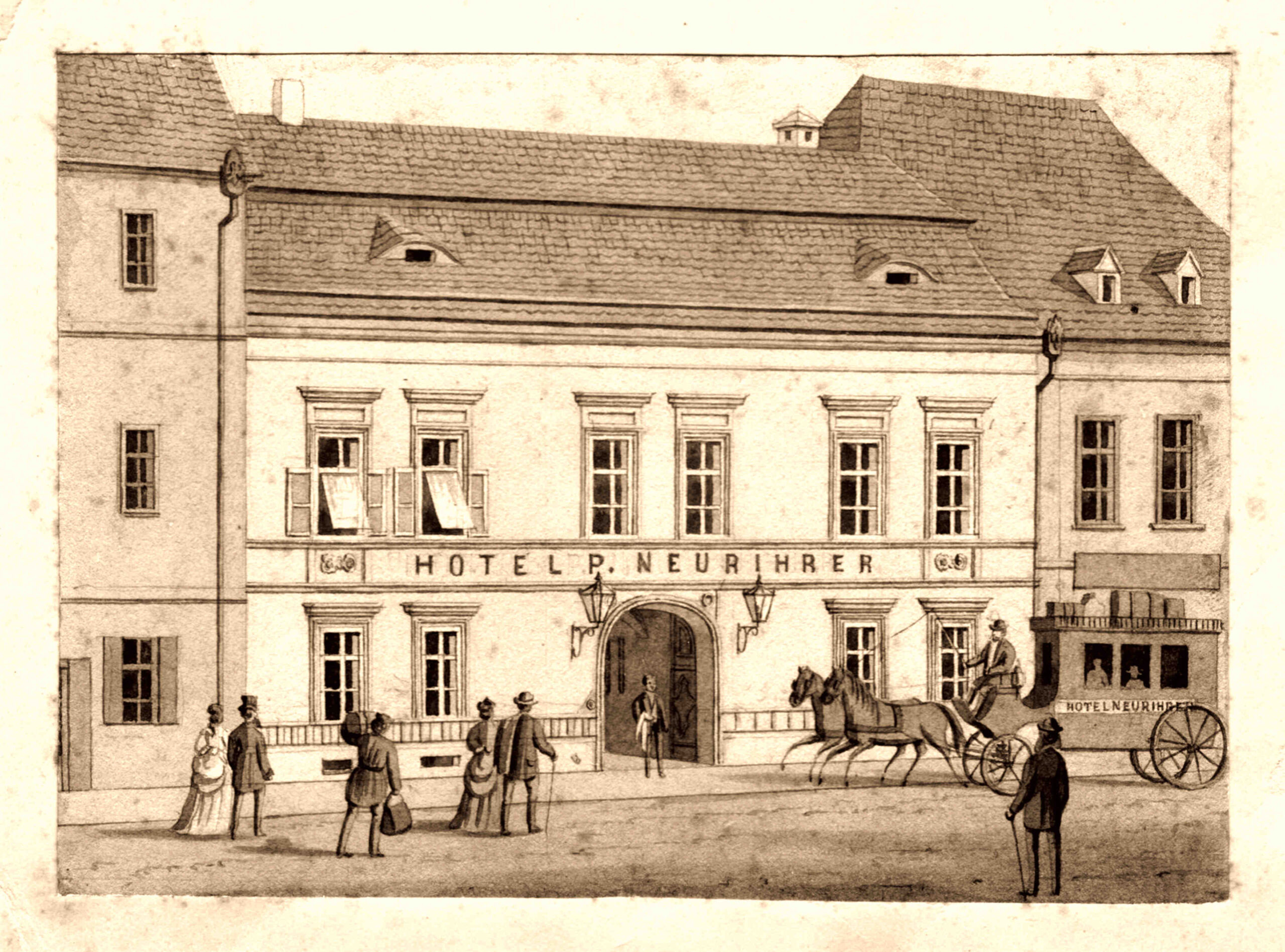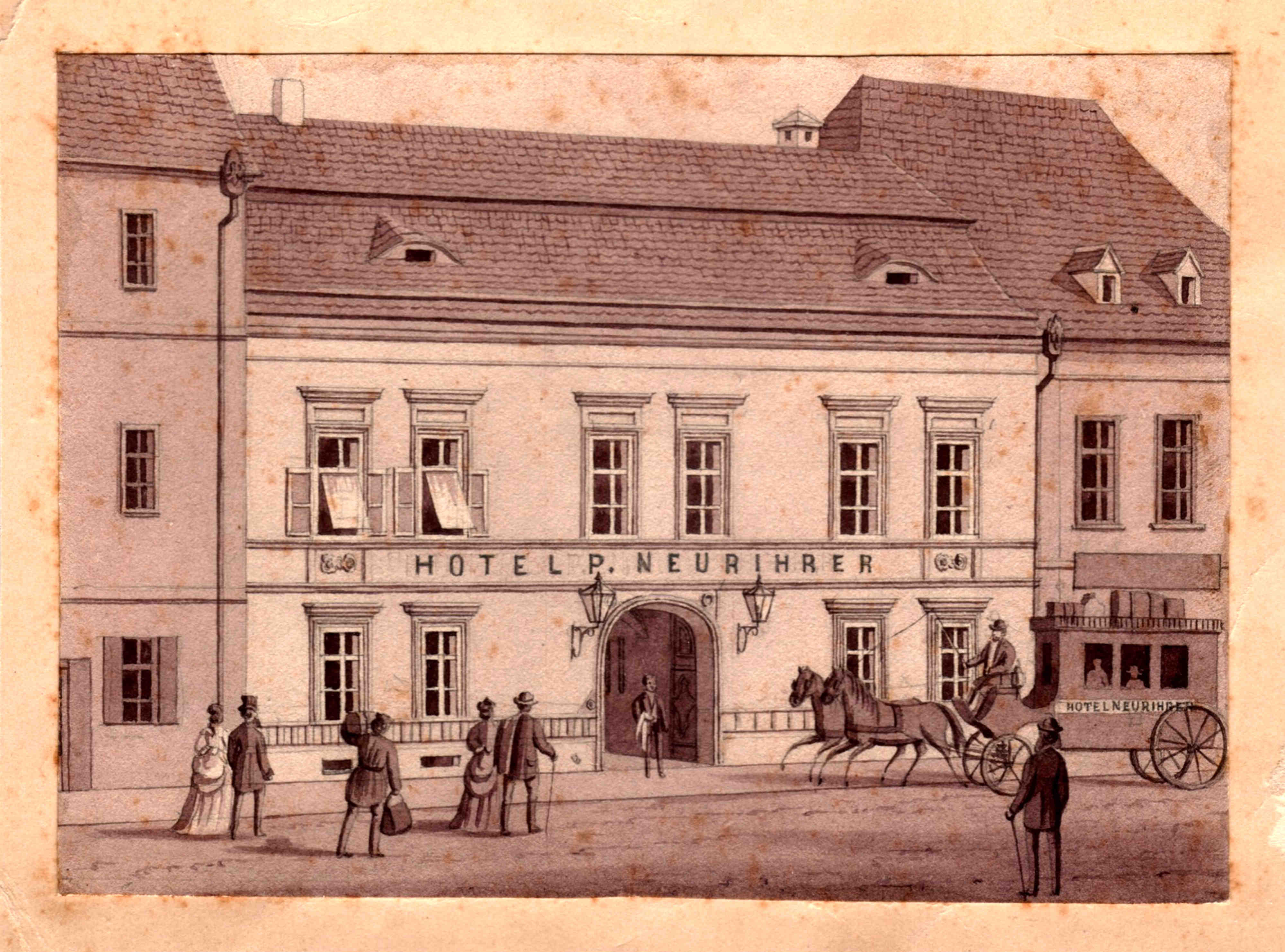 >> Vechiul restaurant de lângă teatru s-a deschis în 1789 odată cu deschiderea hanului de lângă Turnul Cositorilor (demolat), han cunoscut sub numele de „Gasthaus Kaiser von Österreich”. Dintre arendașii restaurantului de amintit Johann Hübner și Gottfried Retsch. Hanul este demolat în 1876.