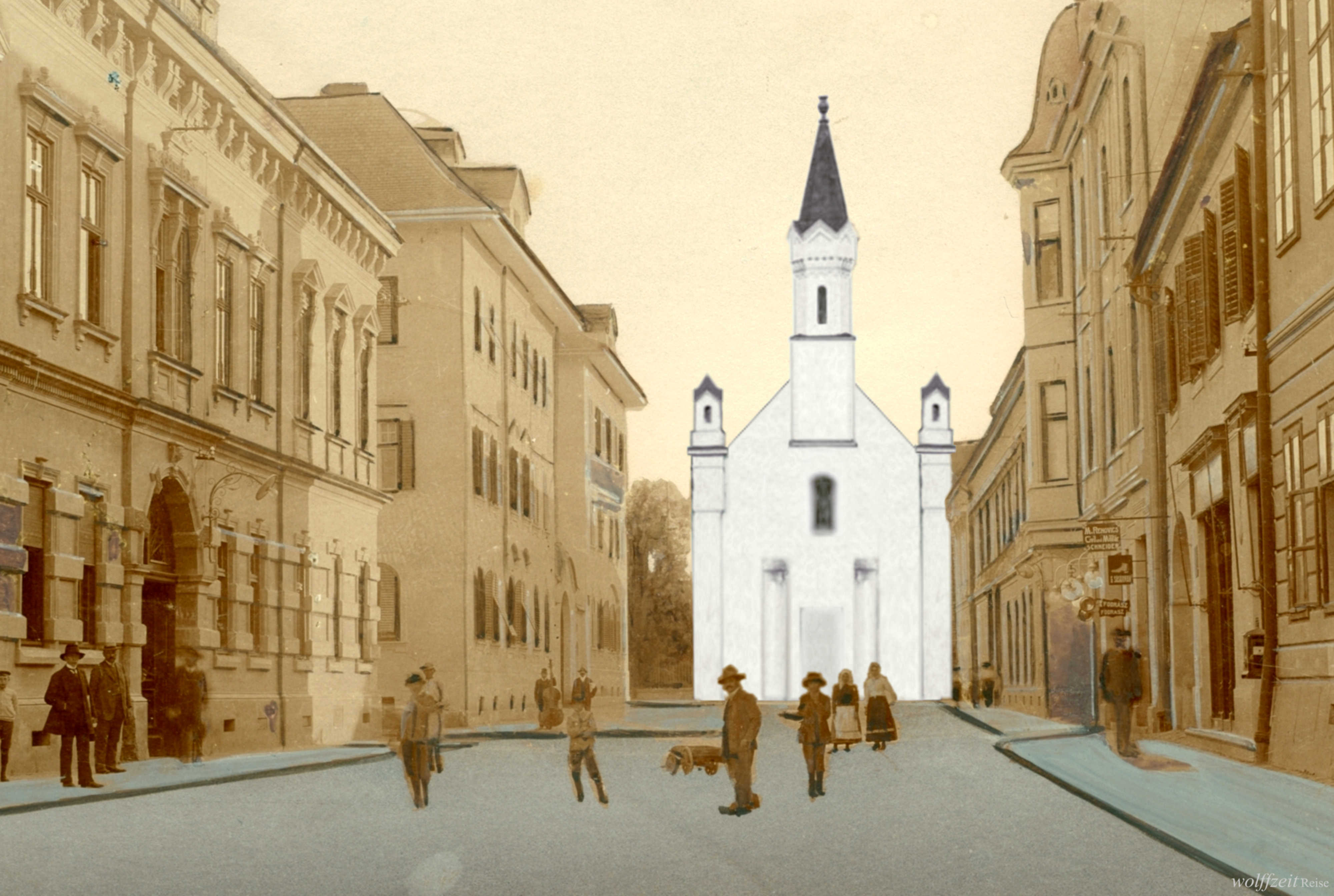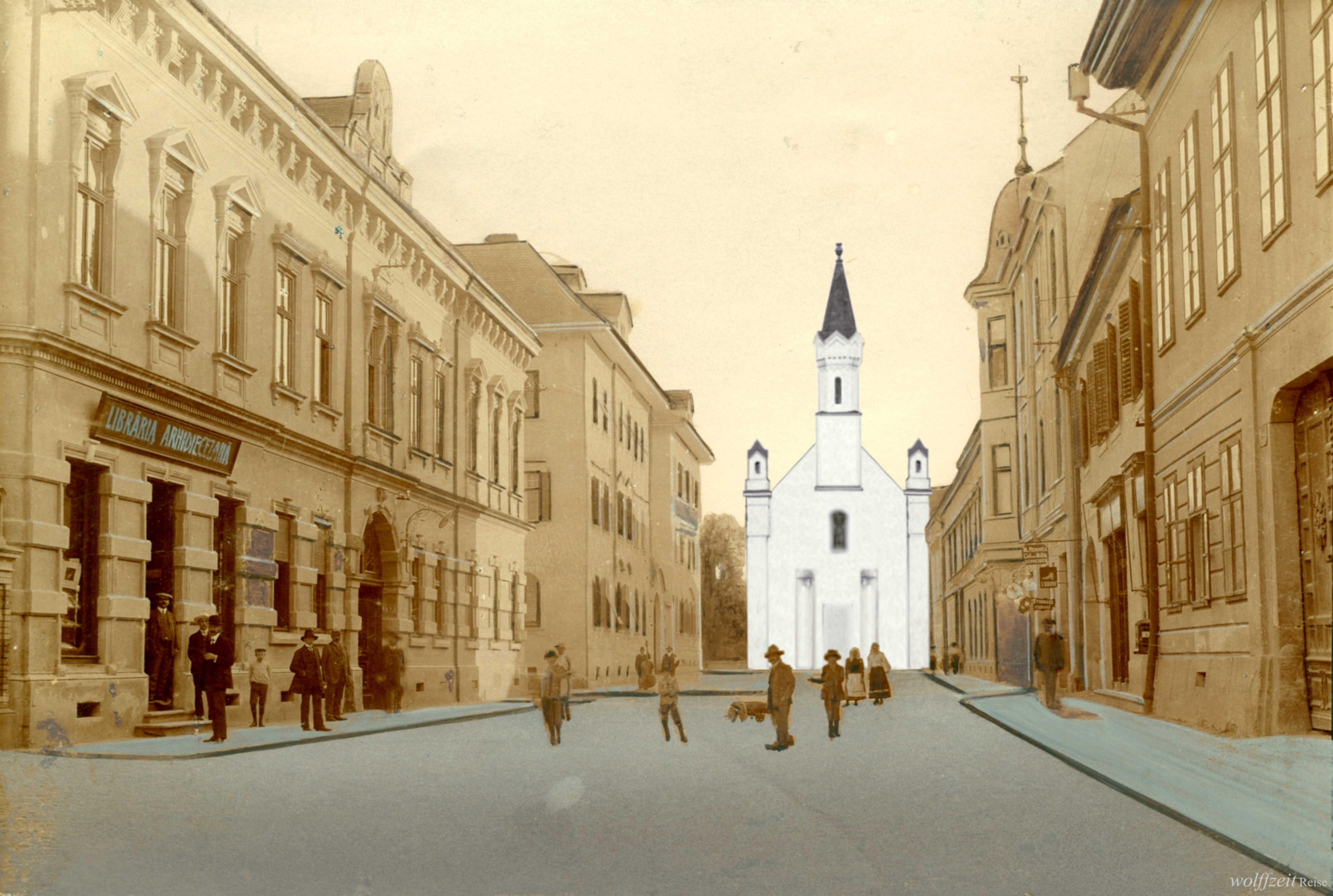 Fotografia originală cu valoare documentară folosită pentru acest colaj a fost realizată în 1911, pe strada Mitropoliei în Sibiu. În fotografia respectivă lipsește clădirea bisericii care a precedat actuala biserică Sf. Ioan // Johanniskirche!
