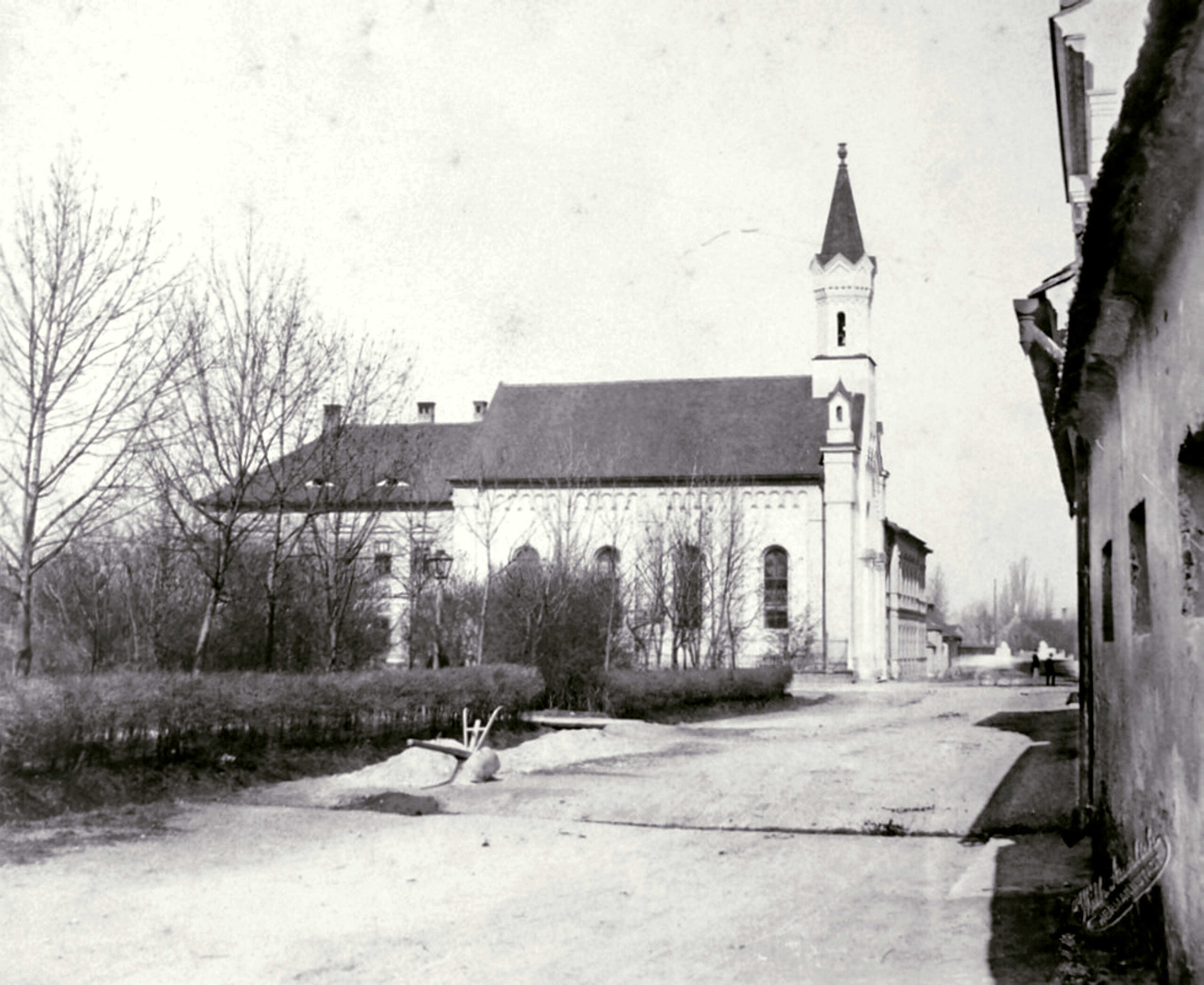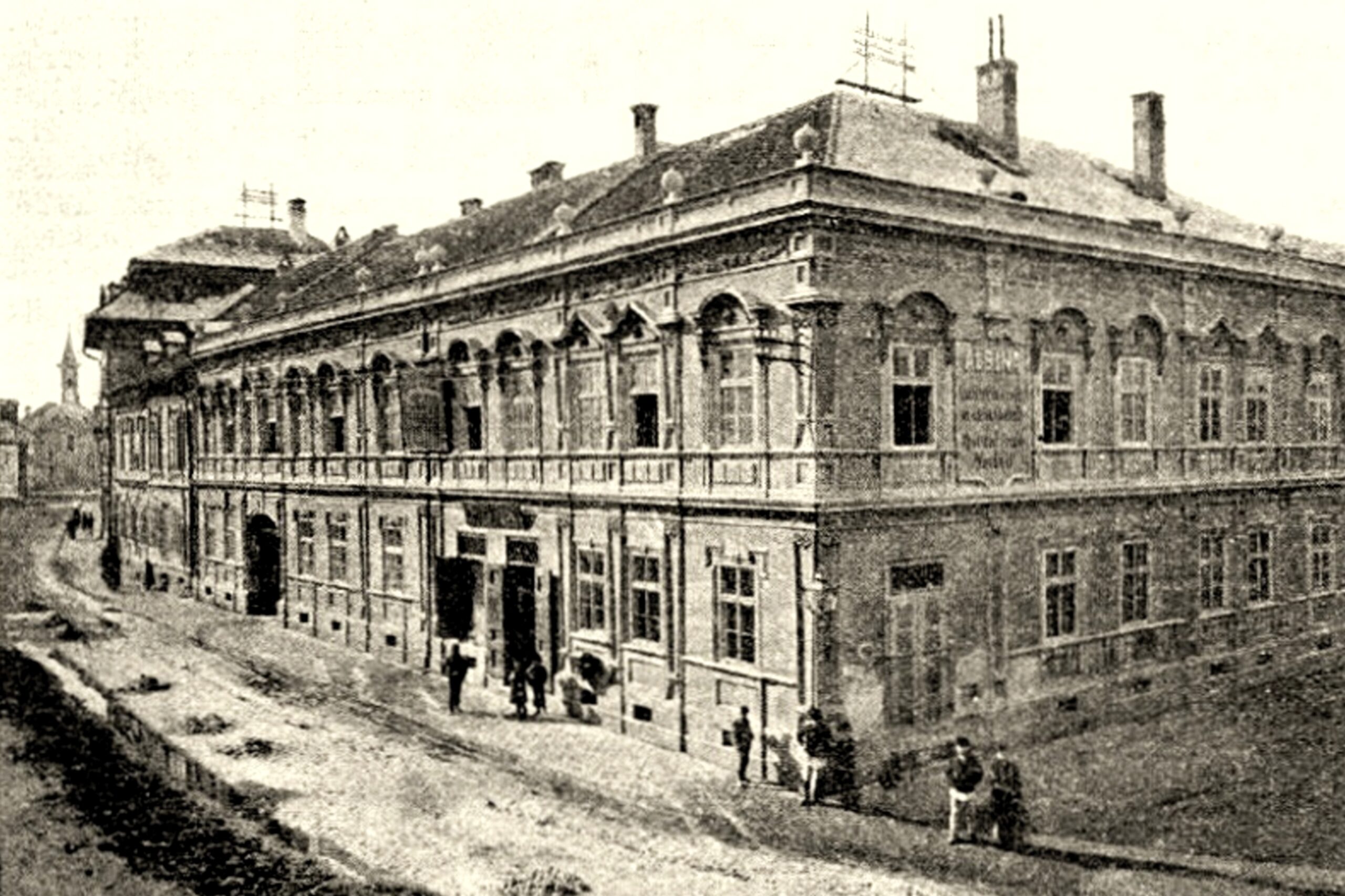 Cadrul desenului realizat de fotograful Theodor Glatz în 1854, corespunde vederii din piața gării,