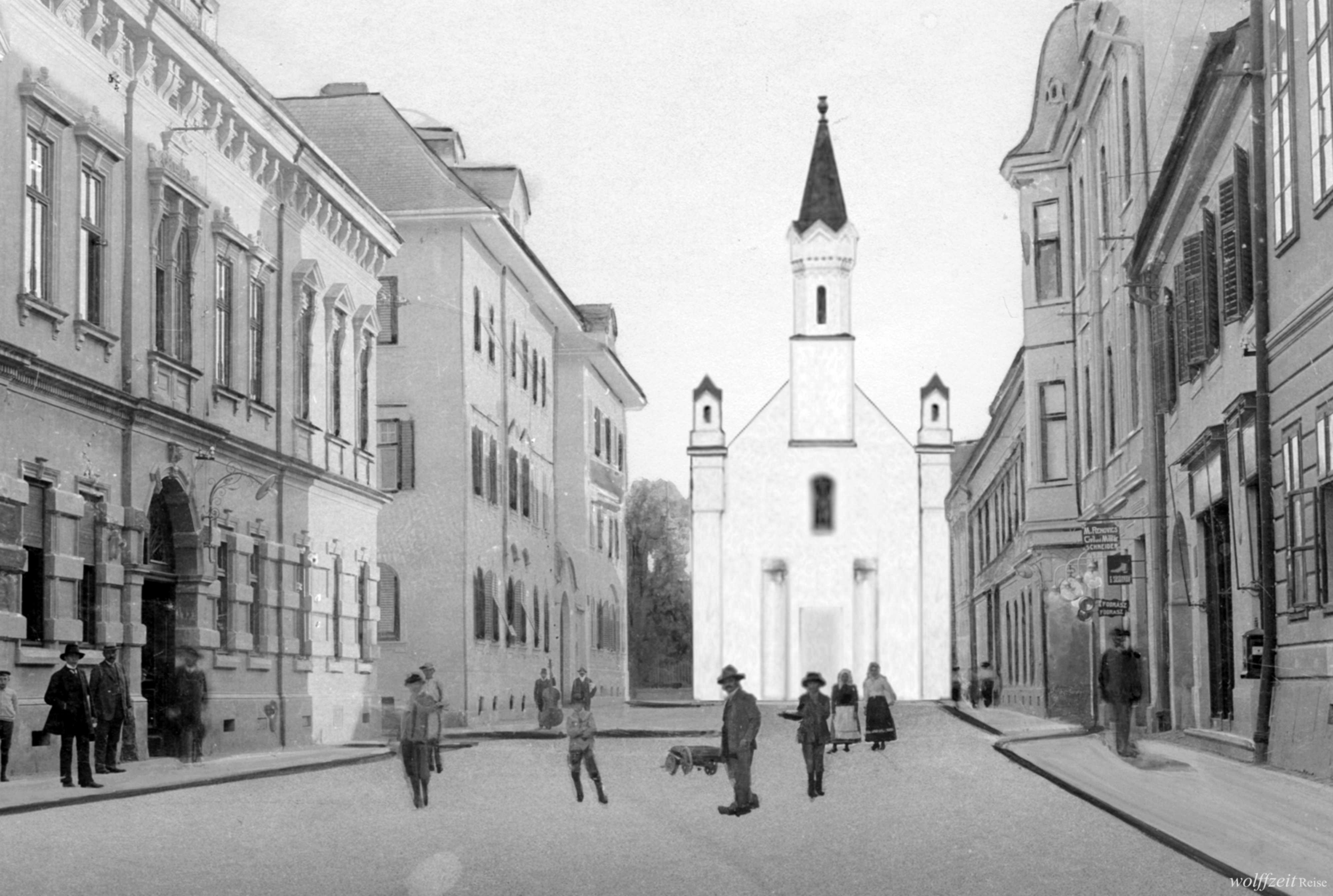 Acest instantaneu interesant a fost realizat în jurul anului 1909 în Piațeta Coroana // Krone situată în intersecția străzilor Turnului // Saggasse și Târgu Vinului // Weinanger.