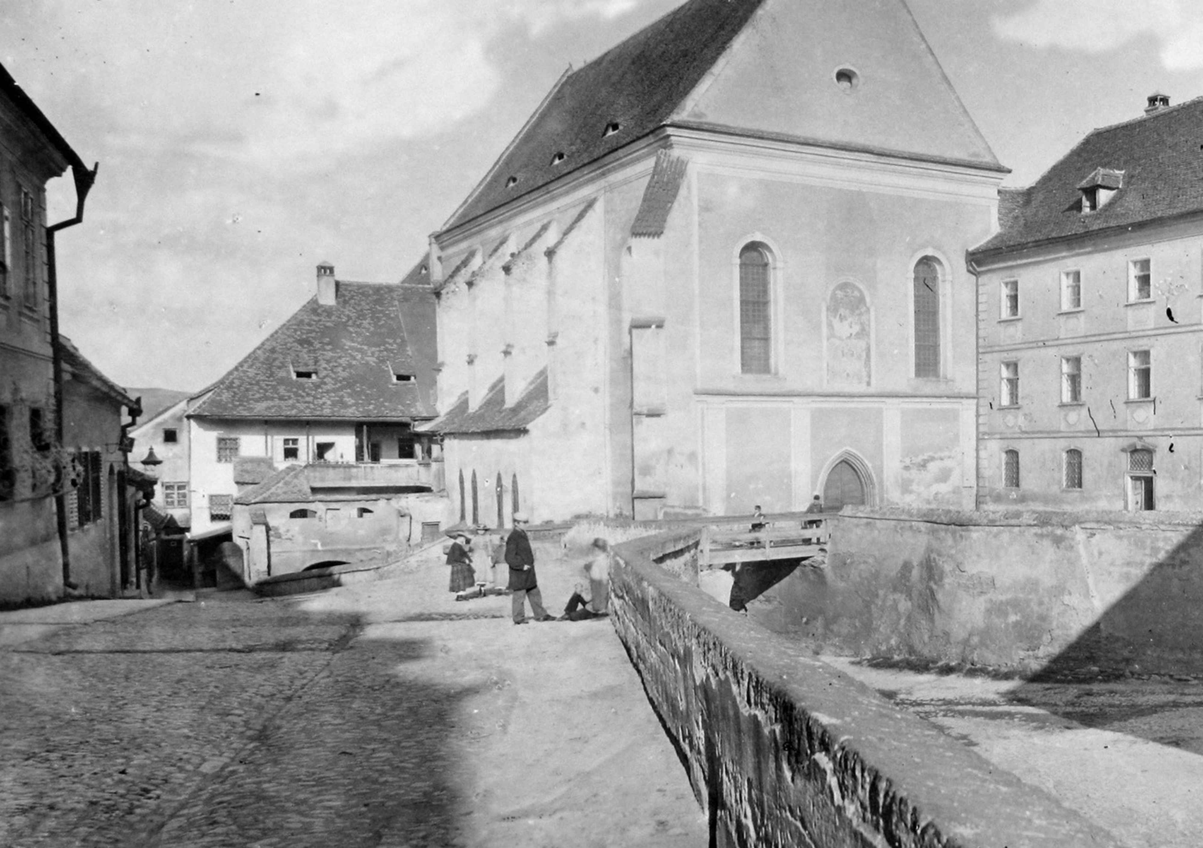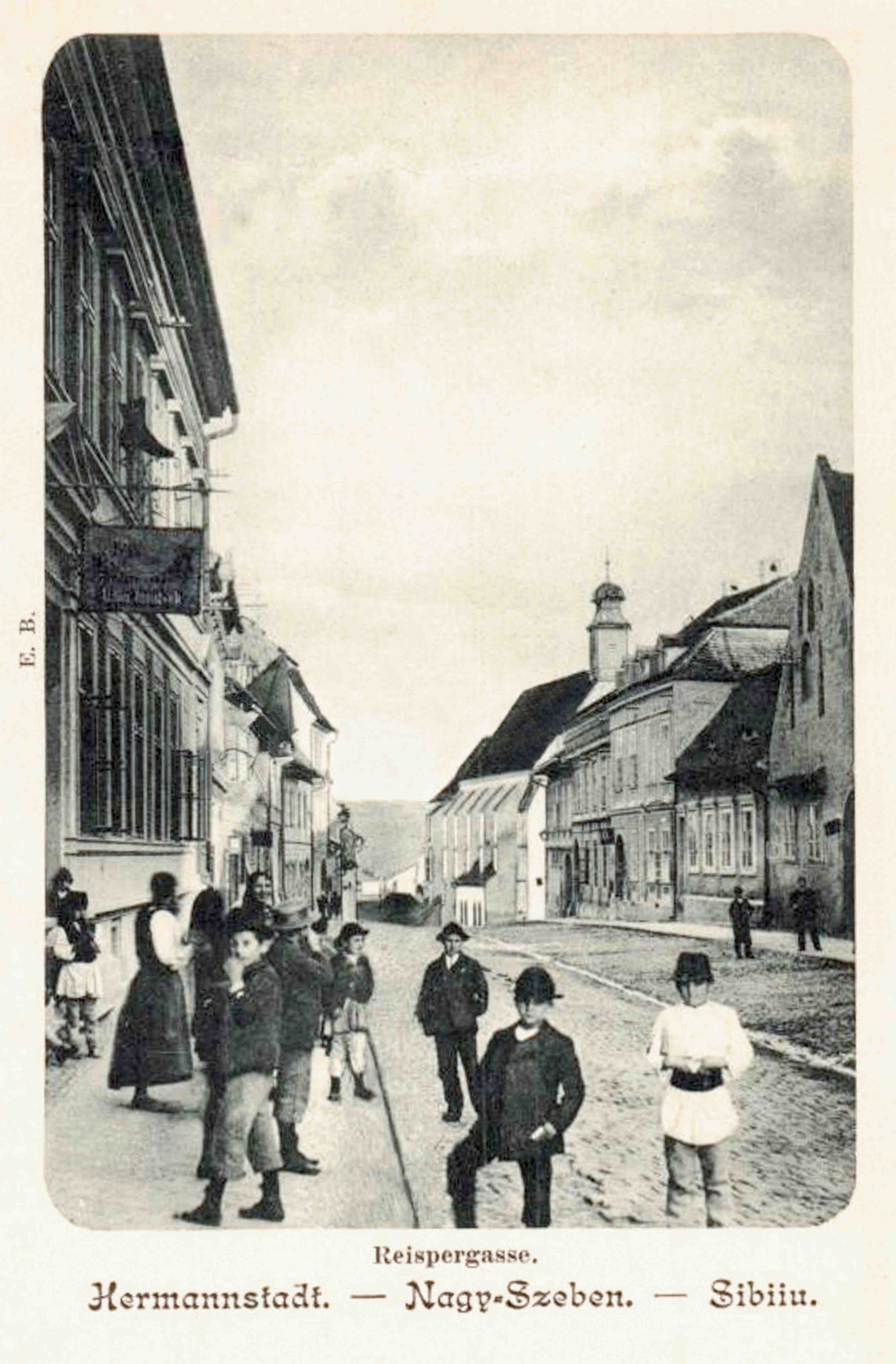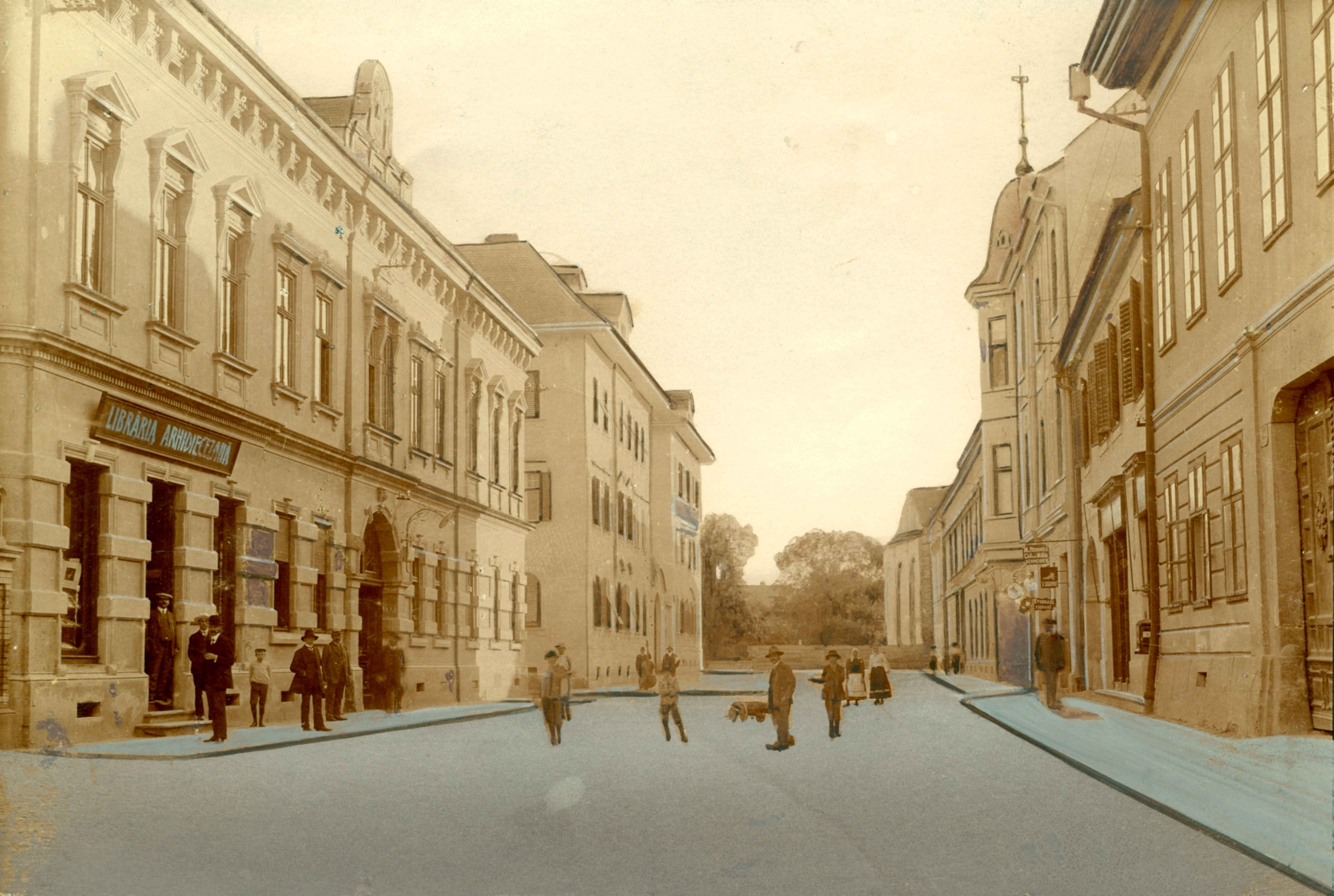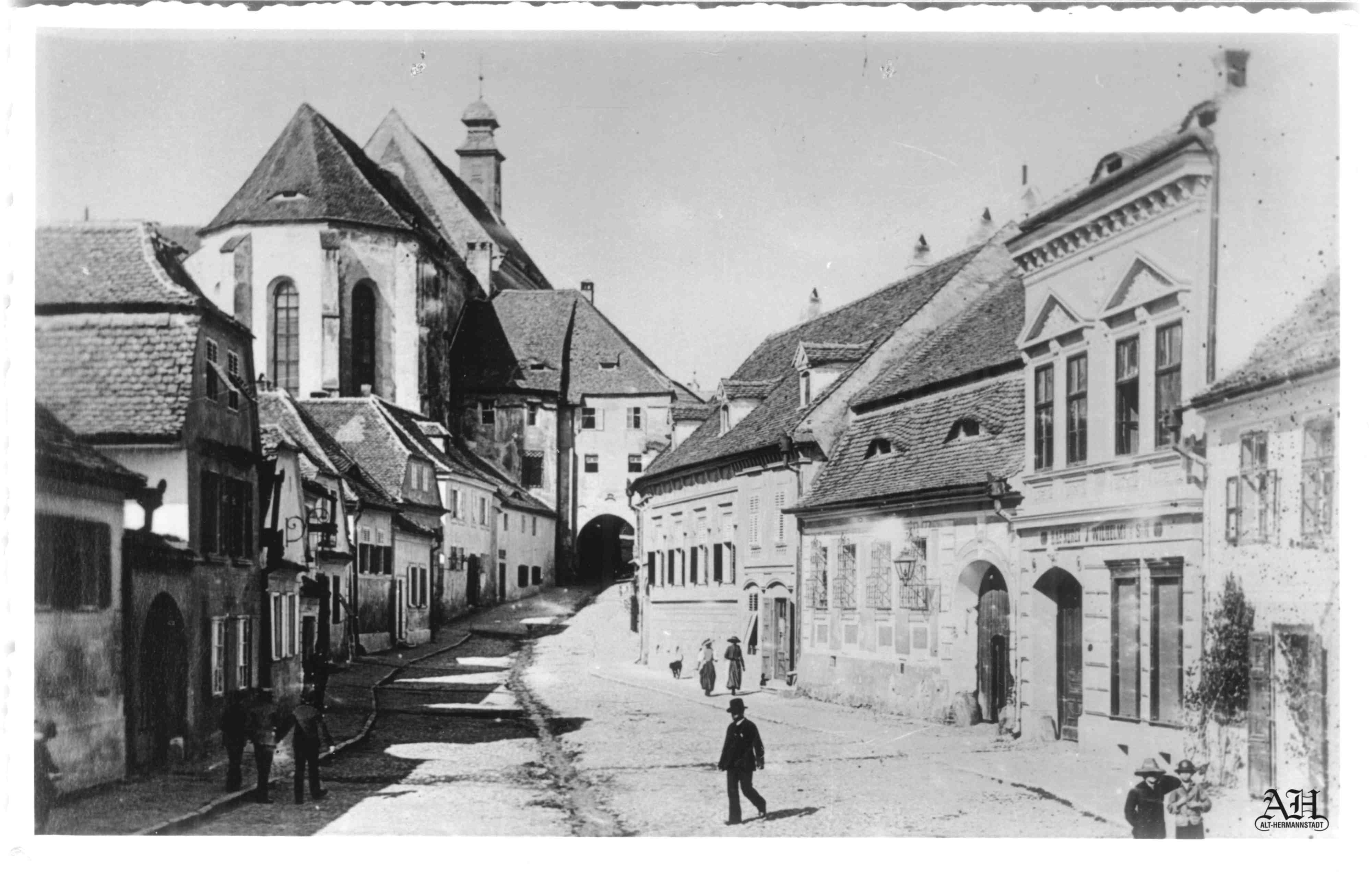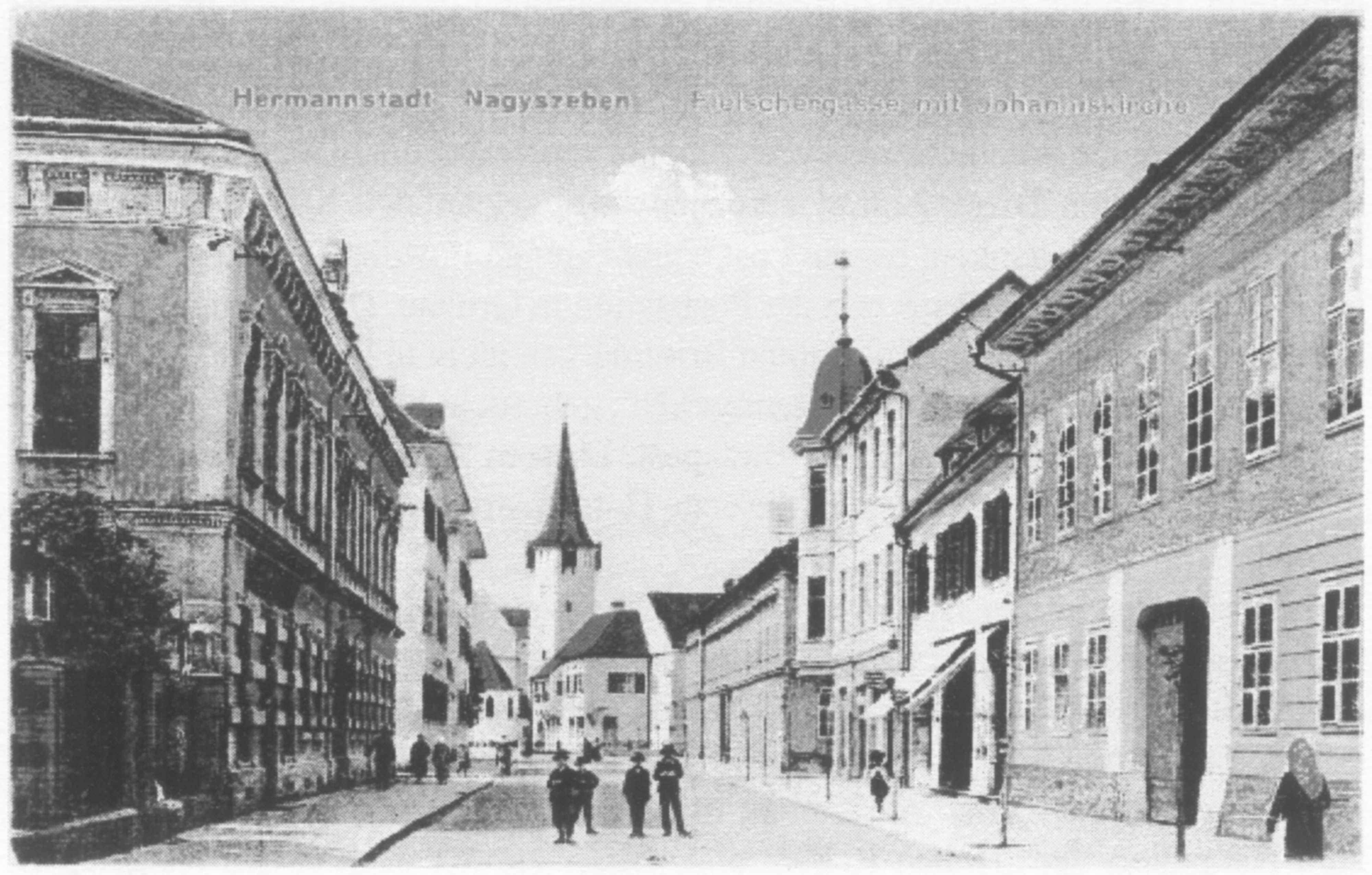 Instantaneu realizat într-o după-masă însorită pe strada Măcelarilor/ Mitropoliei // Fleischergasse // Mészáros utca la sfârșitul ultimului deceniu al secolului al XIX-lea în Sibiu. În fundal se vede statuia Sfântului Nepomuk din Piața Mare // Großer Ring // Nagy Piac. Ilustrație din arhiva grupului Alt-Hermannstadt.
