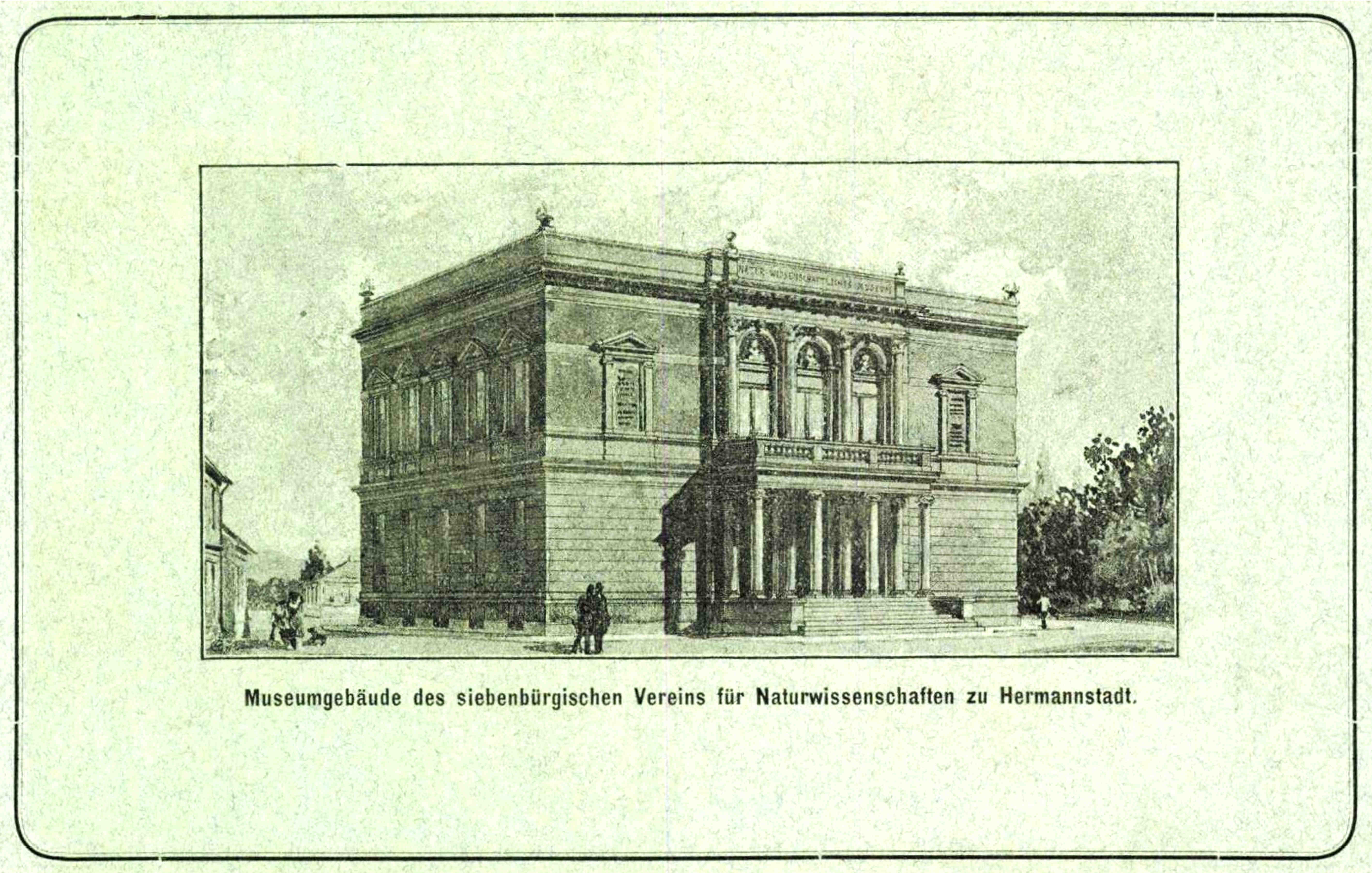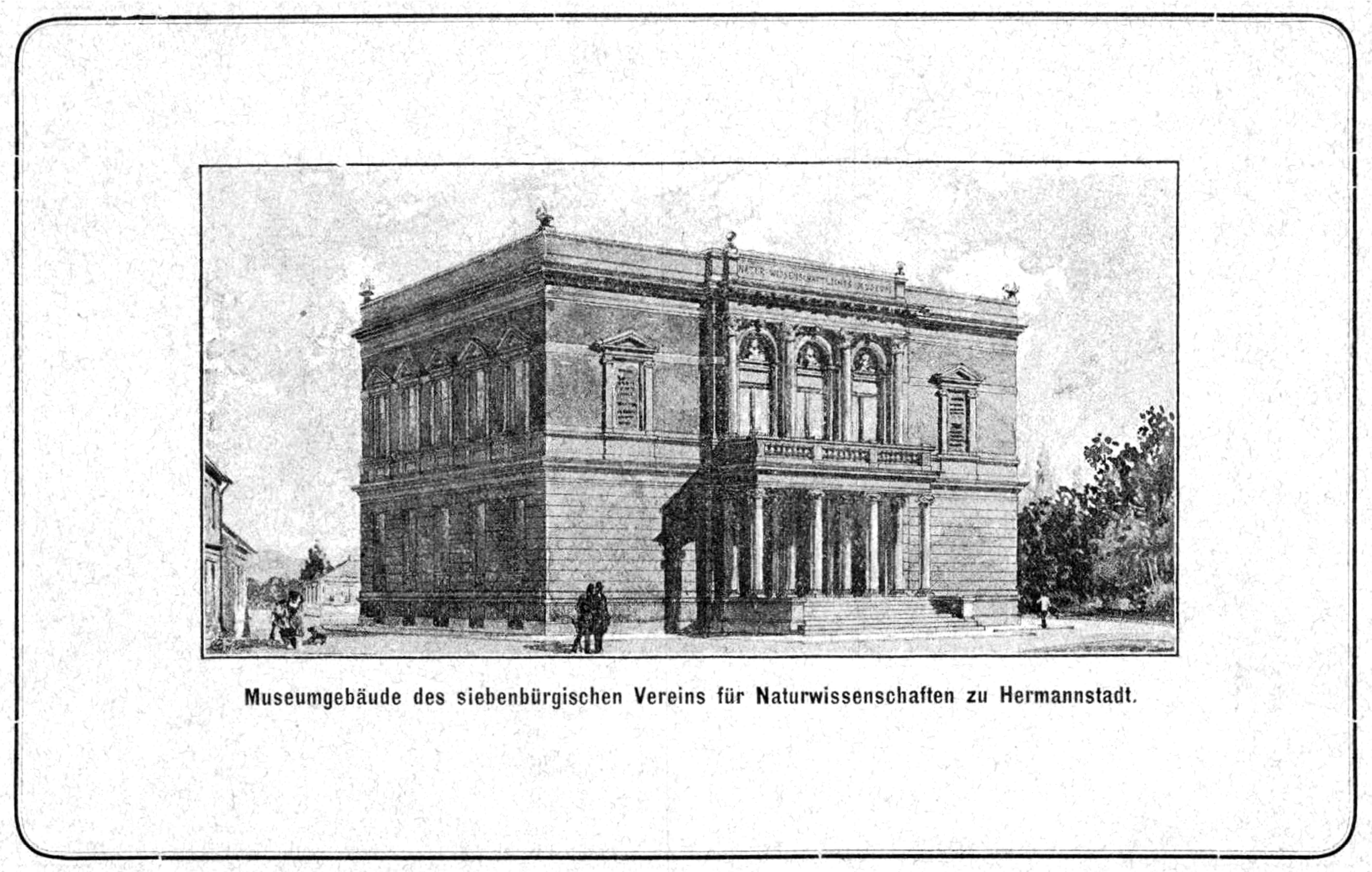 Clădirea cu destinaţia de muzeu și sediu al Societăţii Ardelene pentru Ştiinţele Naturii // Siebenbürgischer Verein für Naturwissenschaften. A fost inaugurată la 12 mai 1895. În discursul festiv Eduard Albert Bielz, pe vremea aceea președintele societății, și-a exprimat dorința ca noul muzeu: „…să devină un cămin pentru cele mai zeloase cercetări în toate domeniile istoriei naturale locale și un sălaș de studii științifice serioase, precum și un punct de plecare pentru răspândirea cunoștințelor caritabile.” // „…dass es eine Heimstätte eifrigster Forschung auf allen Gebieten der vaterländischen Naturkunde und ein Hort ernster wissenschaftlicher Studien, als auch ein Ausgangspunkt der Verbreitung gemeinnütziger Kenntnisse werde“!Versiune editată alb-negru