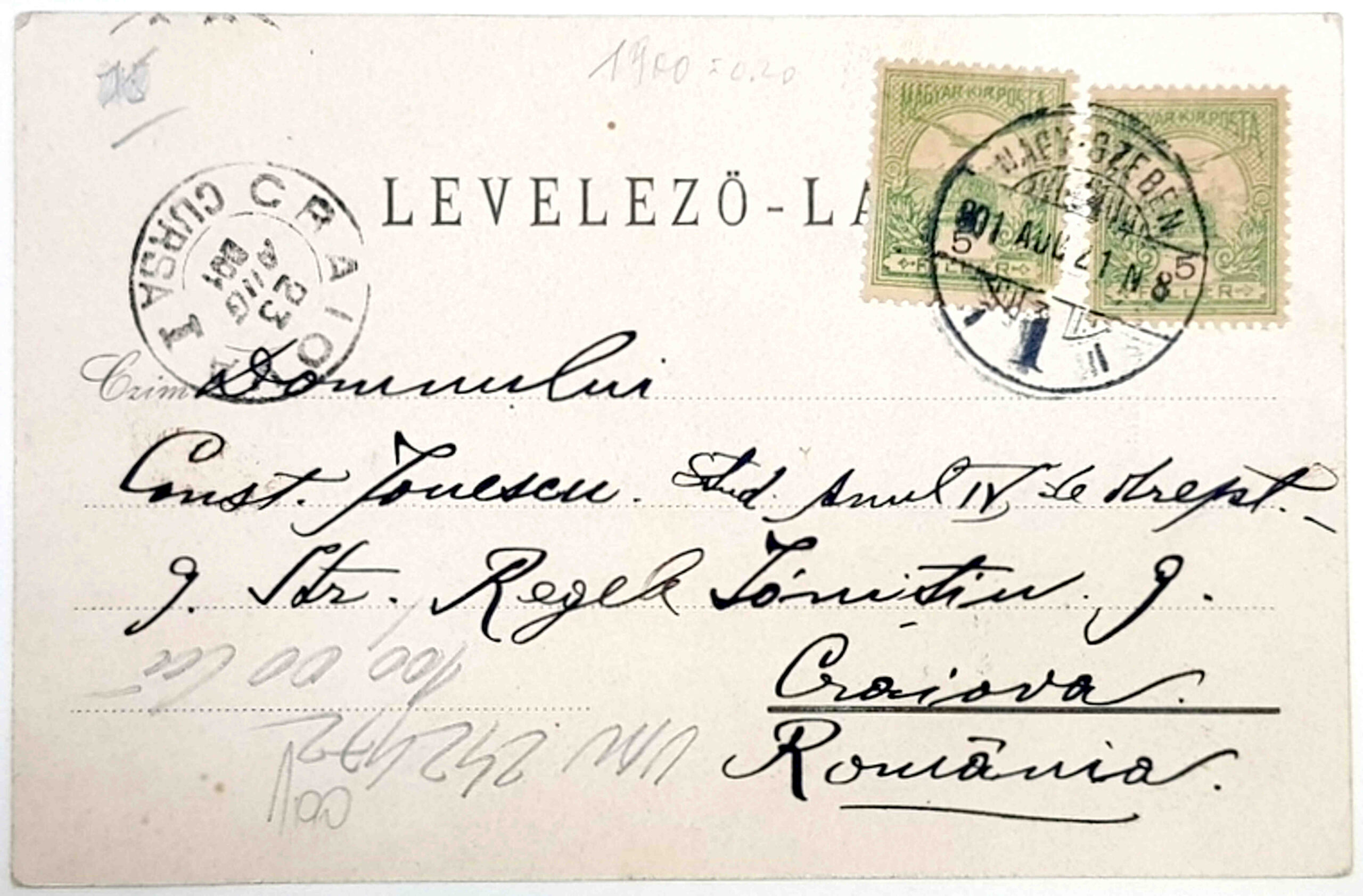 Cartea poștală tip LEVELEZÖ-LAP este semnată cu Iulică și adresată domnului Constantin Ionescu, str. Regele Ionițiu nr.9. Craiova. Cu toate că este datată 8 august 1901, a fost expediată abia în 21 august și a ajuns la Craiova pe 23 august.