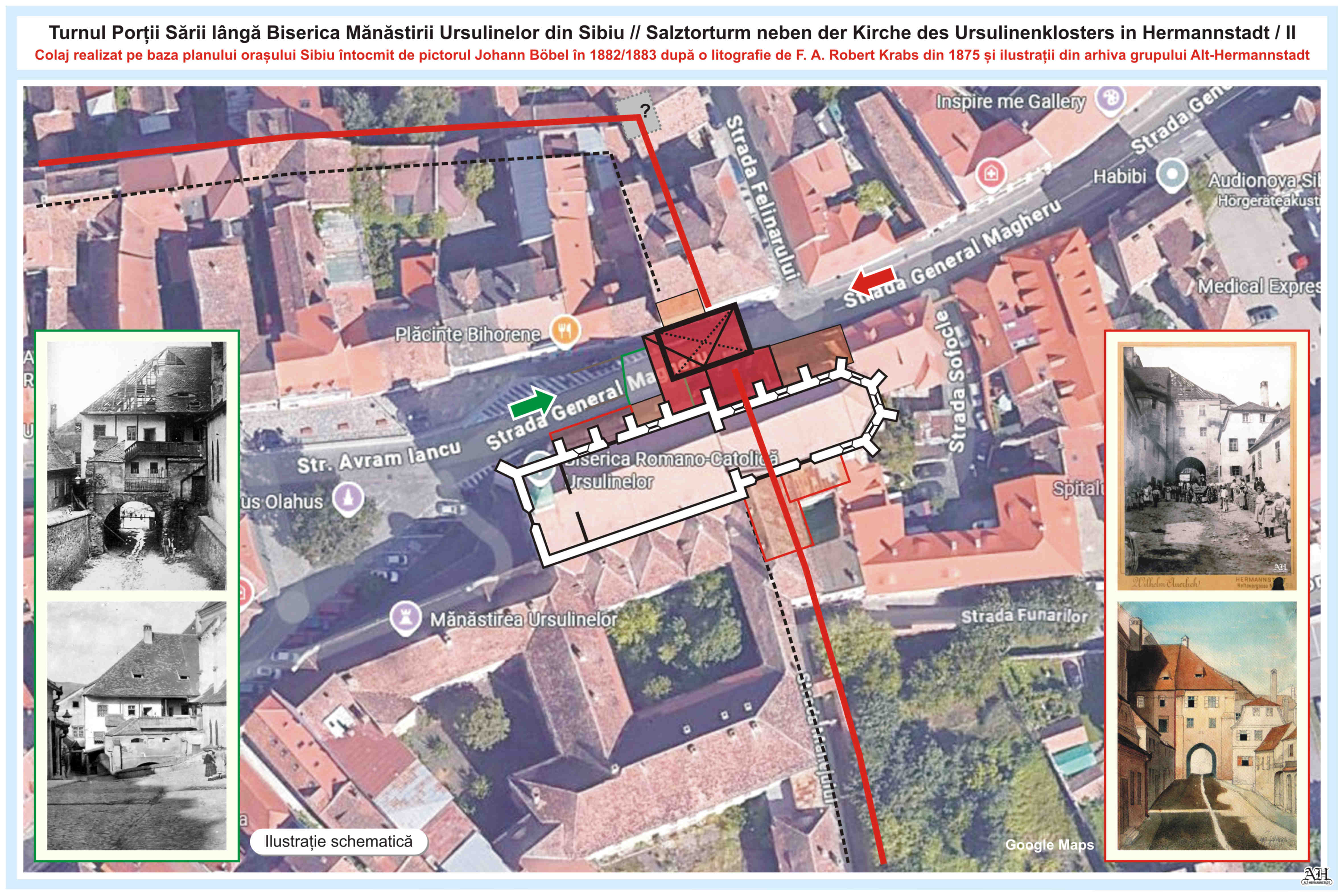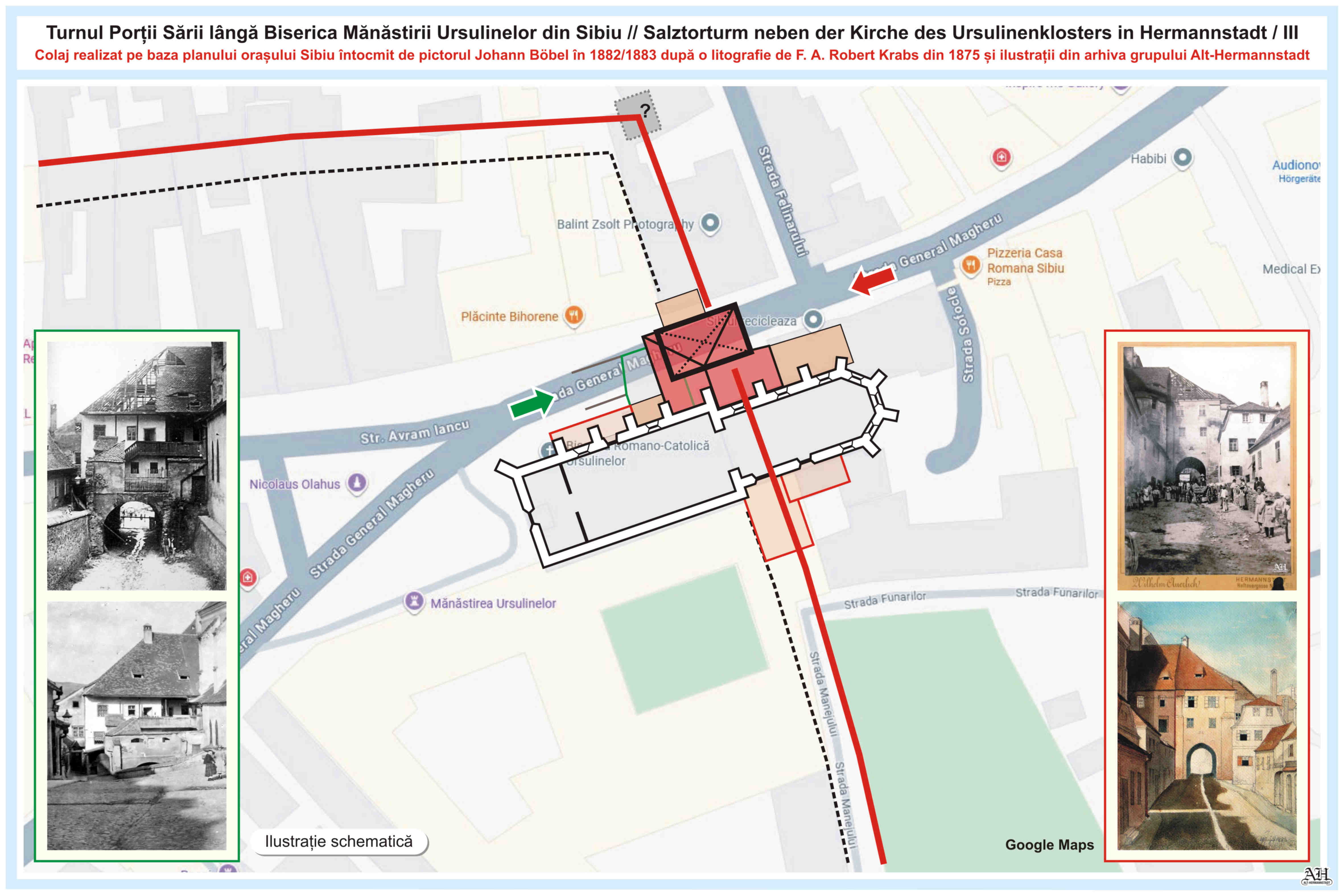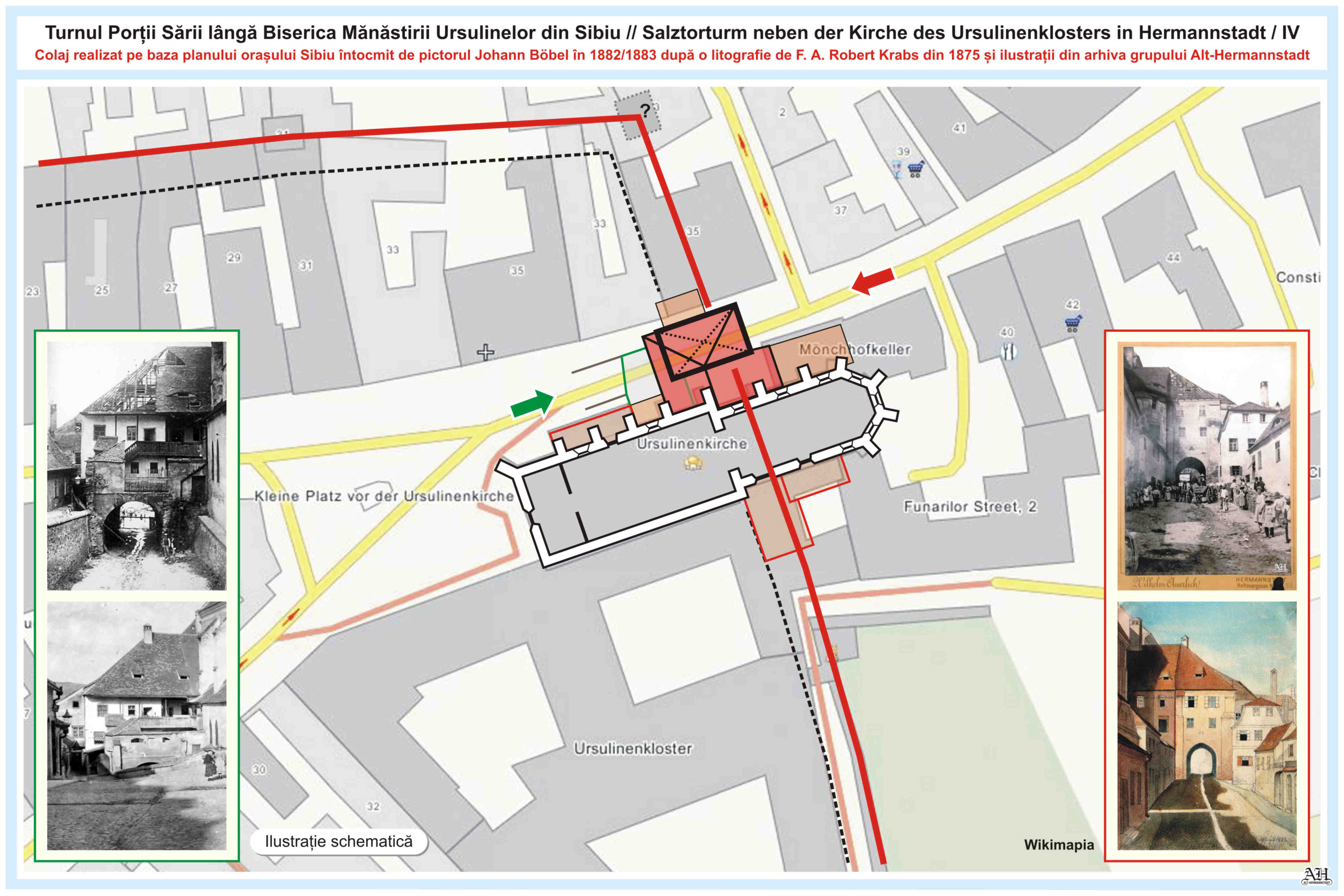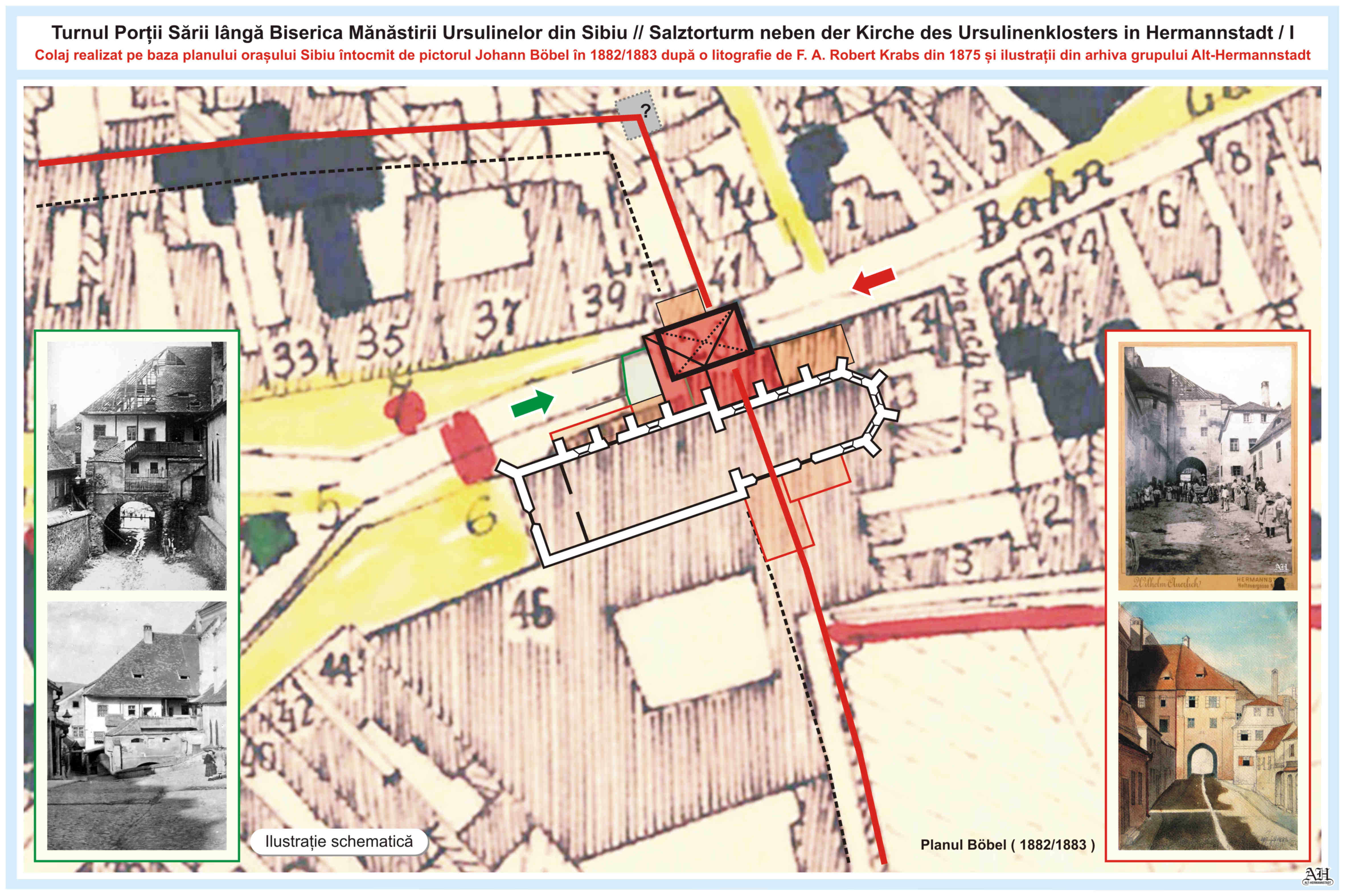 Dreapta: Planșa 14 din Albumul lui Johann Böbel, „Die vormals bestanndenen Stadt-Thore von Hermannstadt nach der Natur gezeichnet” // „Porțile din Sibiu odinioară existente după natură desenate”. Albumul a fost menționat prima dată în anul 1887. Cronicarul, cartograful și pictorul Johann Böbel s-a născut 1824 la Sibiu, unde a trăit și a decedat la 27 aprilie 1887.~~~o~~~