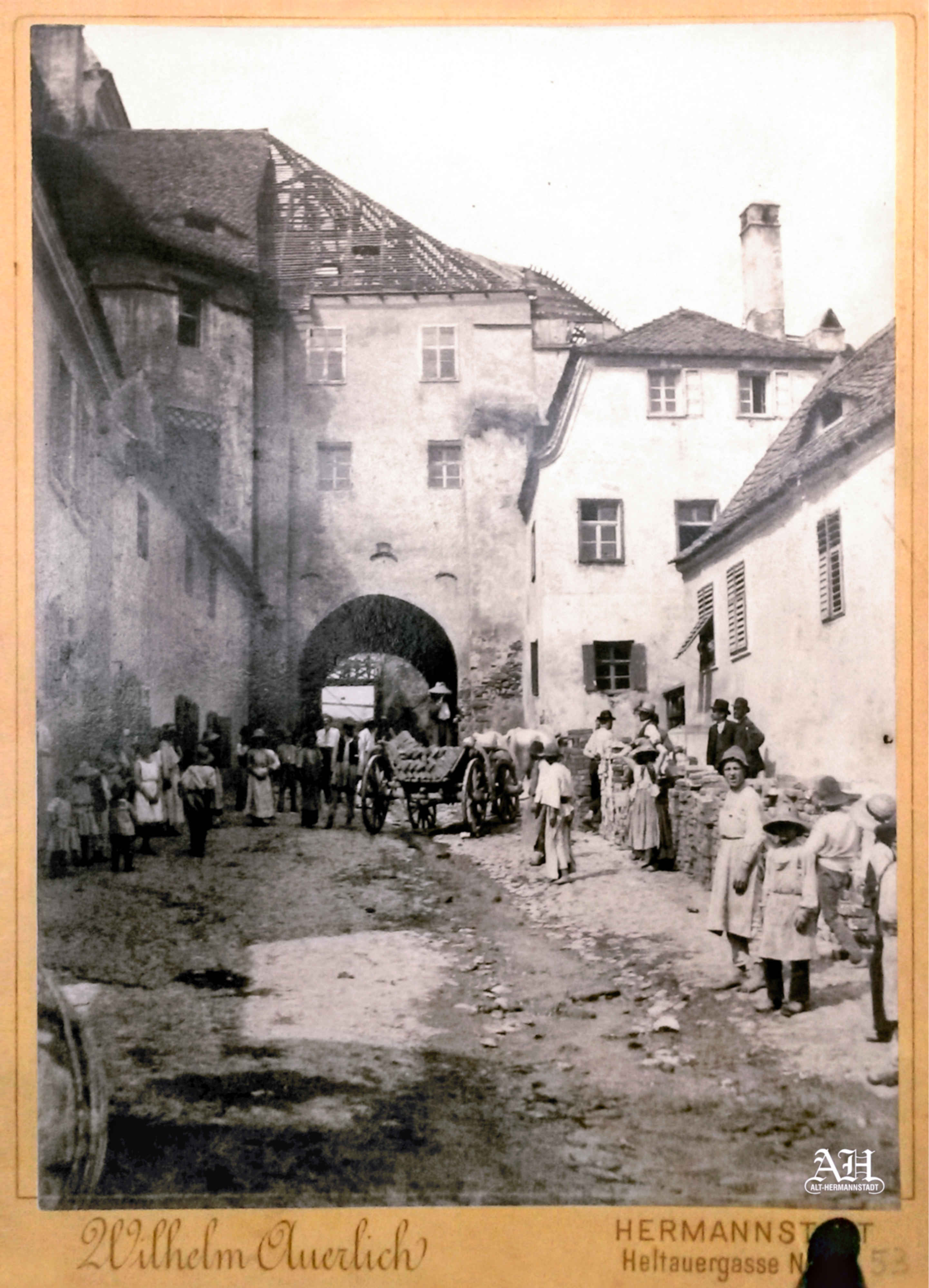 Fotografia folosită pentru ilustrație arată Turnul Sfatului ( germană: Raththurm, ungurește: Tanácstorony ) din Sibiu cu trecerea boltită din Piața Mare // Großer Ring // Nagypiac spre Piața Mică // Kleiner Ring // Kispiac fotografiat la sfârșitul ultimului deceniu al secolului al XIX-lea.Vechiul ceas, stricat, de pe Turnul Sfatului a fost înlocuit în 1906 cu un ceas nou, iluminat pe timp de noapte, construit de firma lui Johann Ignaz Fuchs „J. I. Fuchs & Söhne” din Bernburg. Al doilea gang de trecere spre Piața Mică a fost amenajat la începutul anilor 1930 prin clădirea, Piața Mare nr.1, vizibilă în partea stângă a turnului. Ilustrație din arhiva grupului de Facebook Alt-Hermannstadt.