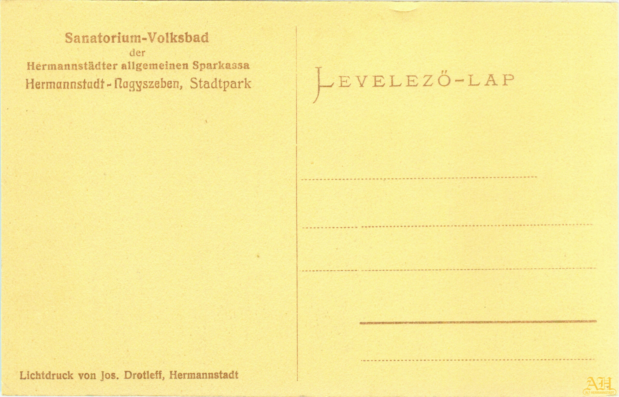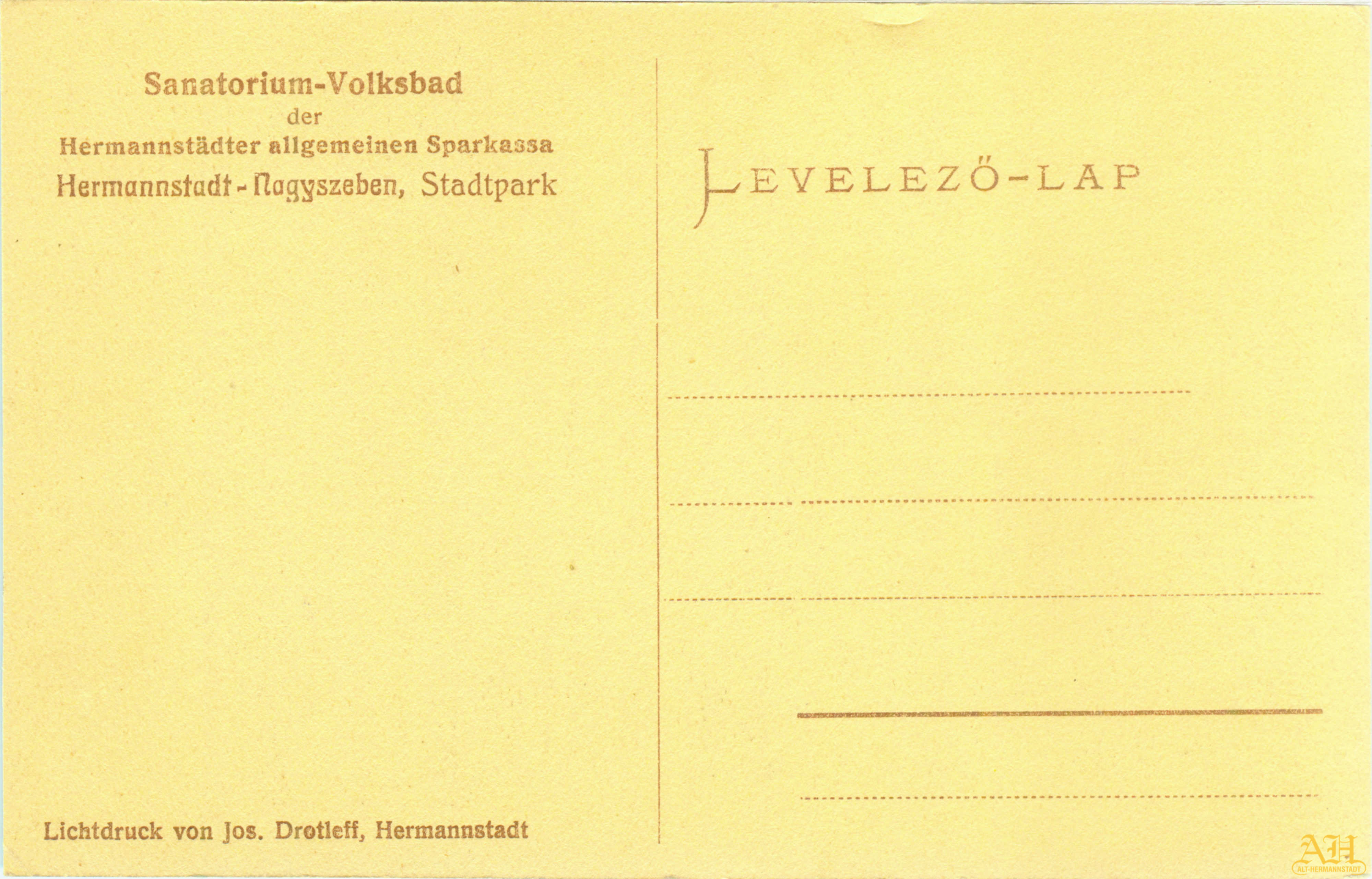„Sanatorium – Volksbad der Hermannstädter Allgemeinen Sparkassa” // „Sanatoriul – Baia publică a Casei Generale de Economii din Sibiu”