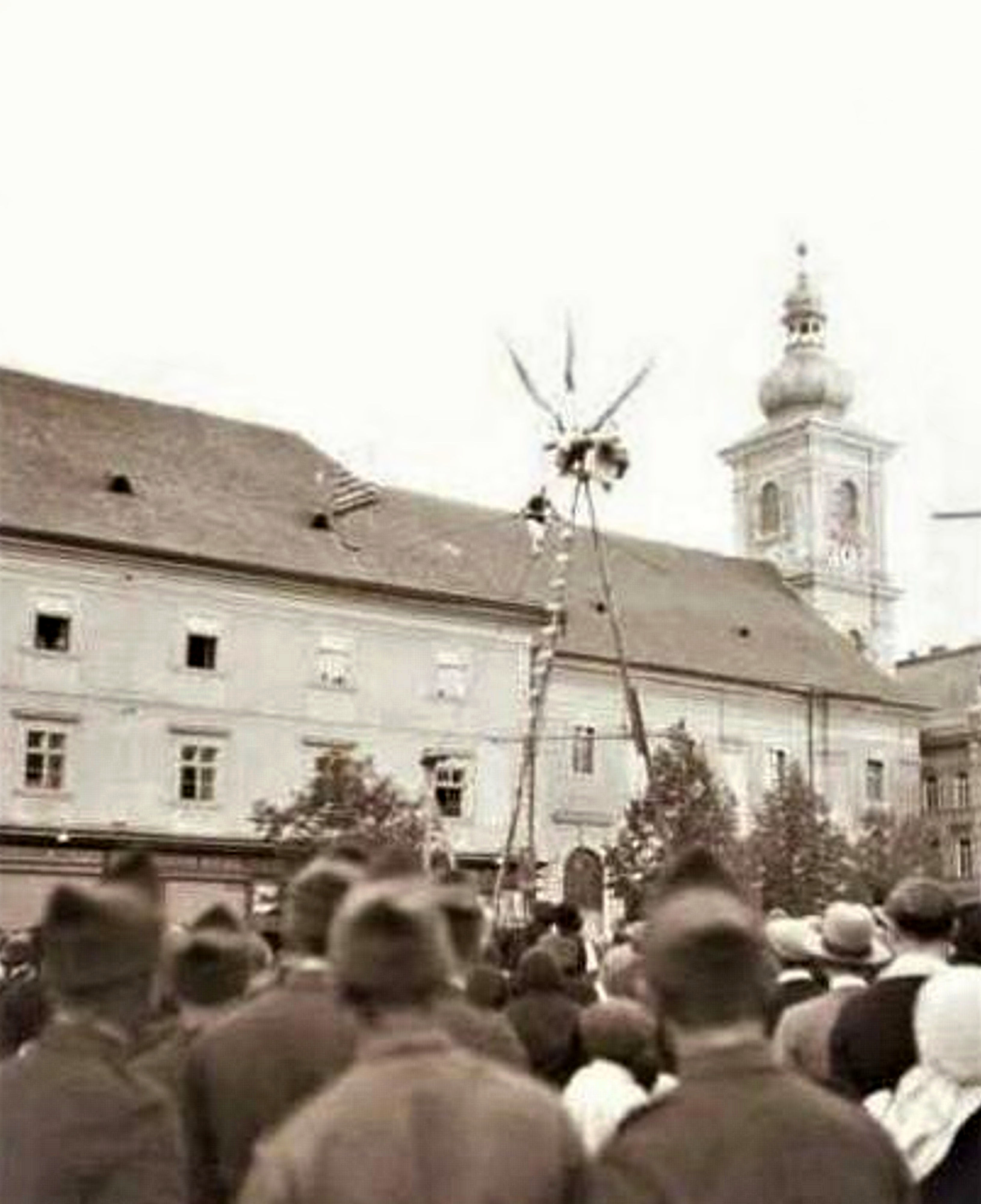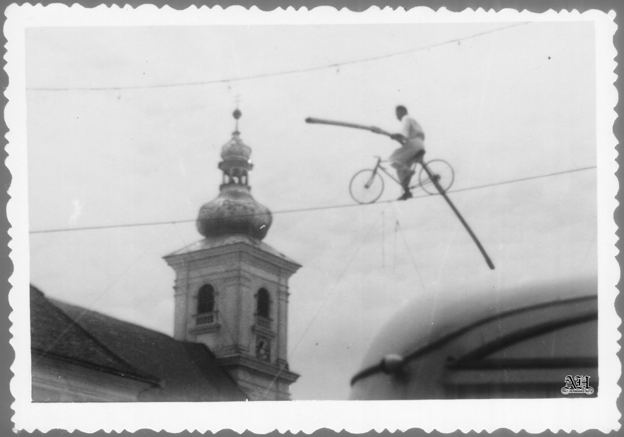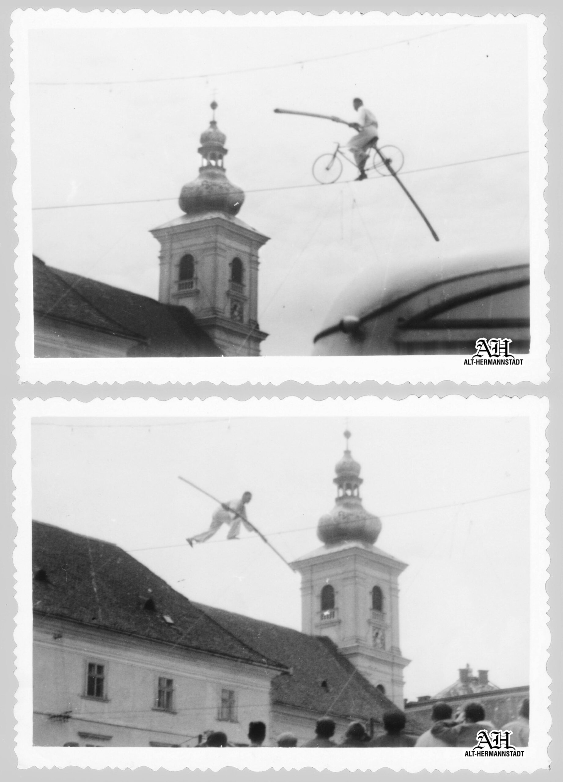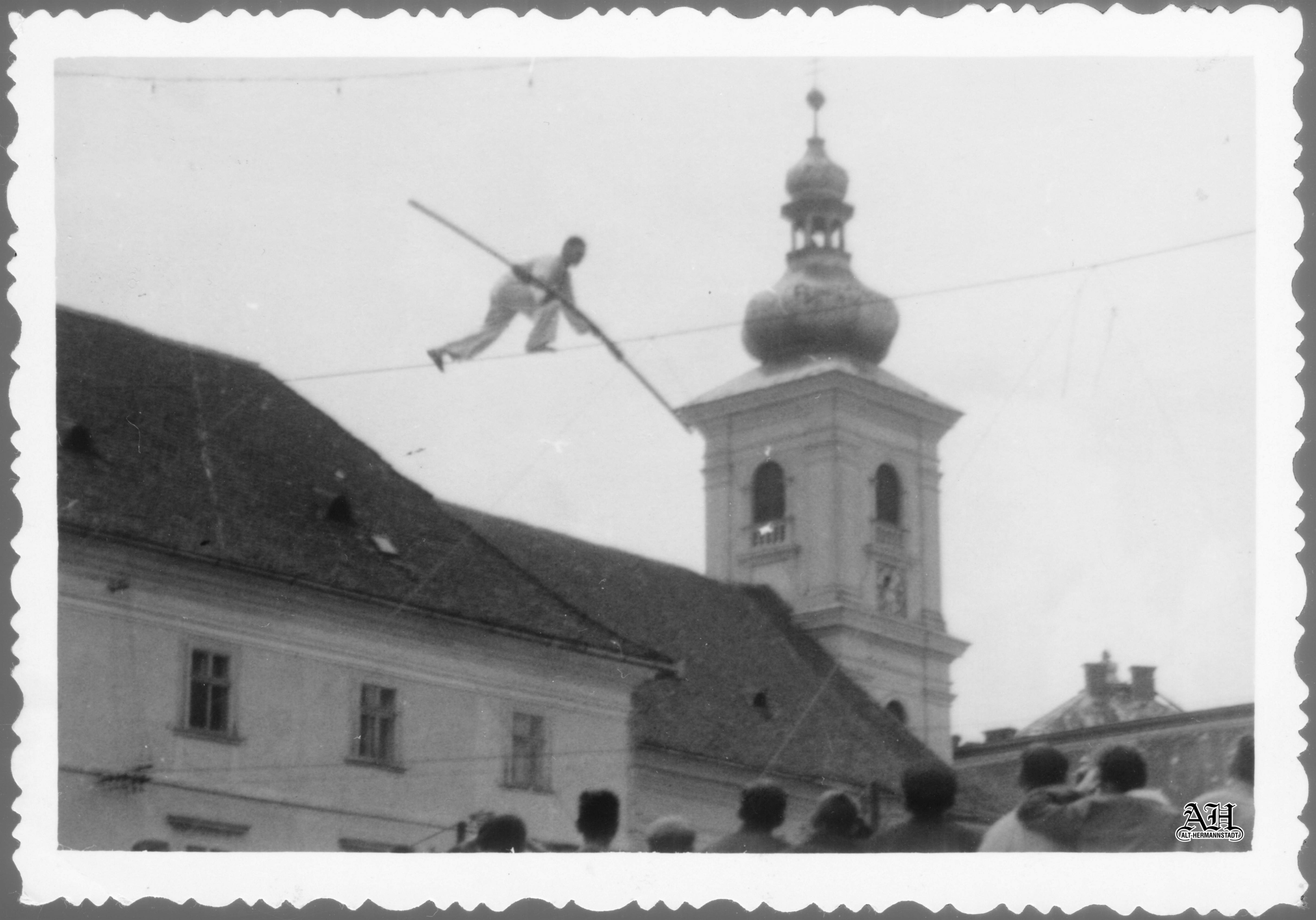 Artistul imortalizat în cele două fotografii alb-negru nu este renumitul acrobat pe sârmă Arthur Strohschneider, care, într-adevăr, a oferit locuitorilor sibieni o reprezentație artistică pe sârmă în același loc în Piața Mică, însă cu câteva decenii mai devreme, în 1933!~~~o~~~