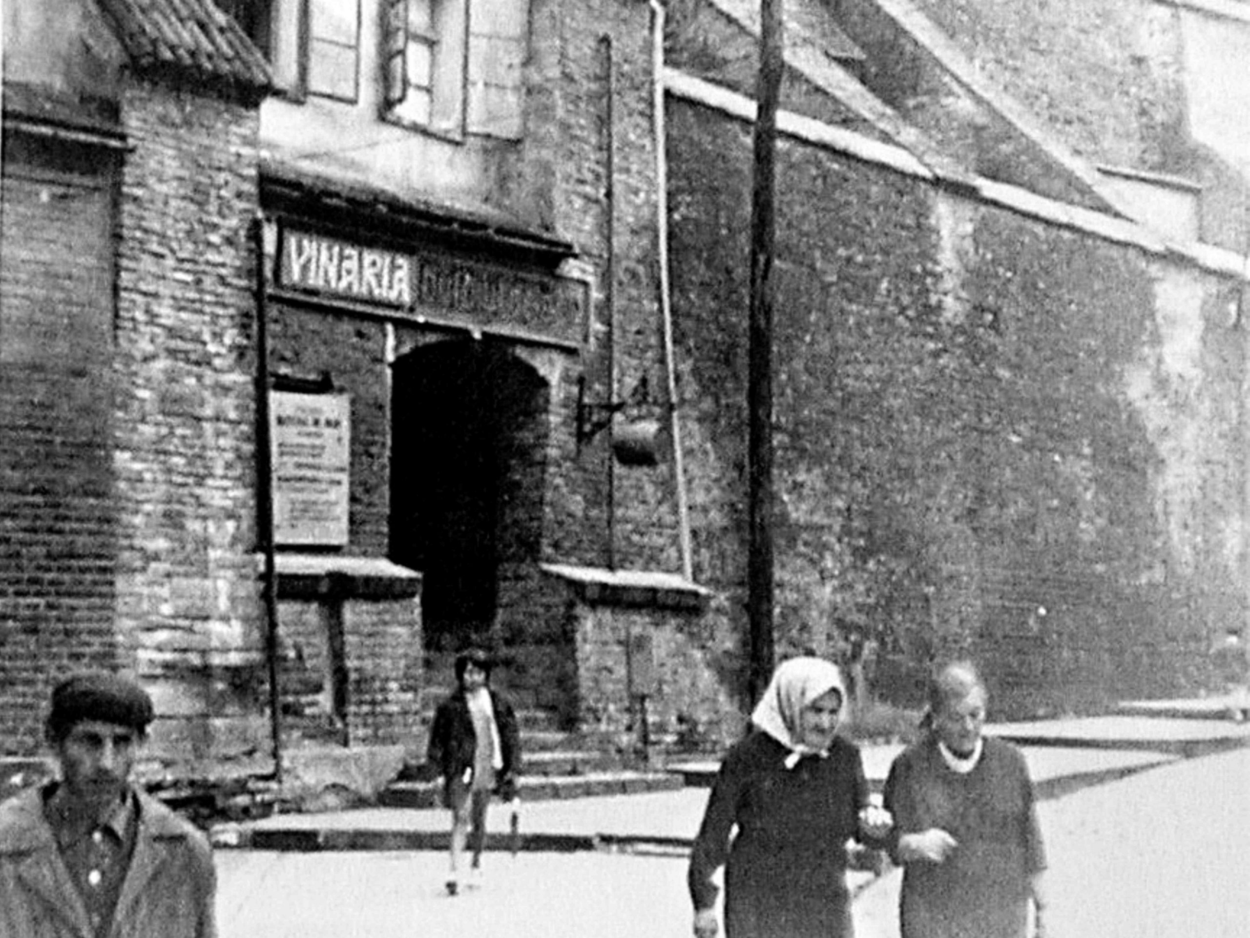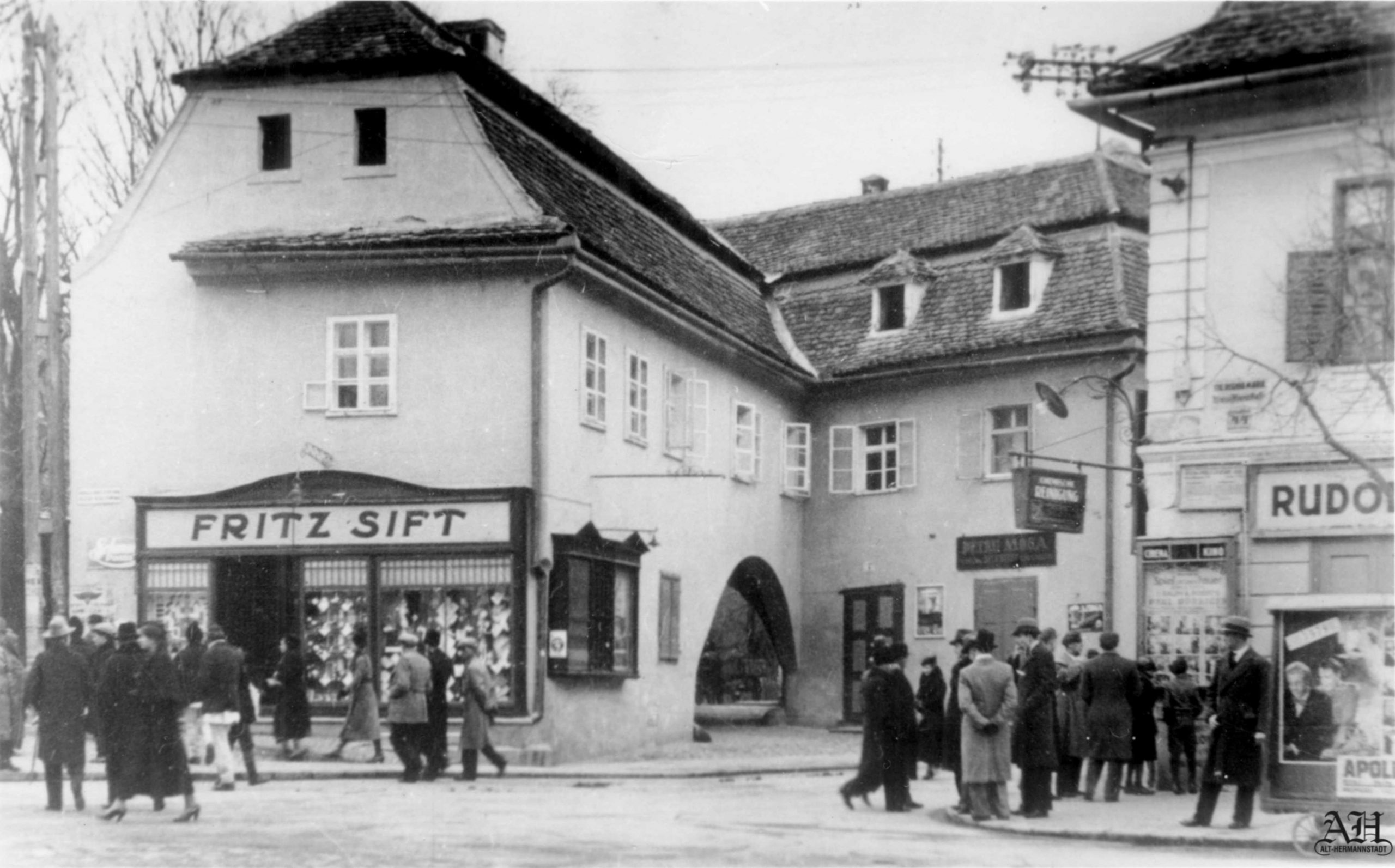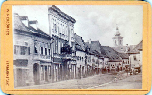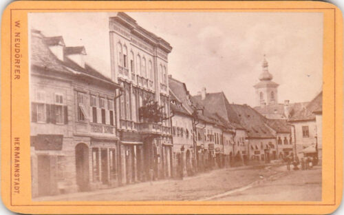 Dreapta: Strada Fleischergasse // Măcelarilor / Mitropoliei fotografiată de fotograful sibian Emil Fischer în primul deceniu al secolului al XX-lea (aproximativ 1905).Strada Fleischergasse // Măcelarilor / Mitropoliei fotografiată de fotograful sibian Emil Fischer în primul deceniu al secolului al XX-lea (aproximativ 1905). Detaliu sepia și alb-negru cu magazinul lui Victor Onițiu.