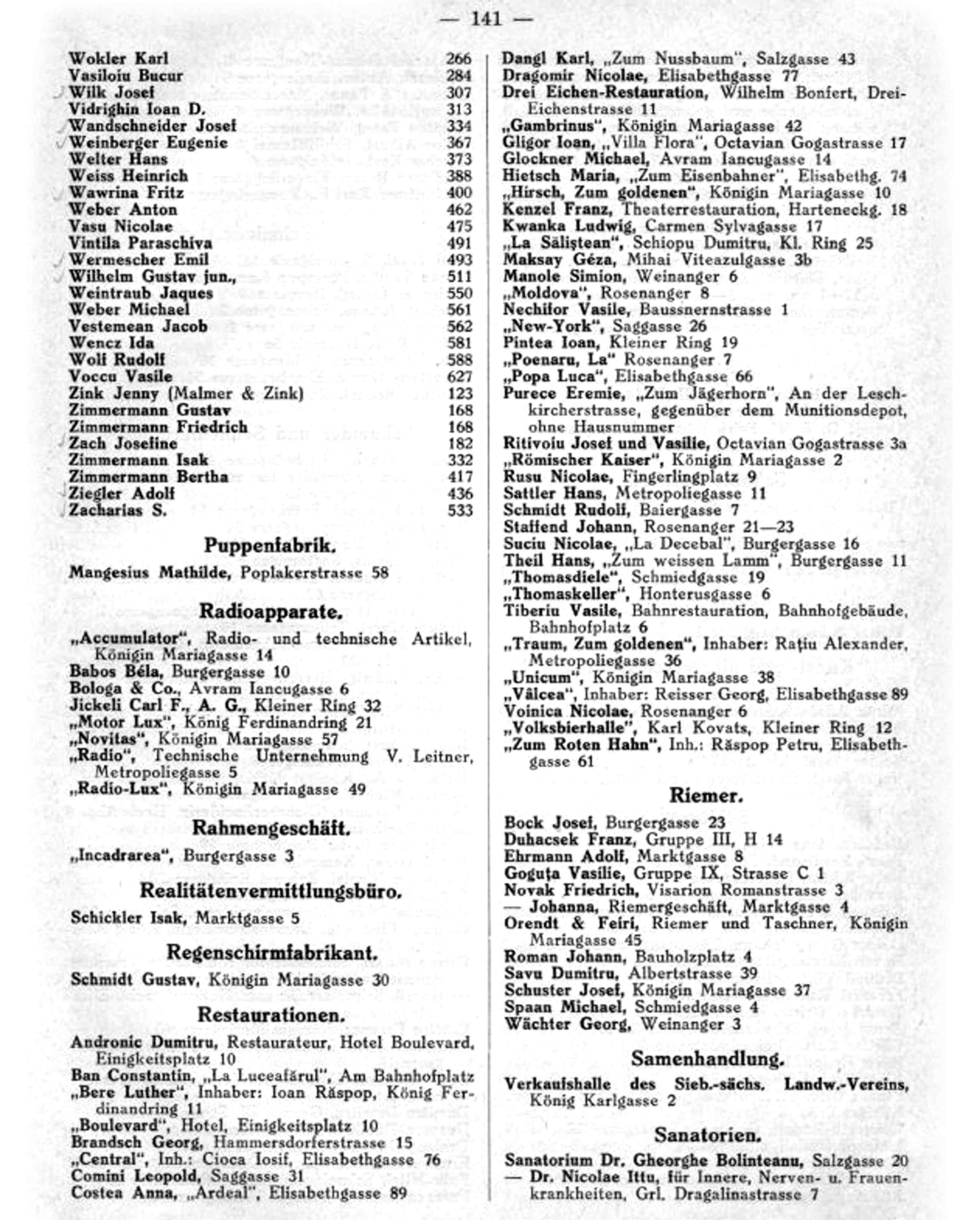 Niedlich Michael – Dreieichenstrasse 11 / „Restaurationen” (Șoseaua Trei Stejari 11 / carte de adrese 1911).