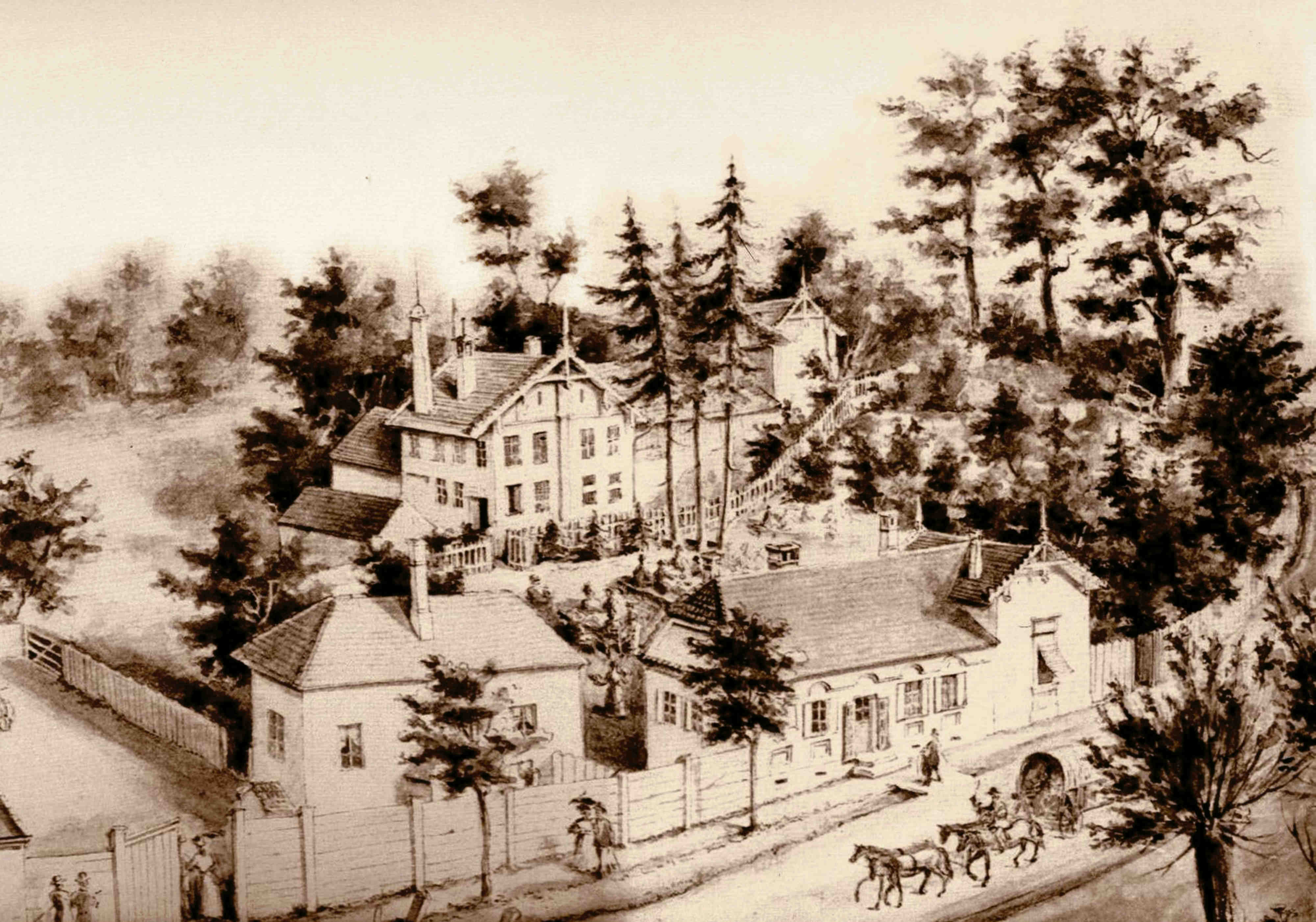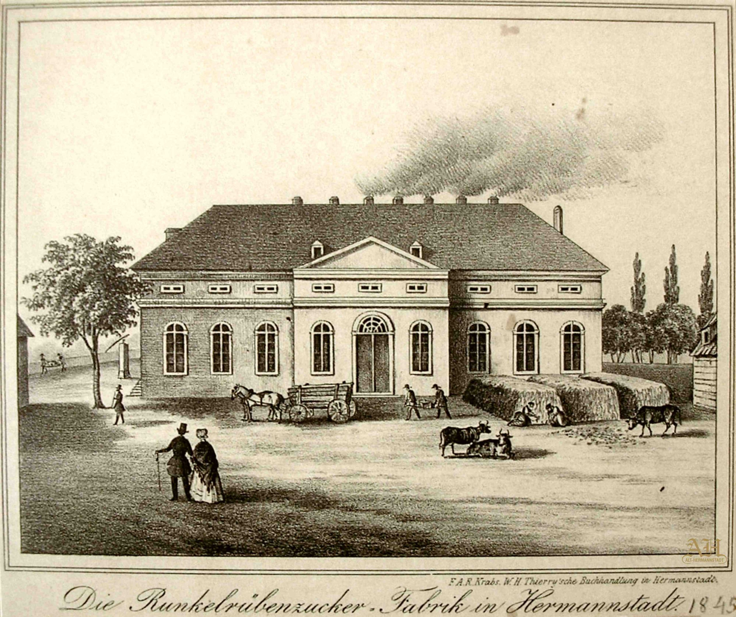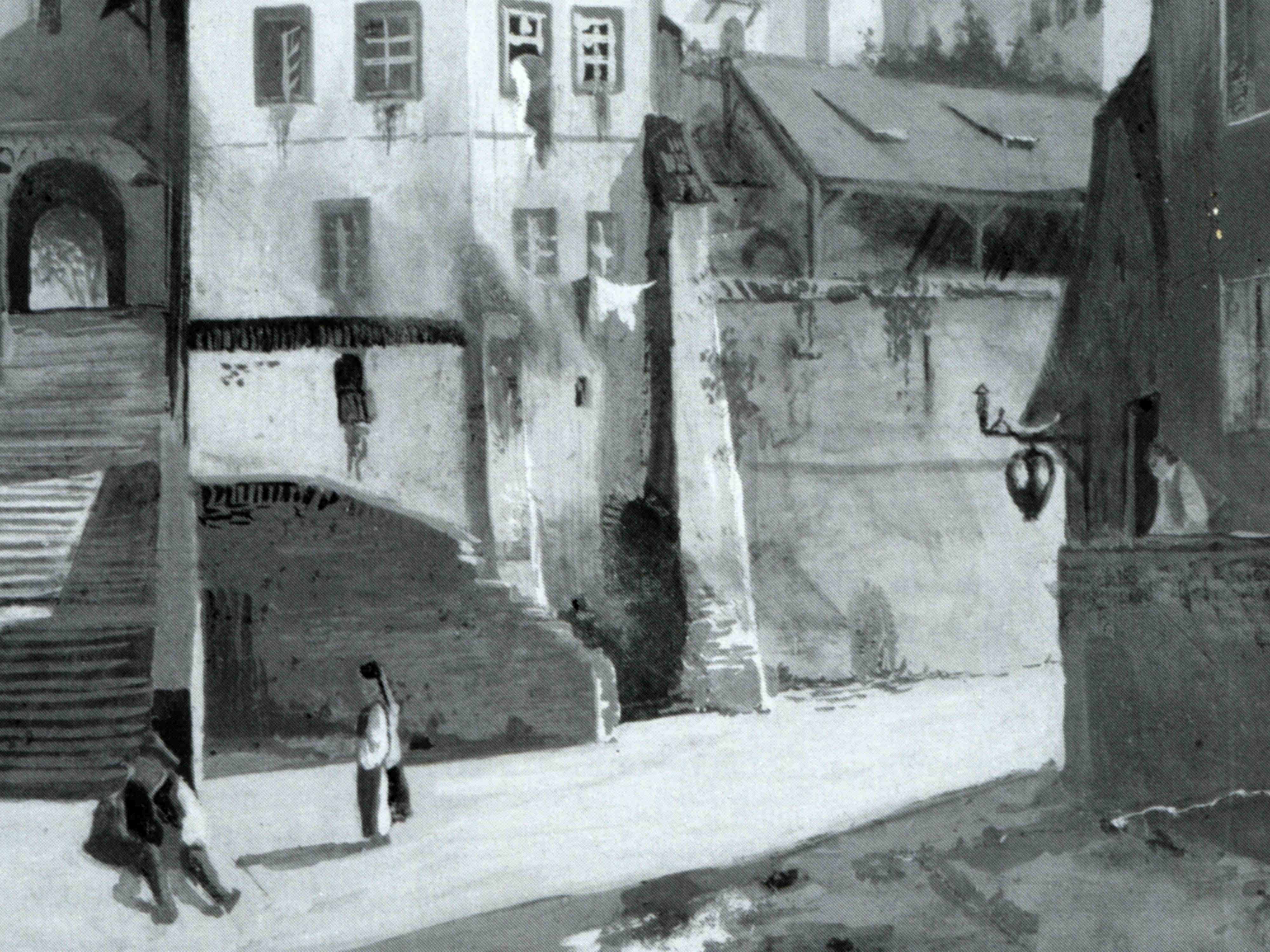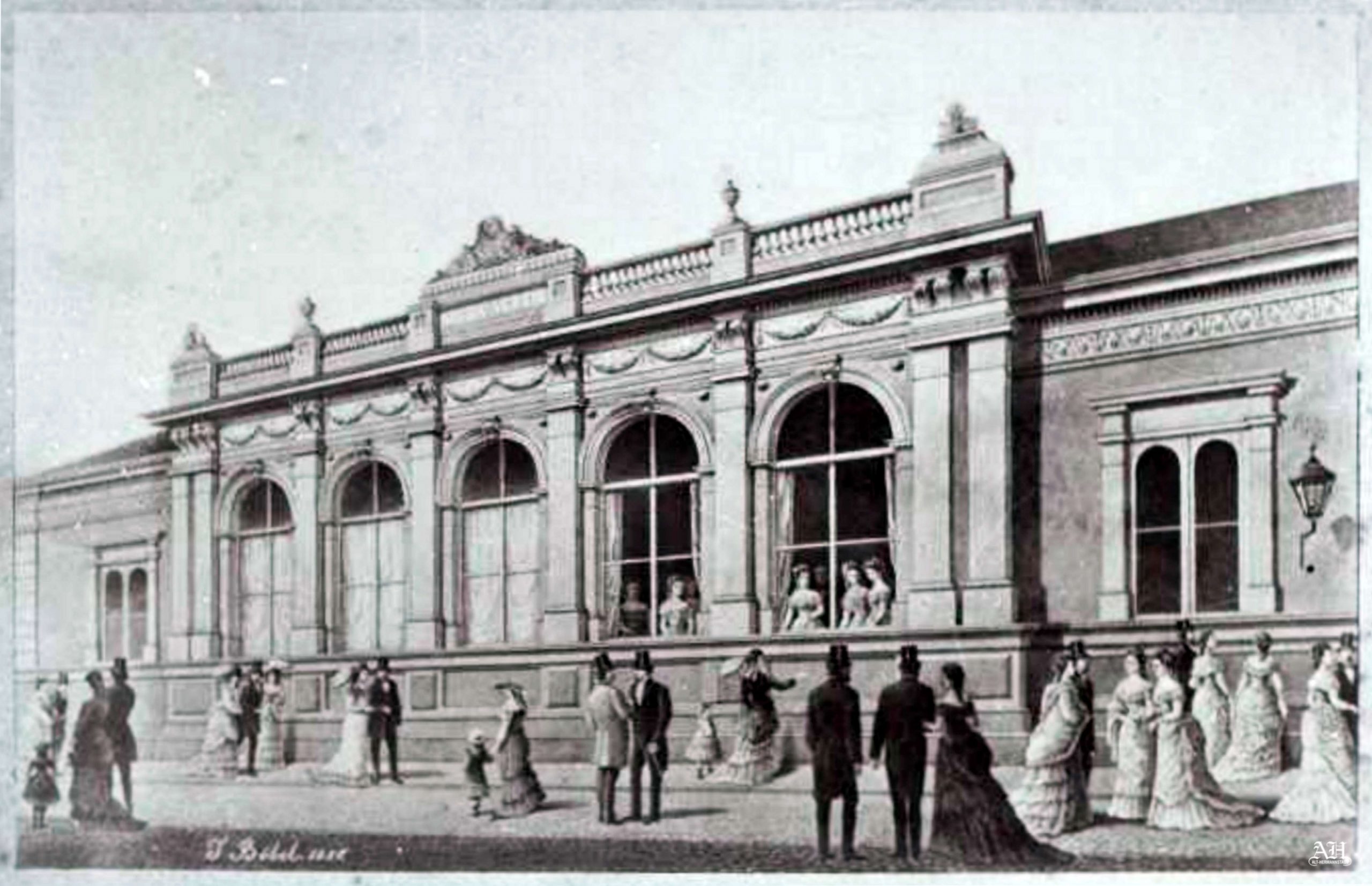 Pictura în care apare clădirea Societății Muzicale sibiene „Musikverein” a fost realizată de artistul sibian Johann Böbel (1824-1887) la începutul anilor 1880. Ilustrație din arhiva grupului de Facebook Alt-Hermannstadt.„Hermania