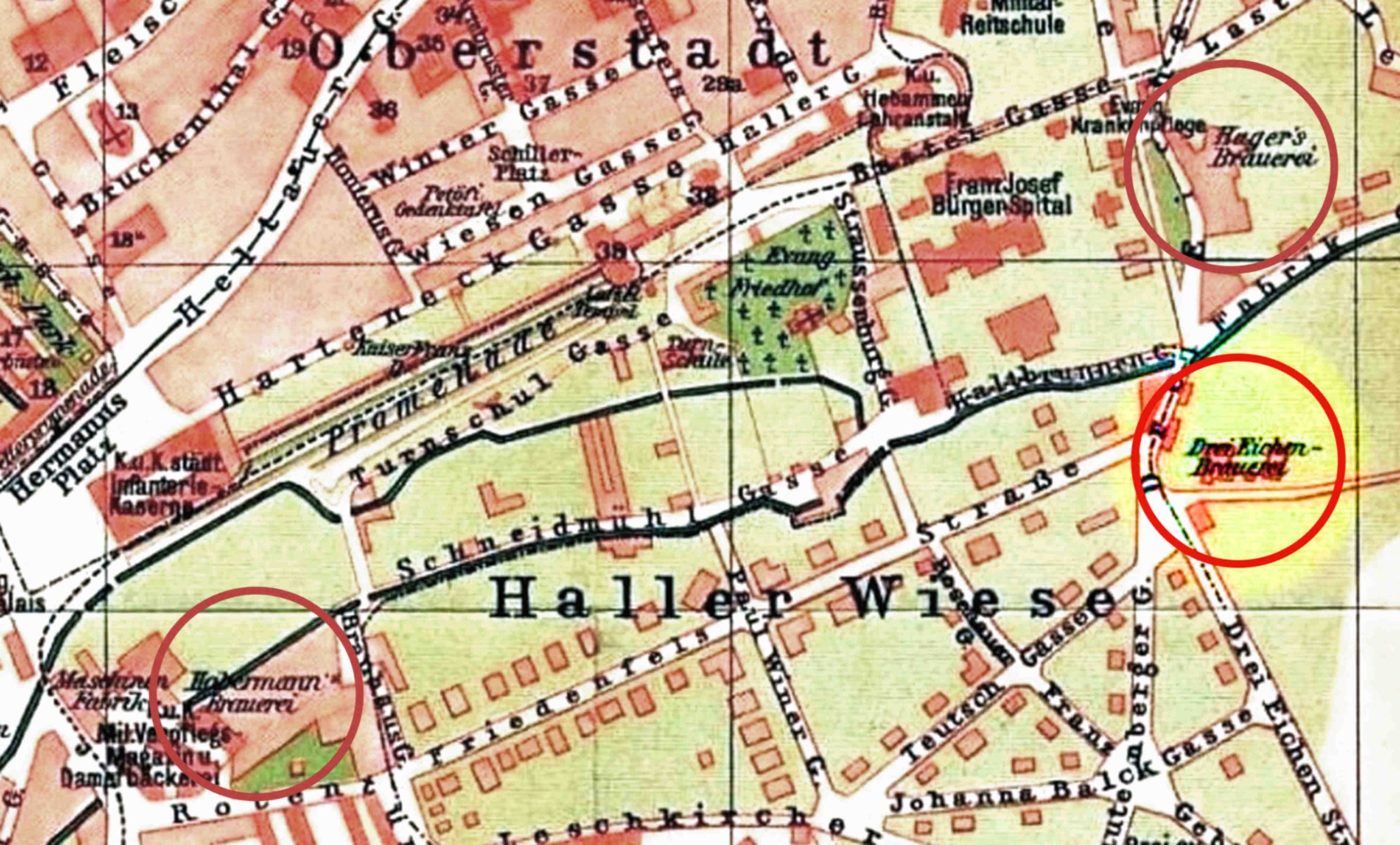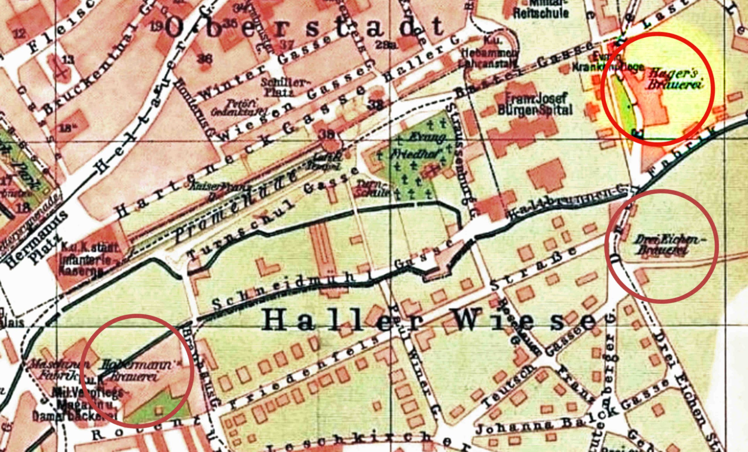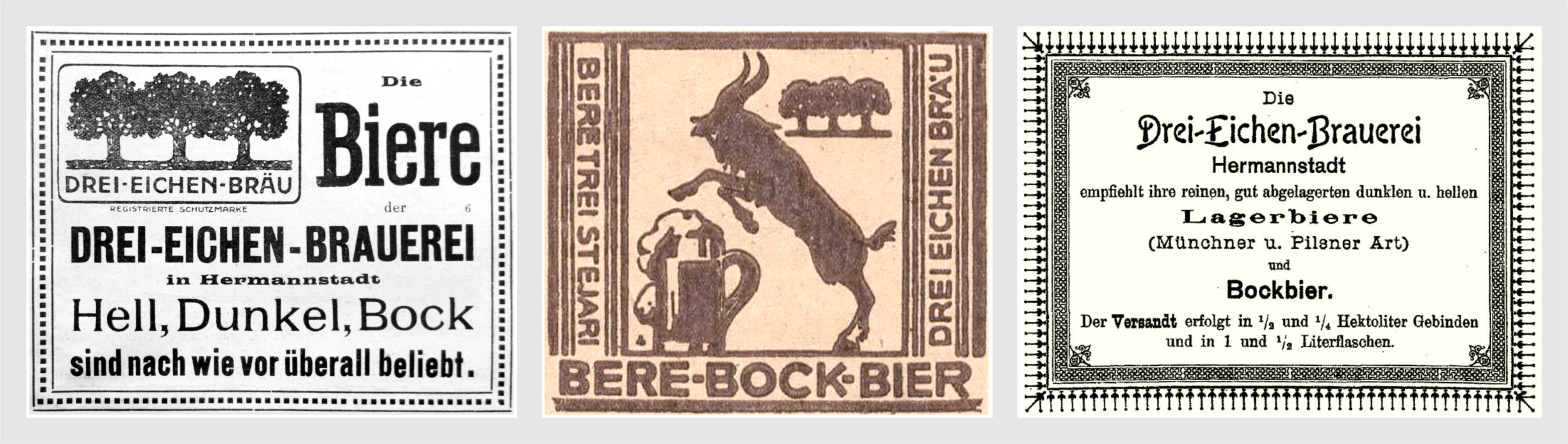 (sursa ilustrațiilor: arhiva grupului de Facebook Alt-Hermannstadt)În harta orașului din 1914 S.K.V. apar trei fabrici de bere în partea sudică a orașului Sibiu: Fabrica de Bere Habermann // Habermann Brauerei, Fabrica de Bere Hager // Hager´s Brauarei și Fabrica de Bere Trei Stejari // Drei Eichen Brauerei. Fabricile de bere erau alimentate cu apa curgătoare din Pârâul Trinkbach (Hager și Trei Stejari) și canalul inferior Schewis (Habermann). Denumirea Trinkbach provine de la faptul că pârâul a fost folosit ca sursă de apă potabilă: Trinkbach înseamnă pârâu cu apa de băut (potabilă).
